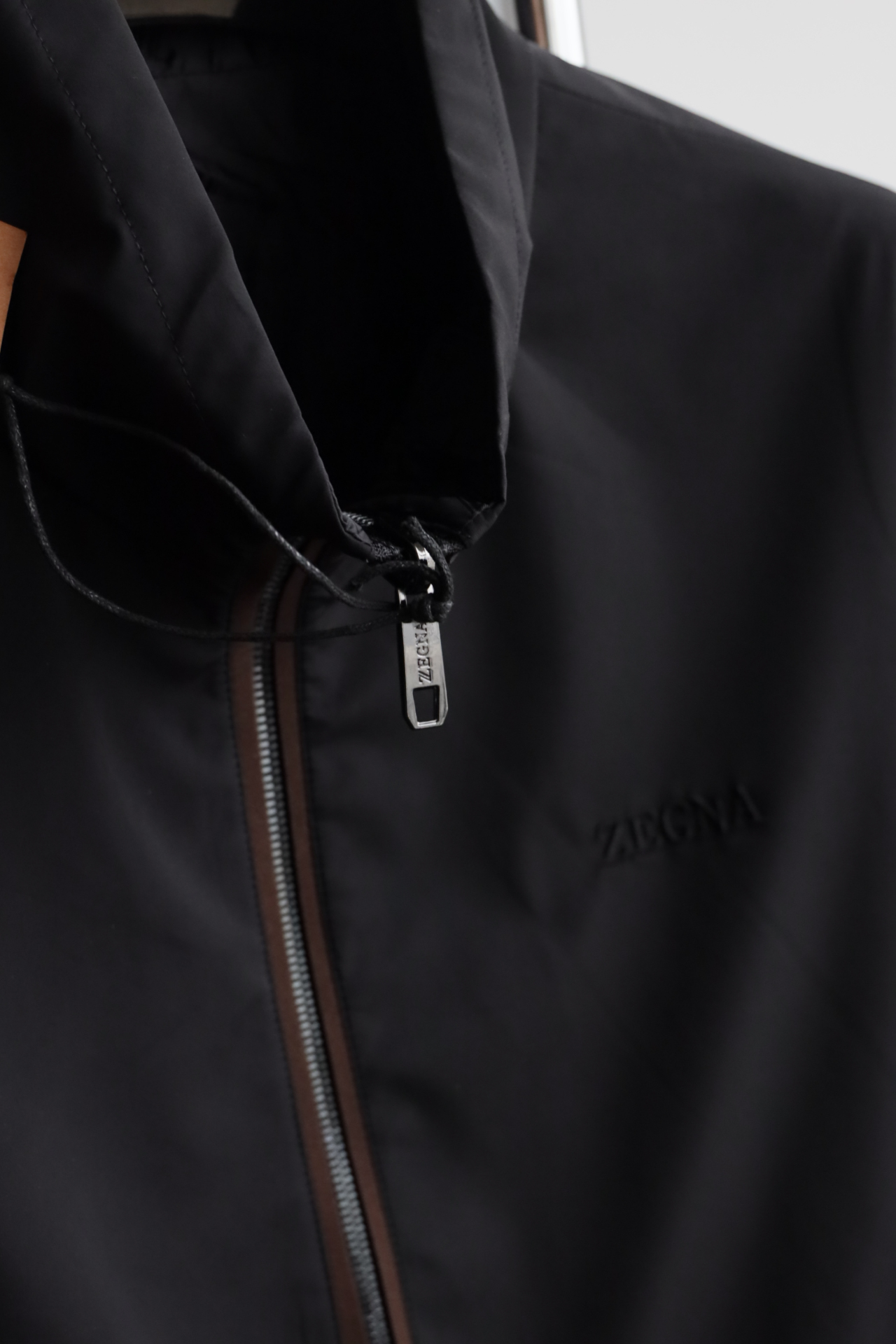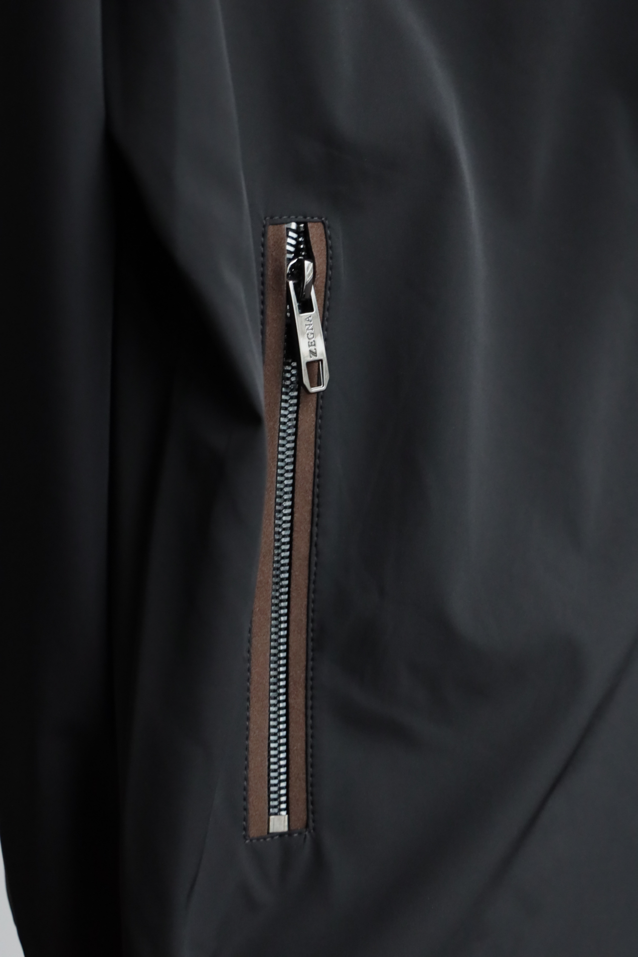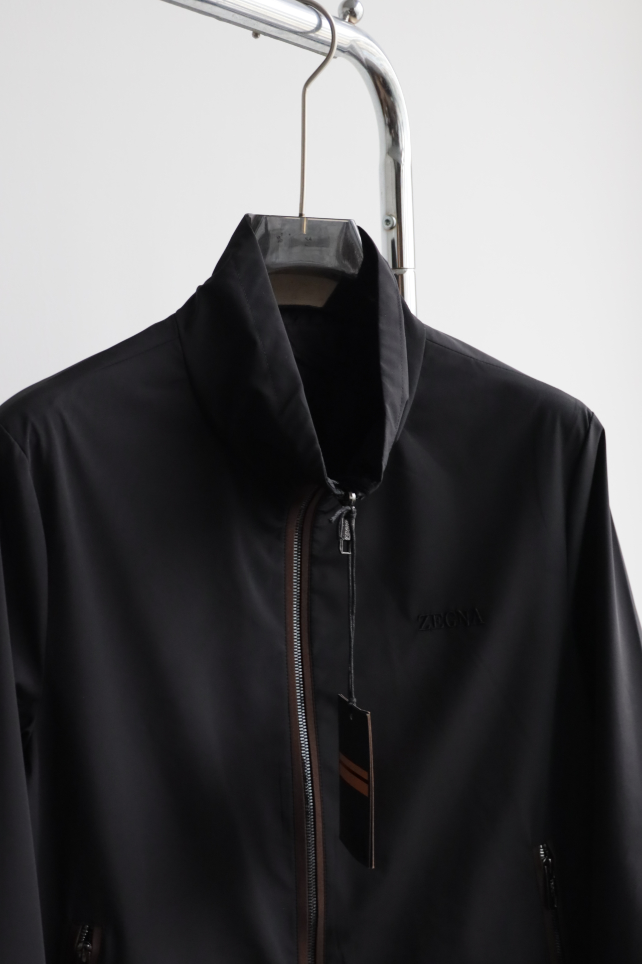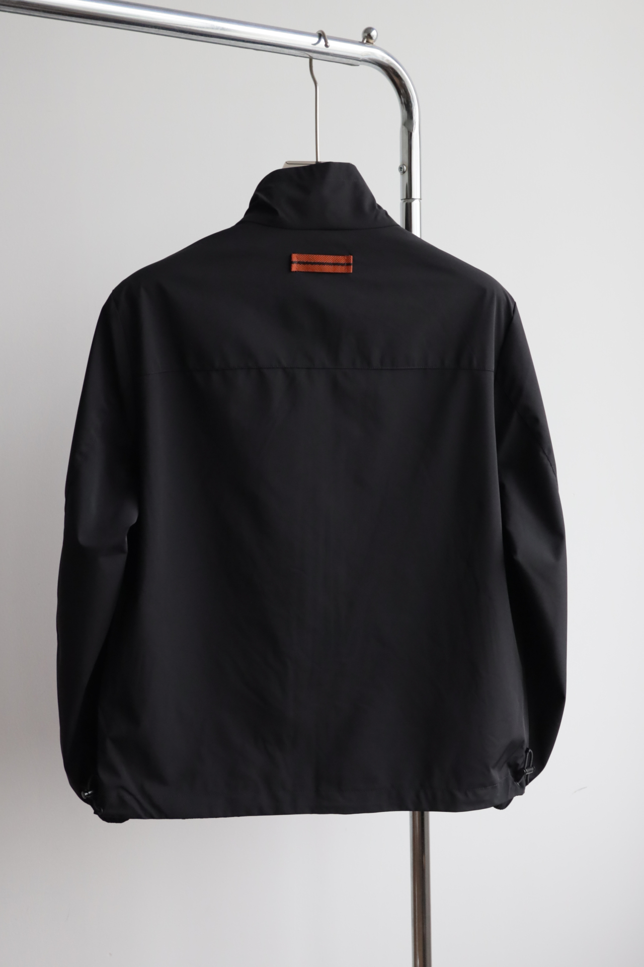 胸口同色系字母刺绣,后颈招牌配色织带装饰,两侧插袋带拉链开合
