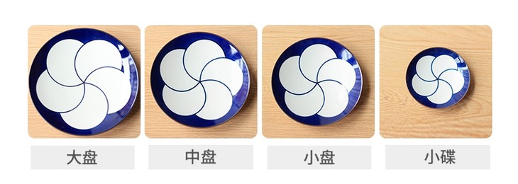 圆盘分为四个尺寸,小碟可以作为酱料蘸碟,小盘可以盛放小块蛋糕,中盘可盛放小分量的菜品,大盘可盛放大分量的菜品