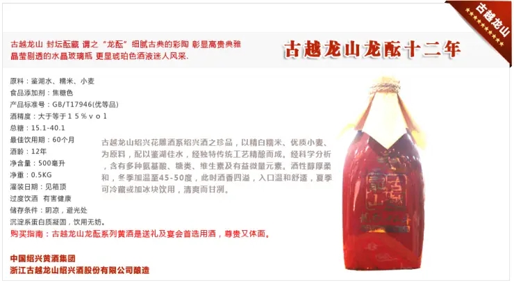 古越龙山龙酝十二年陈酿花雕酒 500ml 15.0%VOL
