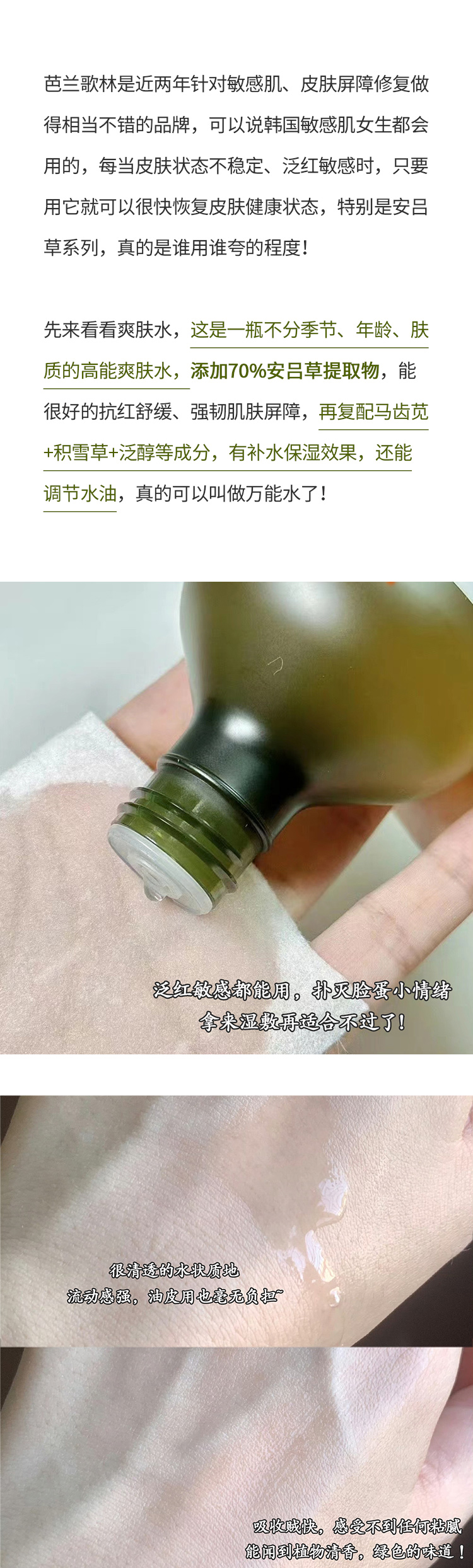 【上海本仓发】芭兰歌林 安吕草系列 韩国进口 敏感肌都爱用,舒缓修护三剑客!高浓度安吕草植萃,保湿/强韧肌肤屏障都很优秀,复配多重植物精粹+舒缓成分,快速解决各种皮肤受损问题,堪称“急救小能手”!
