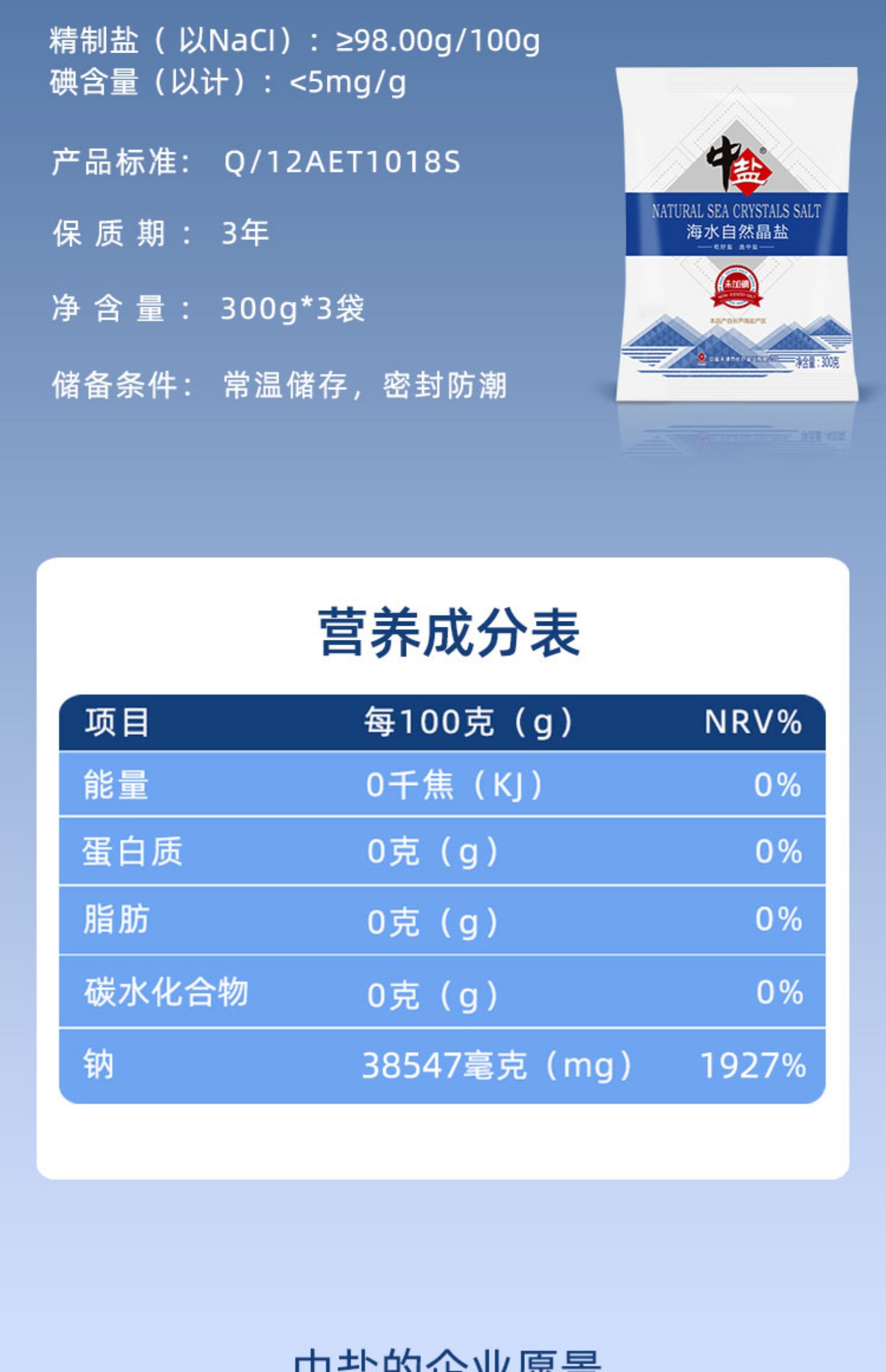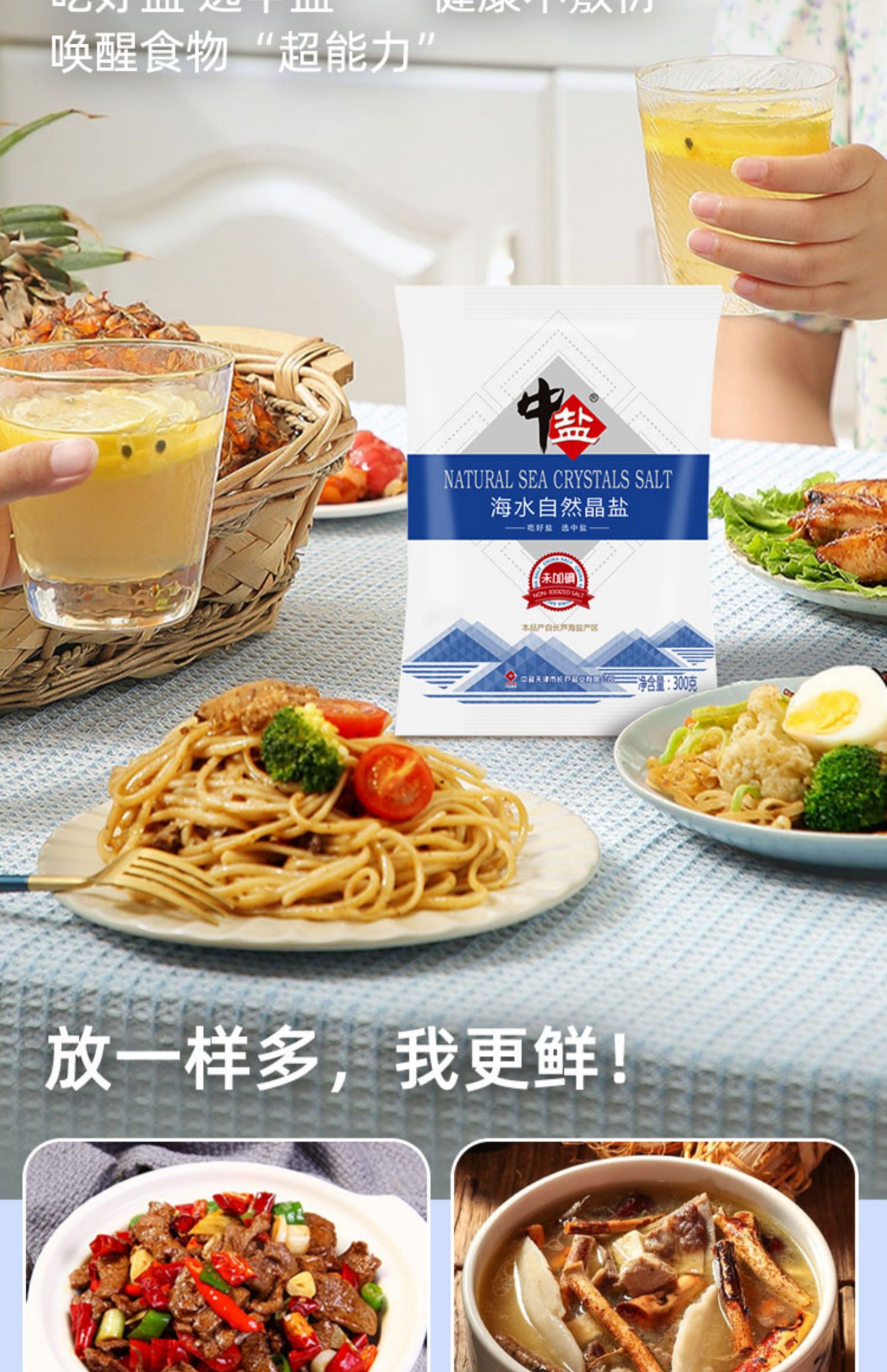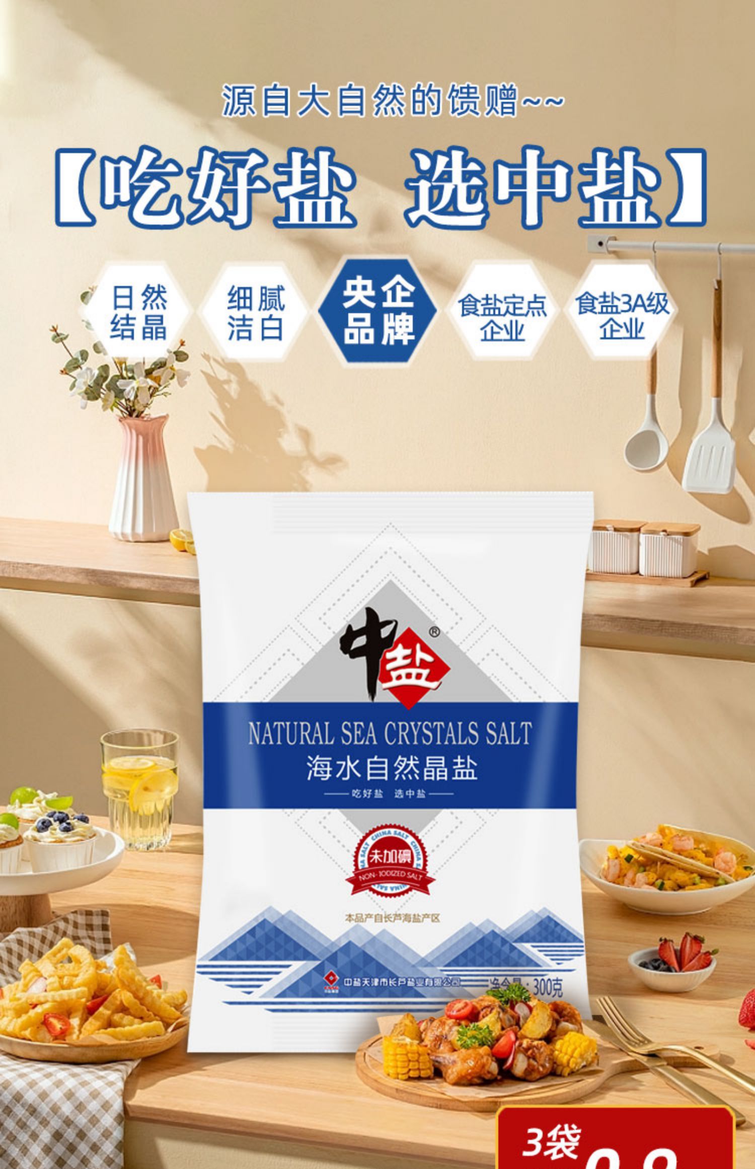 中盐无碘海水自然晶盐300g*8袋