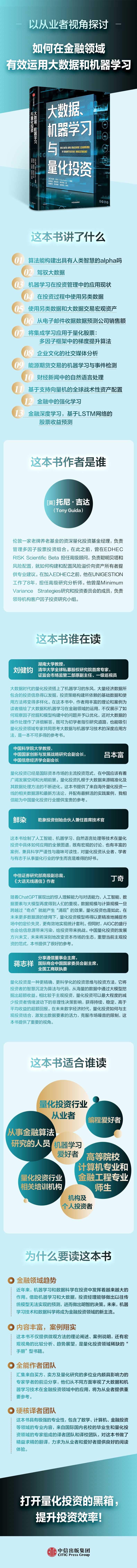 这本书绘制了人工智能、机器学习、自然语言处理等技术在量化投资中具体如何应用的全景图谱,既有宏观的讨论,也有丰富的案例,兼具科学严谨性与趣味可读性,对量化投资从业者、学者与有志于从事量化行业的学生而言是难得的好书。