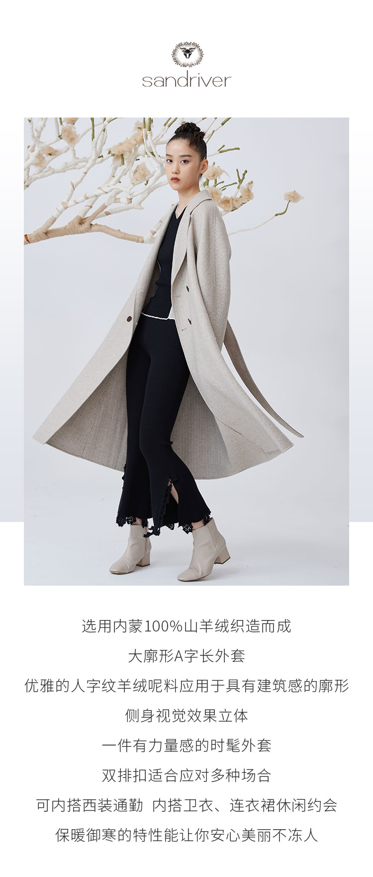 历年在巴黎时装周亮相,享誉世界的艺术羊绒品牌[Sandriver 沙涓]由羊绒布道者郭秀玲女士创立。阿拉善自有牧场纯种羔羊绒,日本国宝设计师小筱顺子,上海自有基地精工细作。承载羊绒情怀,坚持匠人品质。