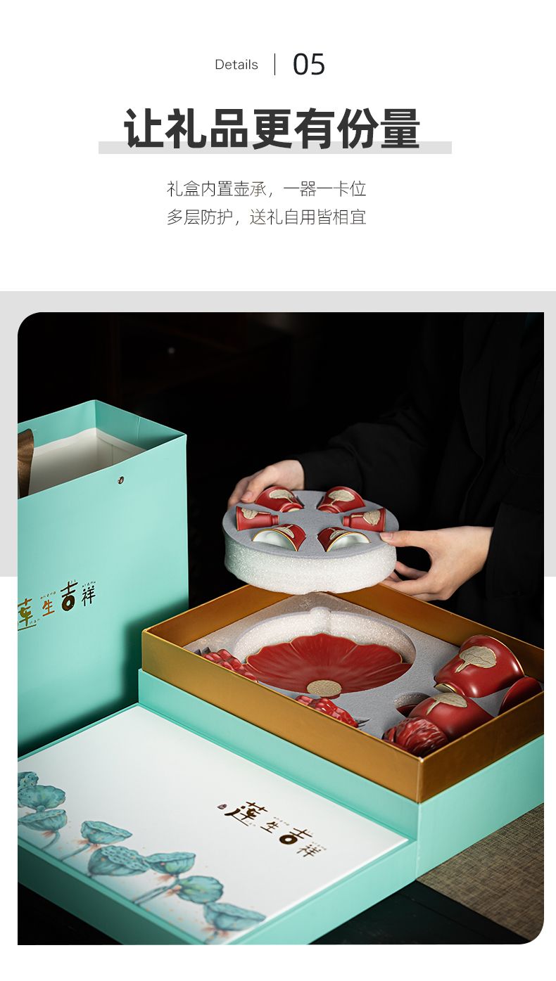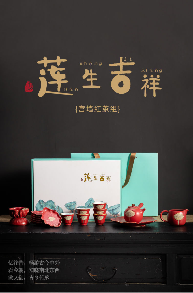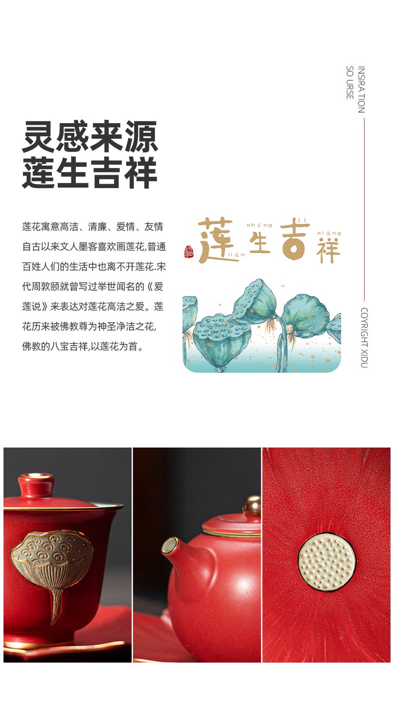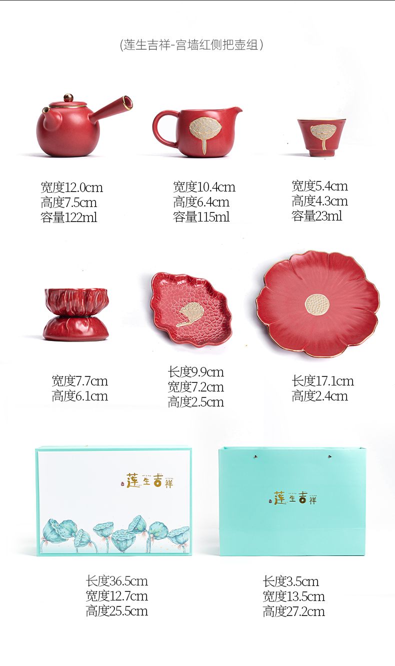 莲生吉祥宫墙红盖碗侧把壶功夫茶具套组复古家用礼盒装商务礼品