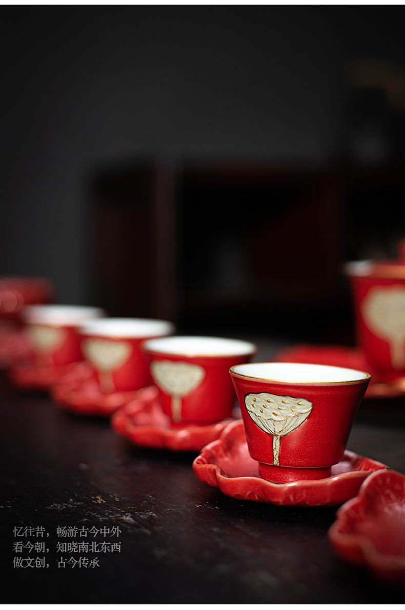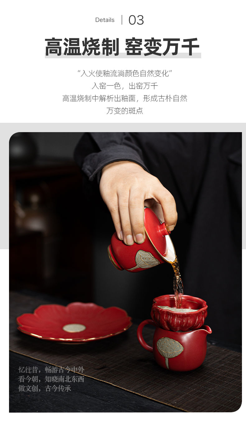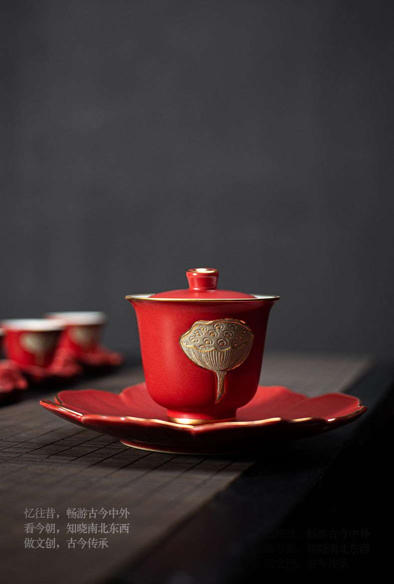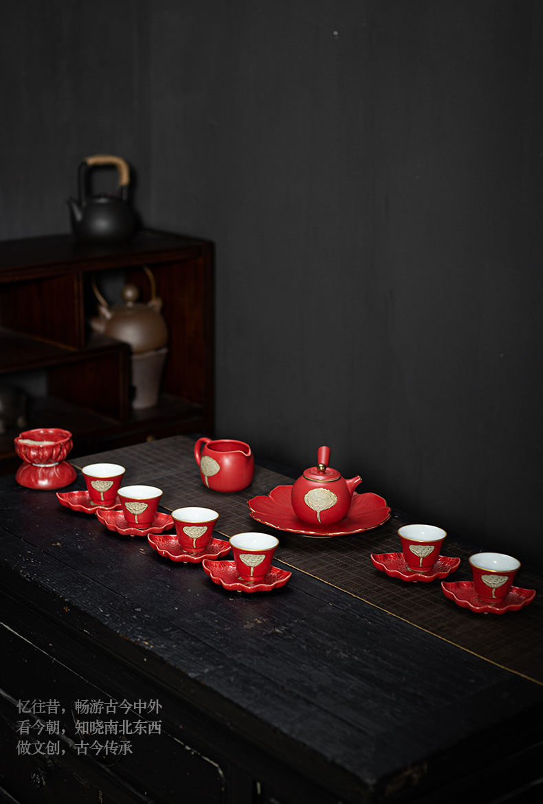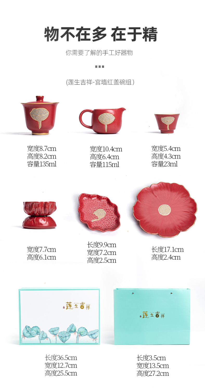 莲生吉祥宫墙红盖碗侧把壶功夫茶具套组复古家用礼盒装商务礼品