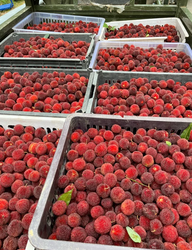 清晨5点,农人上山采摘,11点下山,把杨梅送到我们食品园,一个小时的路途,车不能开快,杨梅太娇嫩,随便一抖,杨梅都会受伤。