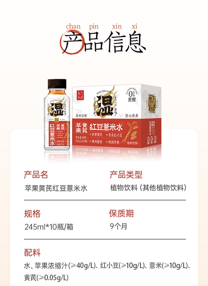 苹果黄芪红豆薏米水,用的是苹果、黄芪、赤小豆、薏米等,无多余添加,专为现代人设计,旨在帮助身体去除湿气、补养气血。薏米,健脾去湿;赤小豆,利水消肿;苹果,养胃补气血;黄芪则补中固表。通过十二道工序匠心熬制,整个制作过程更是拒绝蔗糖、香精、色素、防腐剂,滴滴精华,健康无负担。