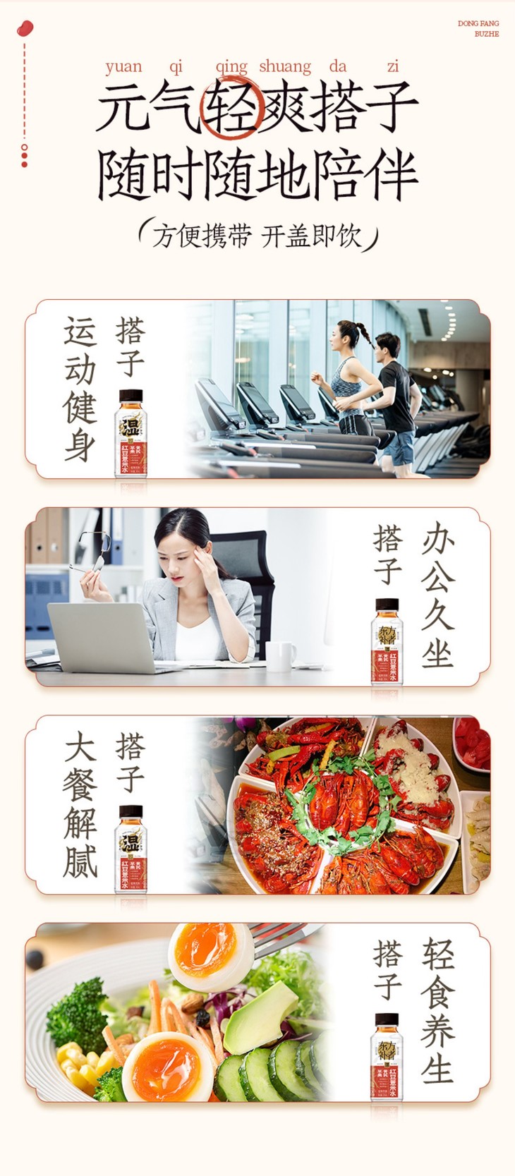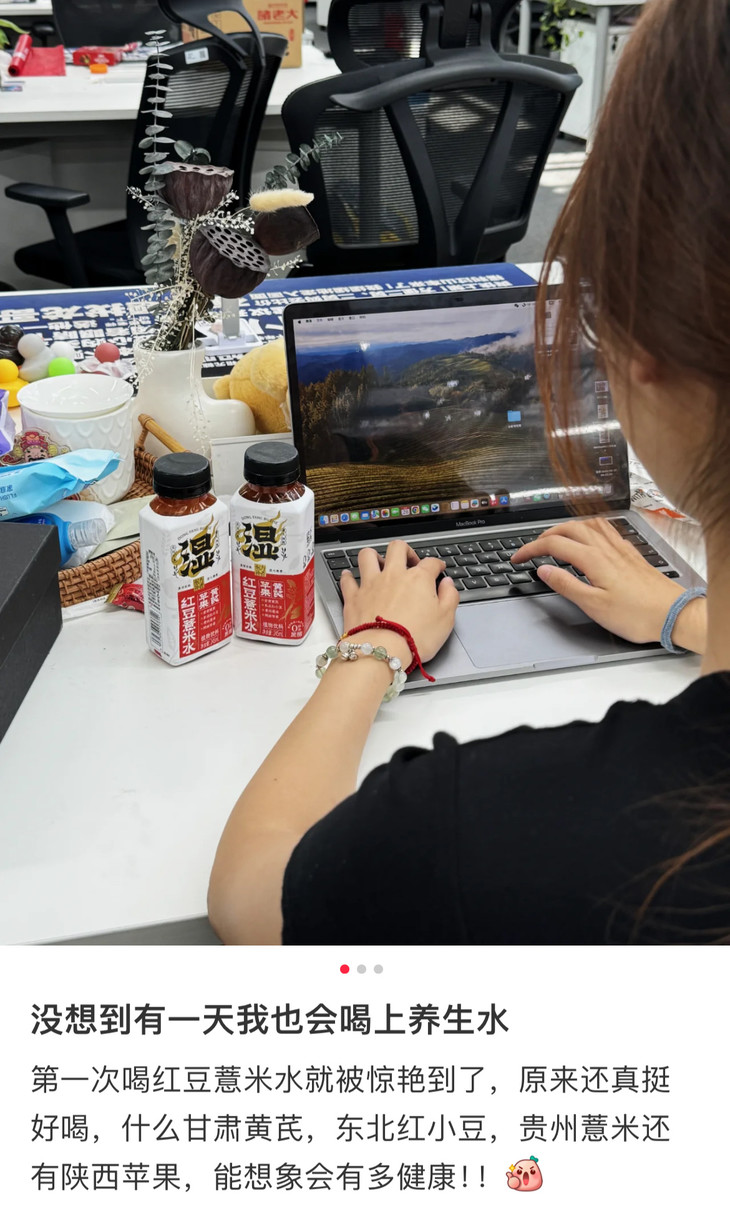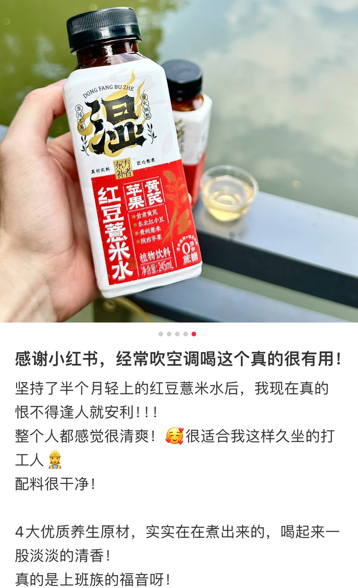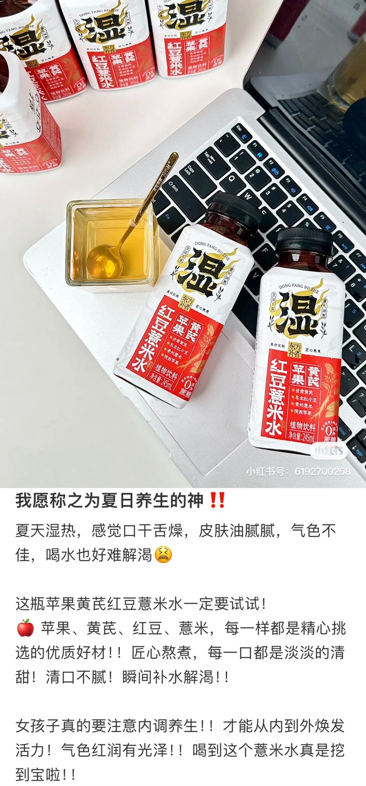 苹果黄芪红豆薏米水,每份10瓶,小巧便携,不用自己炖煮,开盖就能吨吨吨!休息间隙,随手开一瓶,赤小豆的醇厚、苹果的酸甜交织在一起,还有黄芪与薏米的淡淡香气,酸甜适口,清爽不油腻!特别适合长时间吹空调、久坐不动,又爱吃油腻辛辣食物的老粉。手脚冰凉、经期不适、胃部胀痛,也可以加热暖暖!重点是,热量很低哦,与一根黄瓜相当,放下手中的奶茶,换上这瓶养生水吧!