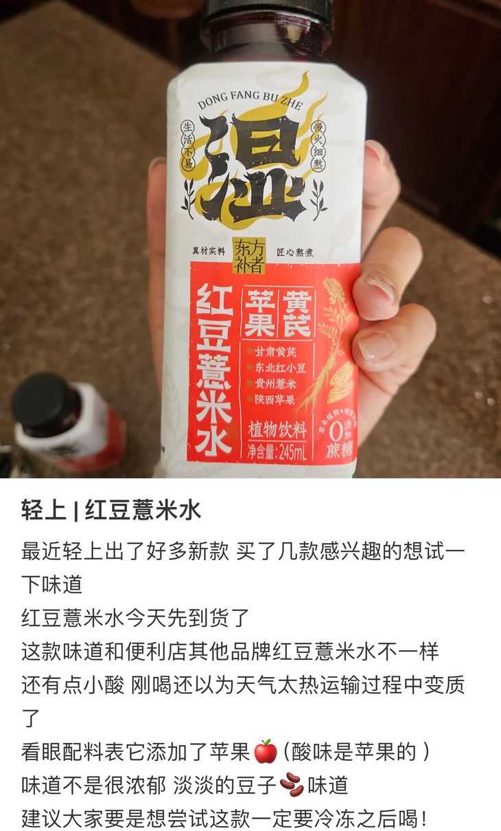 上点适合中国宝宝的养生小饮品!轻上LIGHTUP是广东椰泰饮料集团旗下的子品牌,之前有上过他家的油柑西梅酸奶,很是不错,这次是苹果黄芪红豆薏米水,祛湿、减重、素颜美,还有中式刮油解腻的陈皮荷叶乌梅山楂饮,也可喝喝!不用自己繁琐熬煮,现开现喝,内调外养,轻松养生!当然,味道不是小甜水,偏凉茶系,加热加冰也都可,我是蛮喜欢的,大口喝也没什么负罪感!