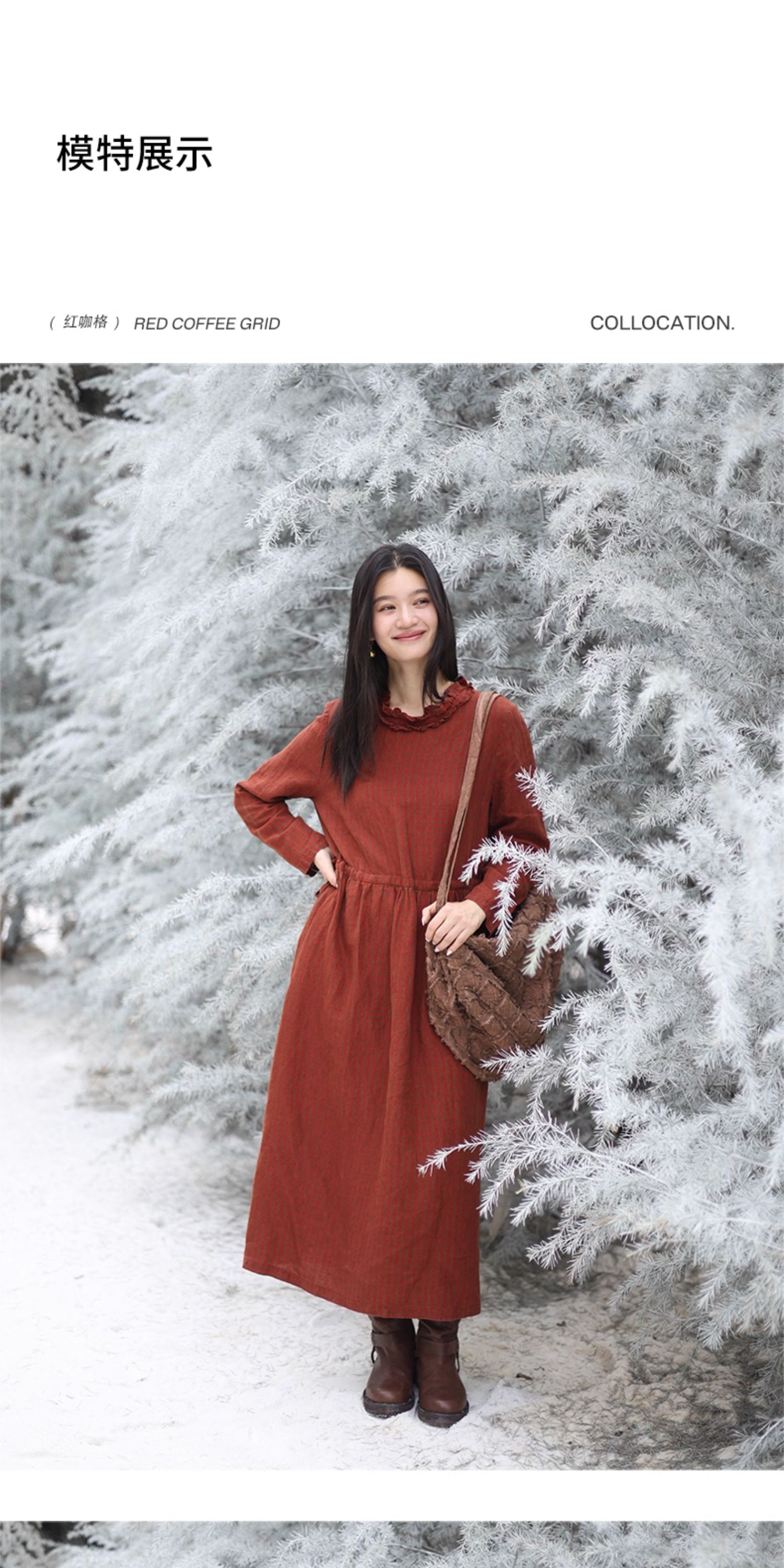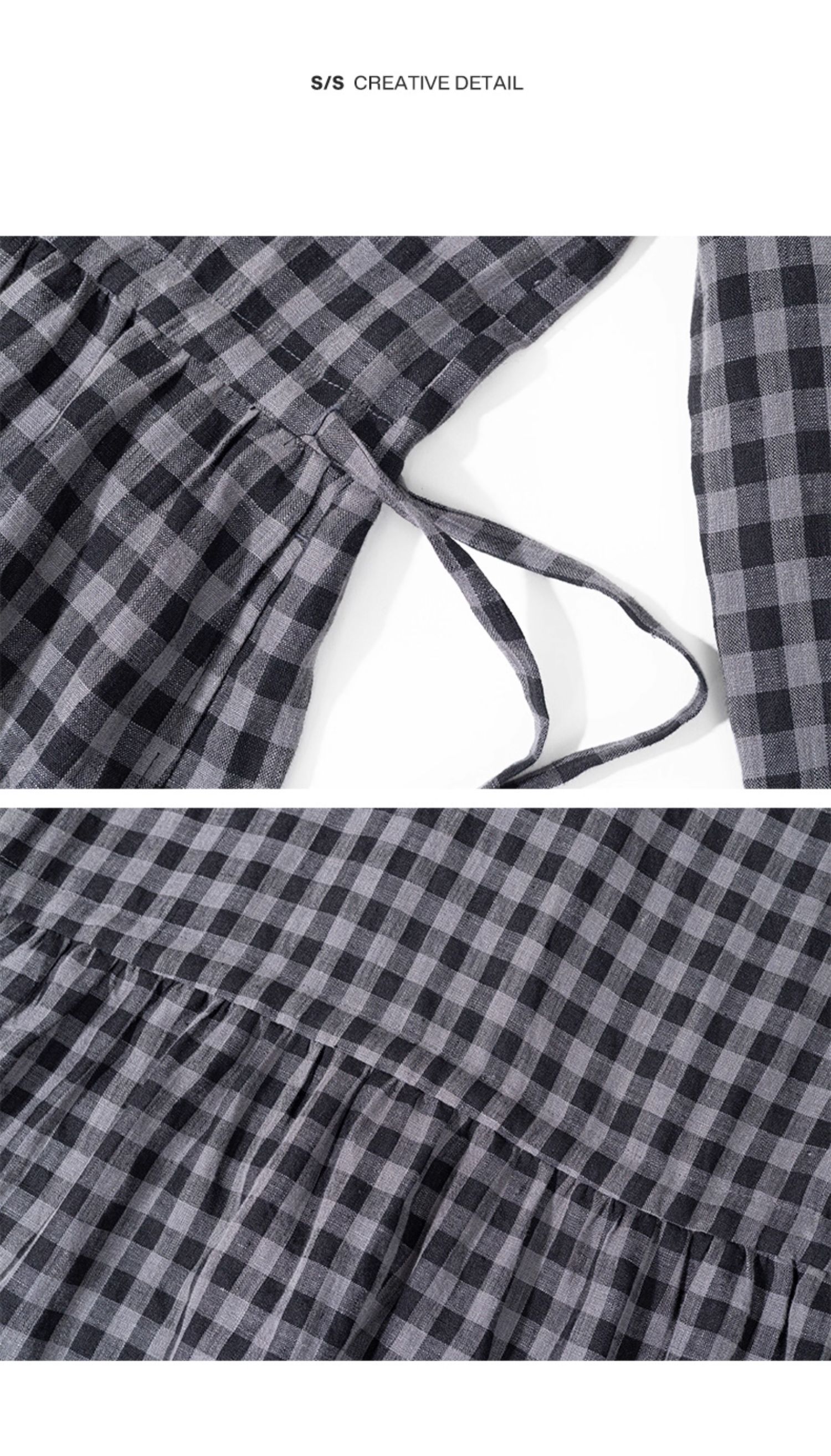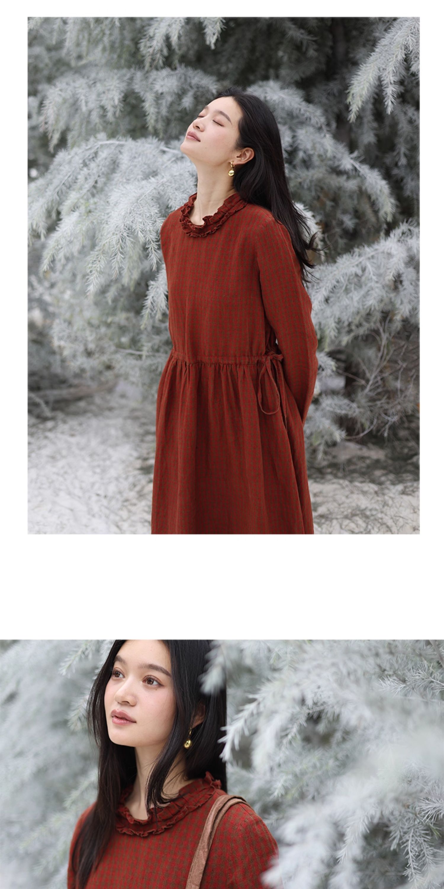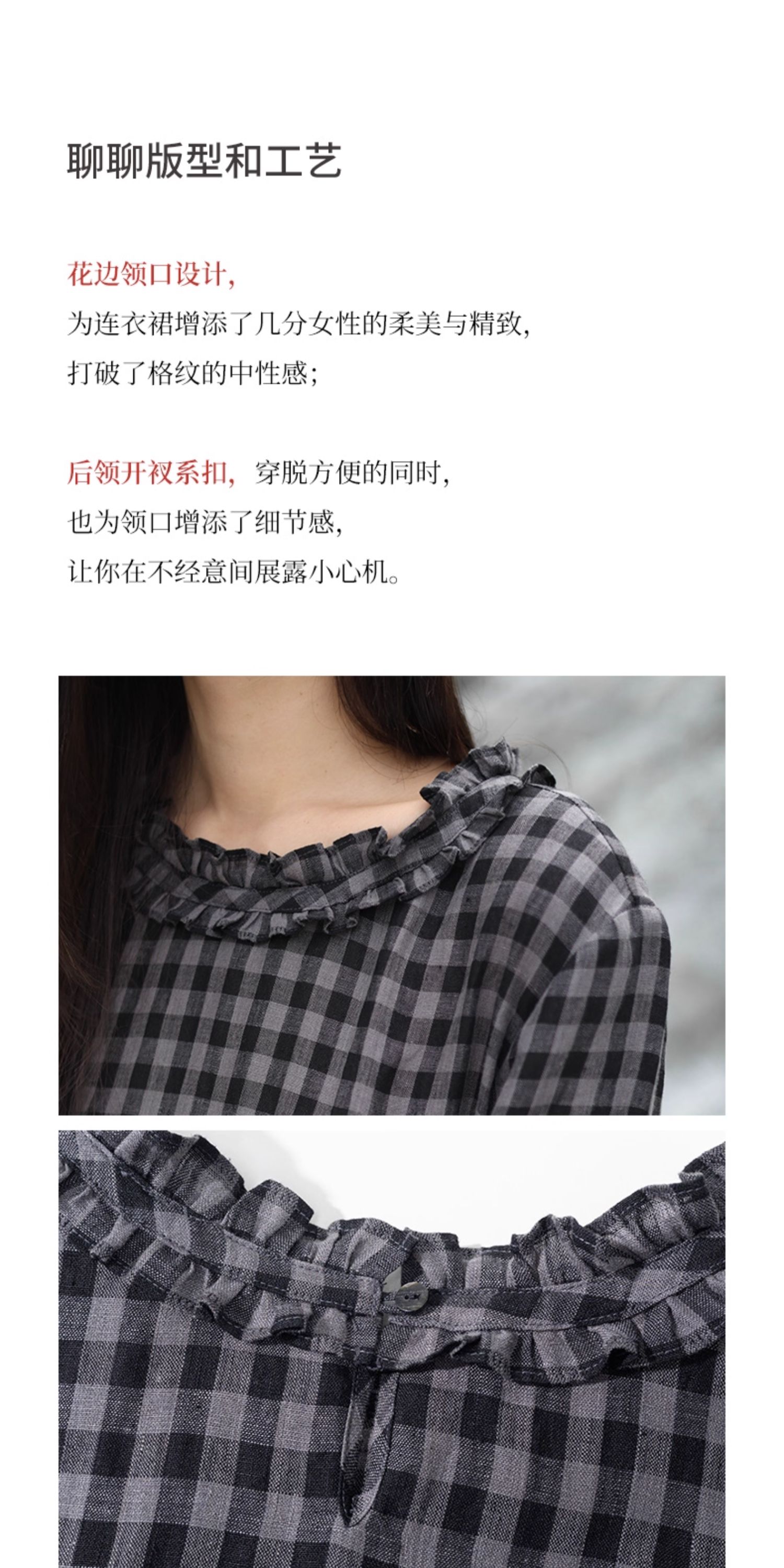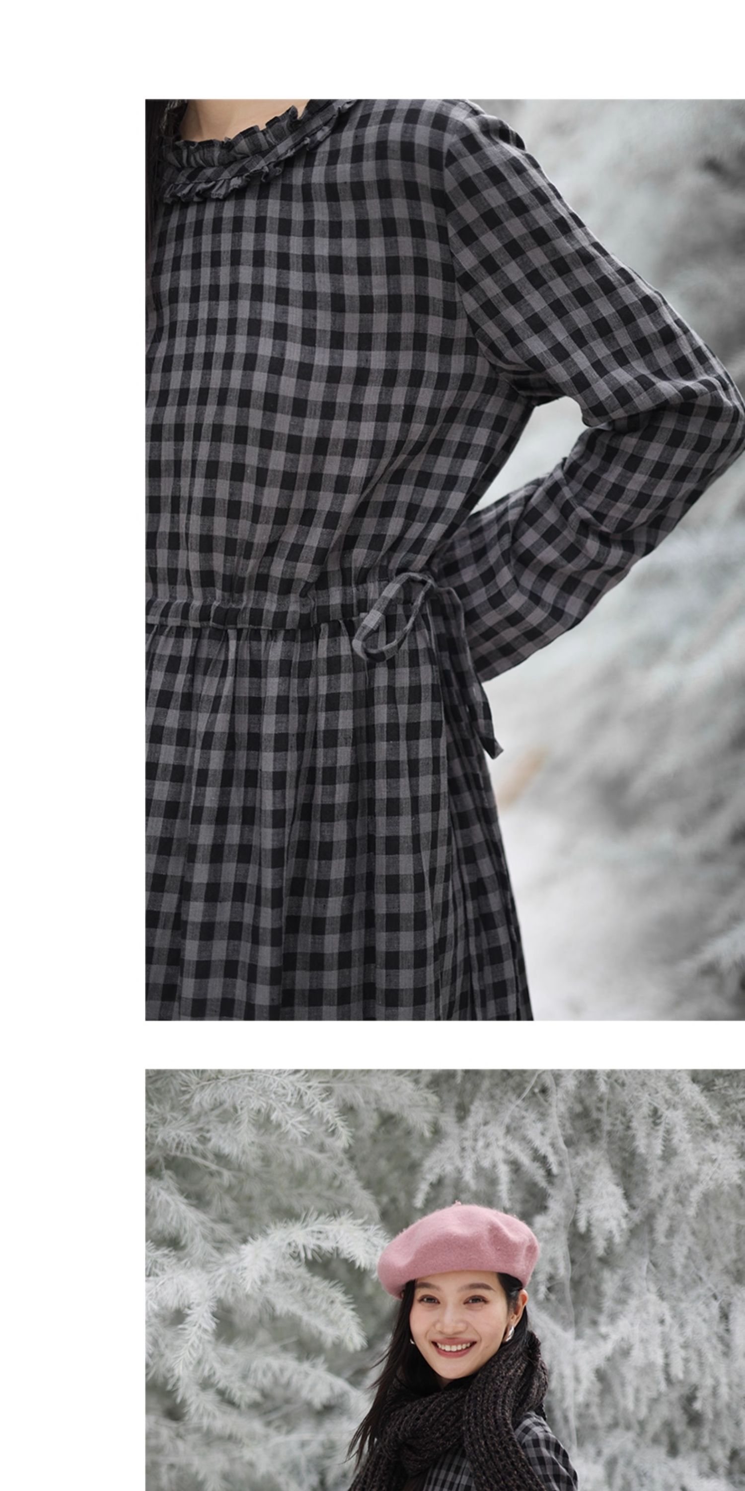特绽放728朵/影格·色织亚麻格纹花边领腰部系带收腰长袖连衣裙女
