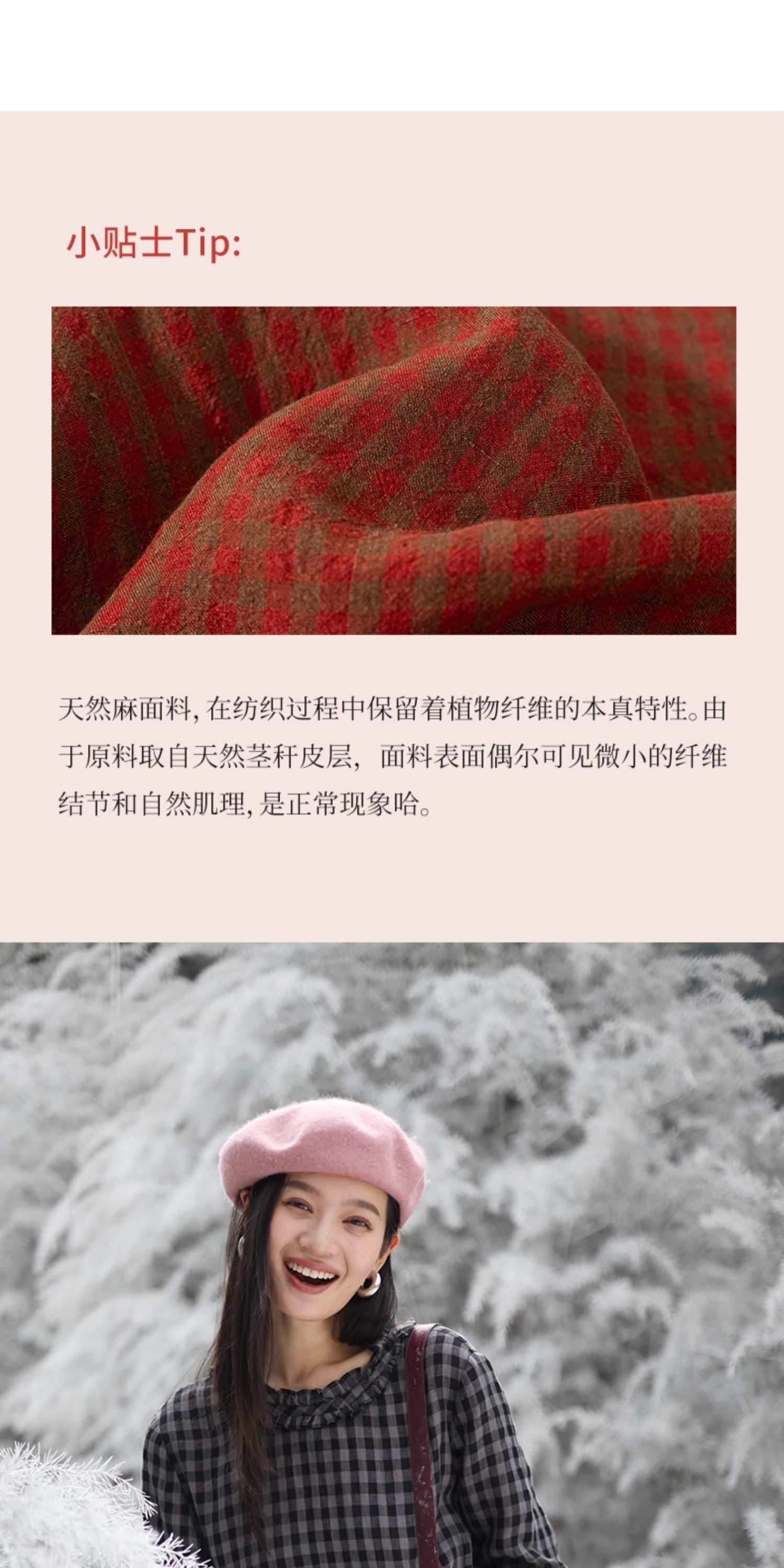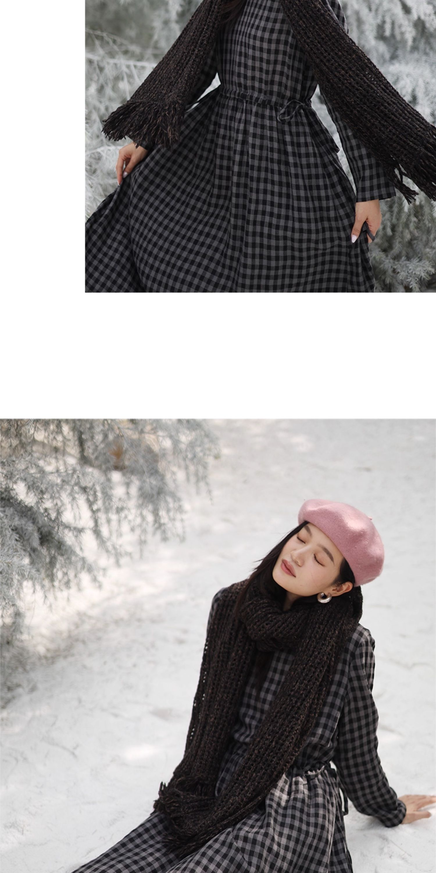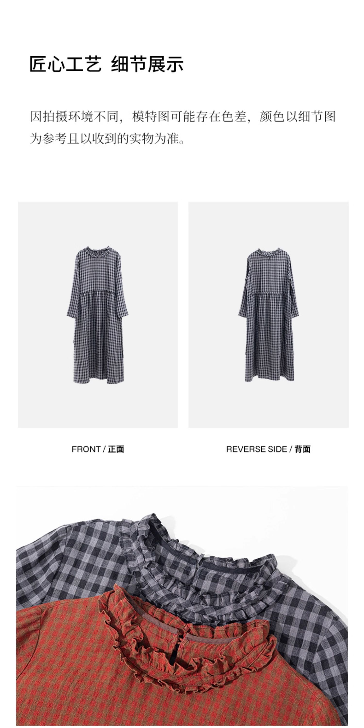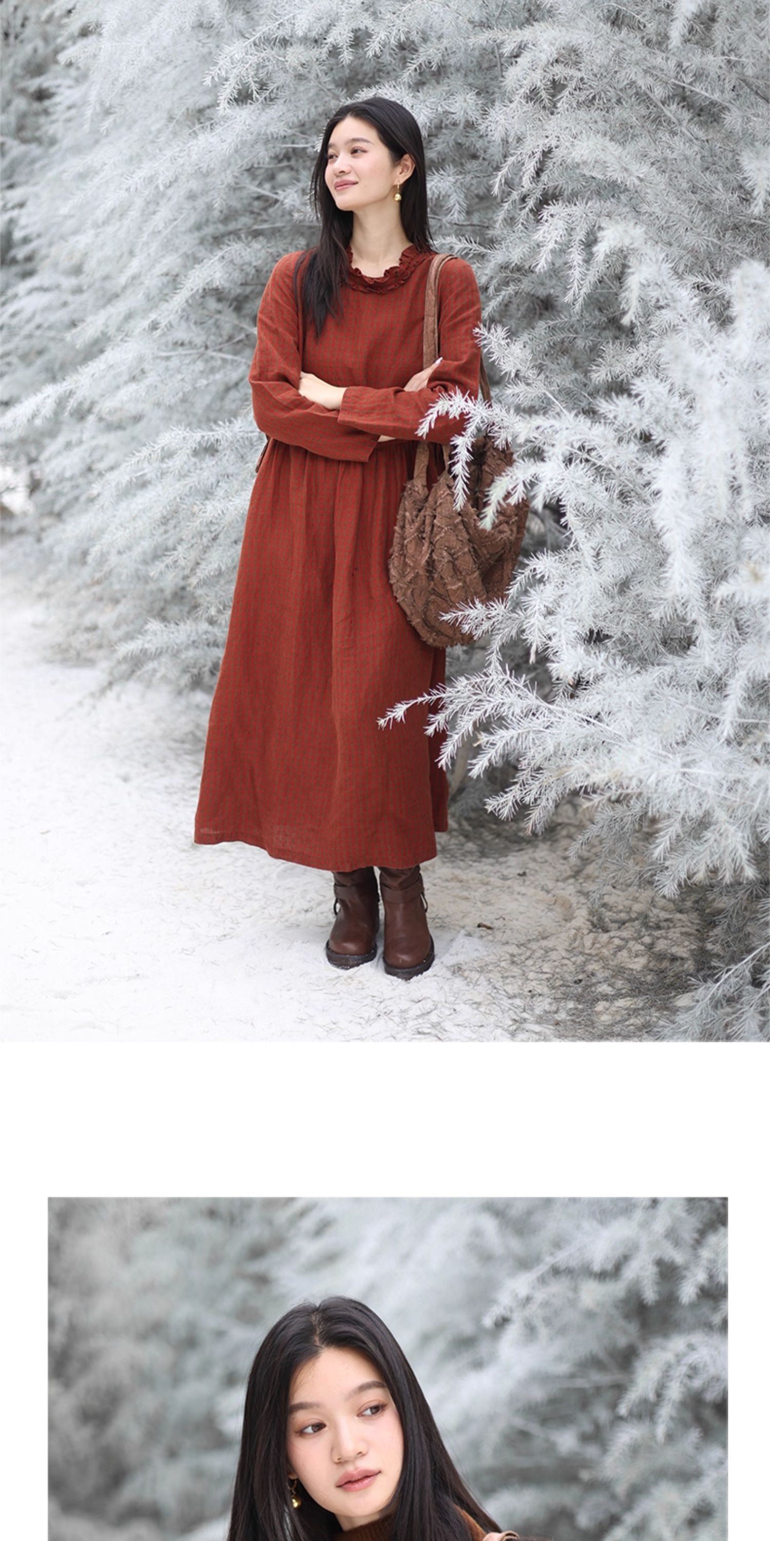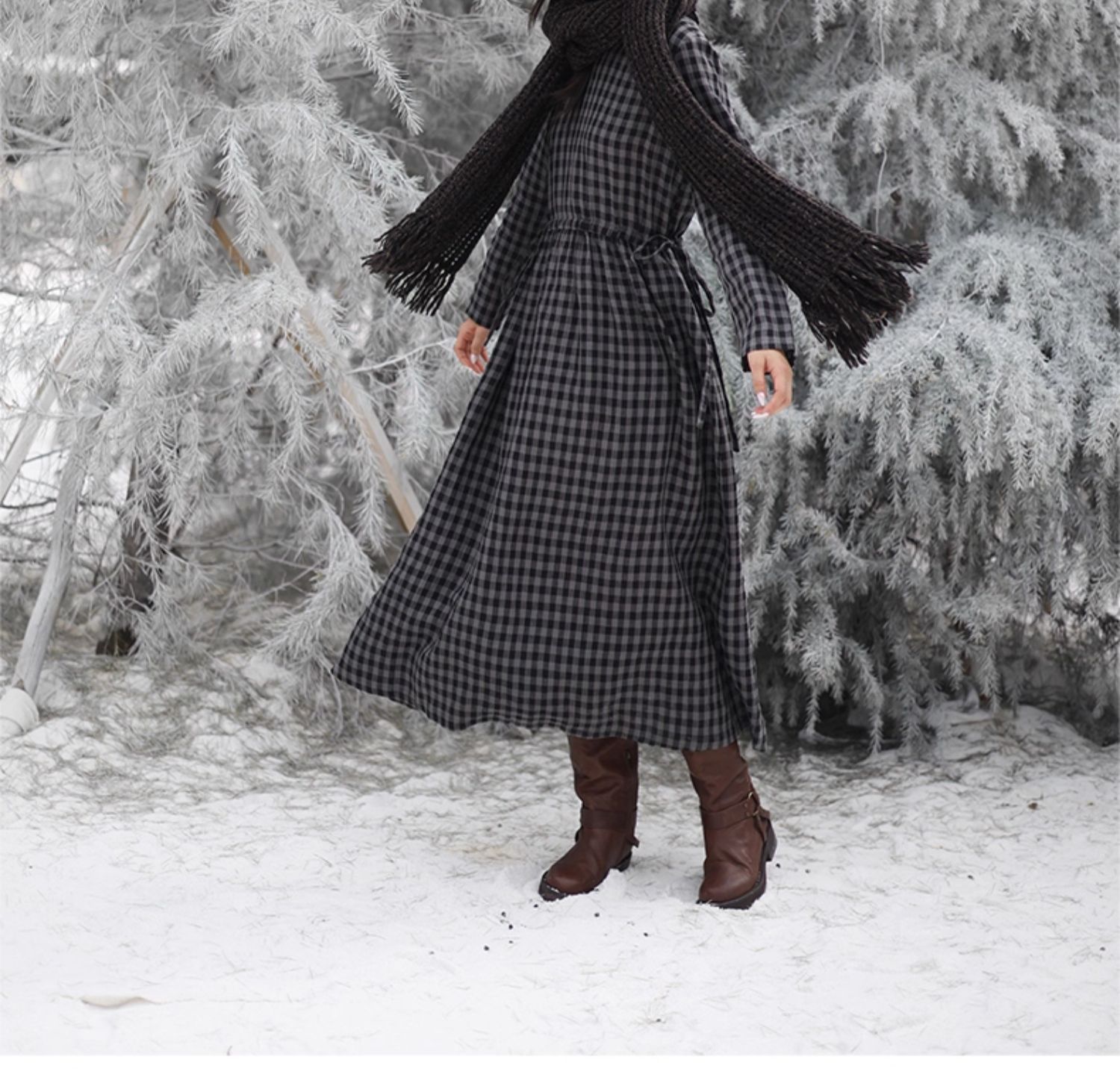 特绽放728朵/影格·色织亚麻格纹花边领腰部系带收腰长袖连衣裙女