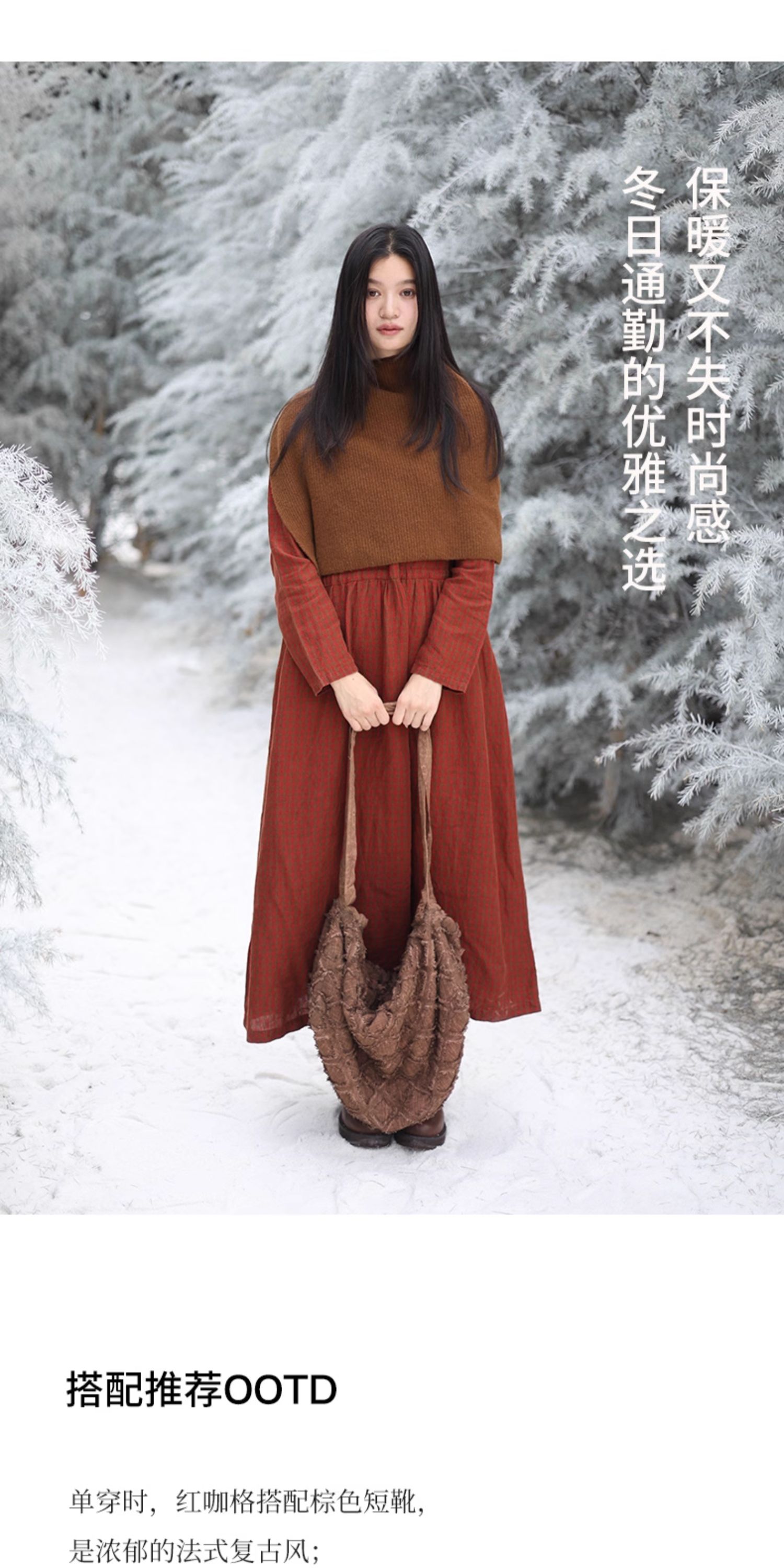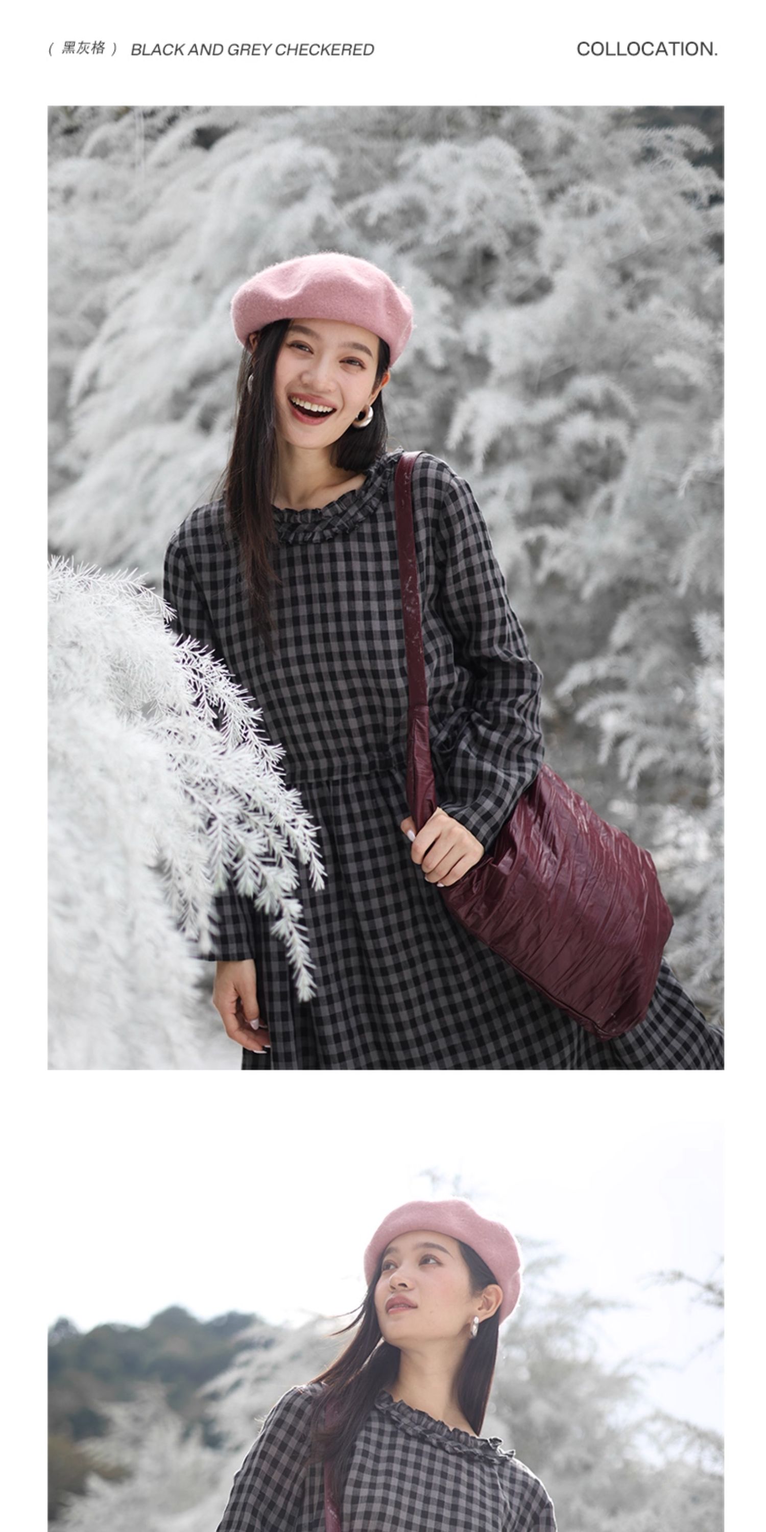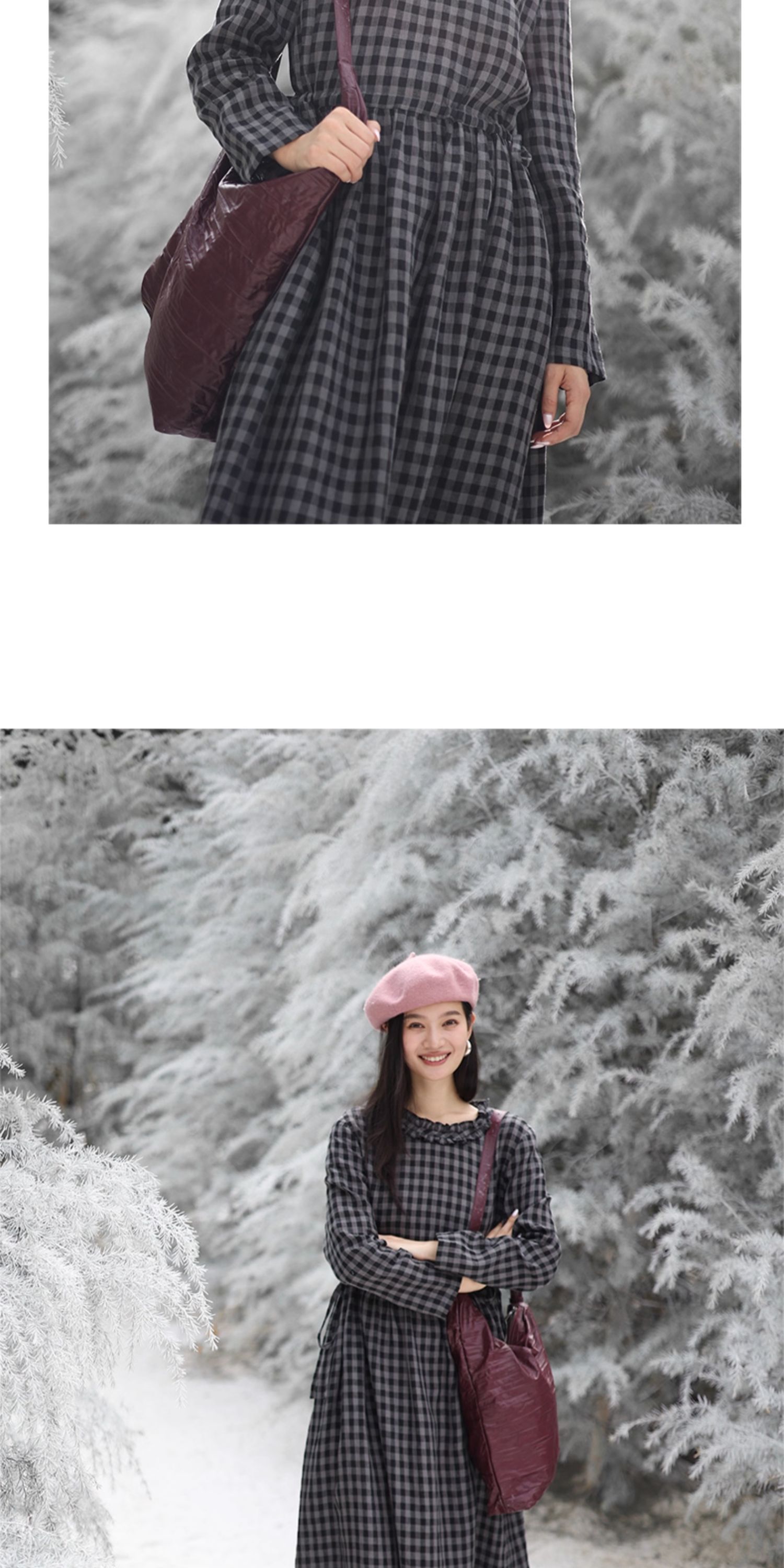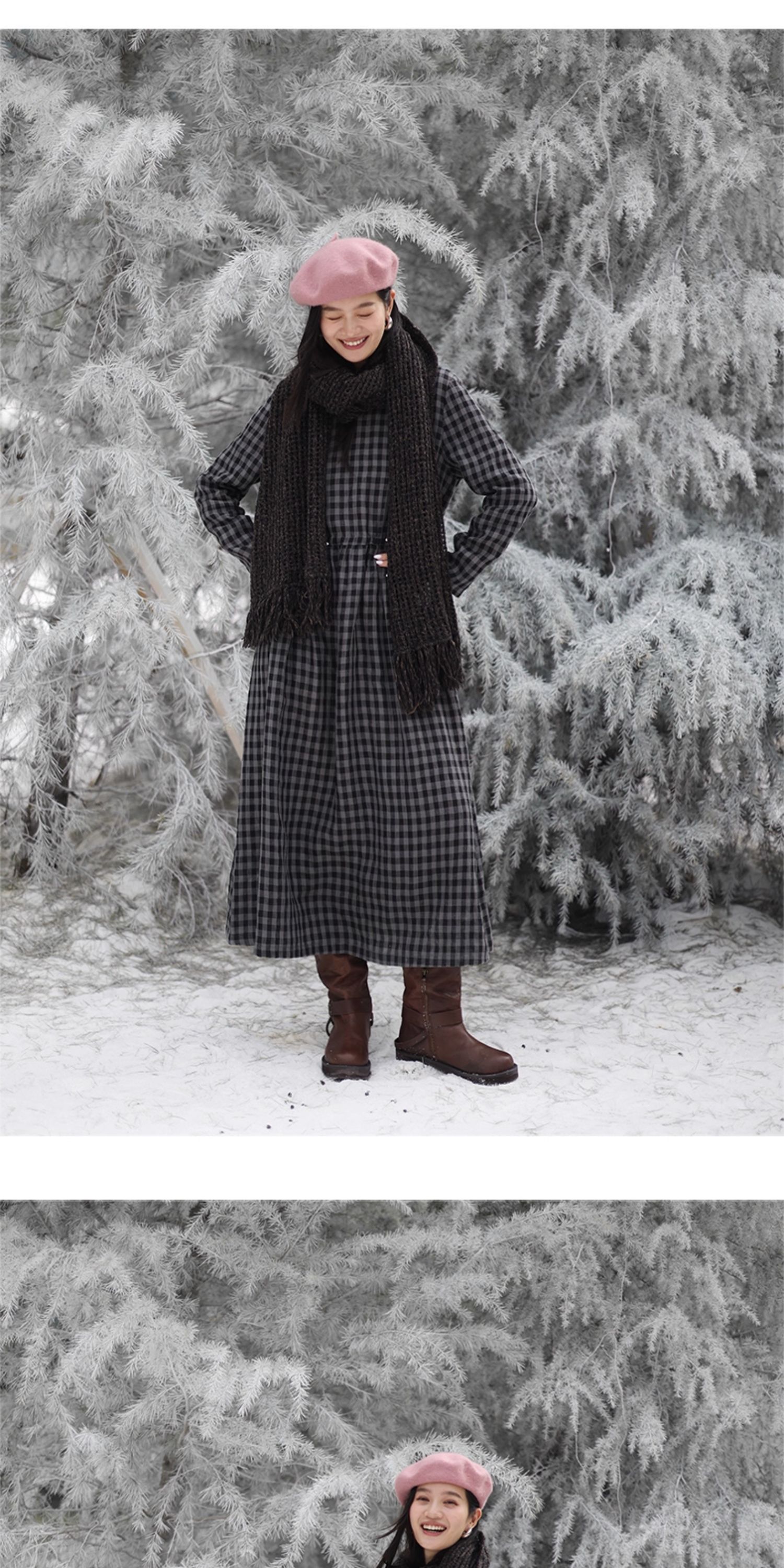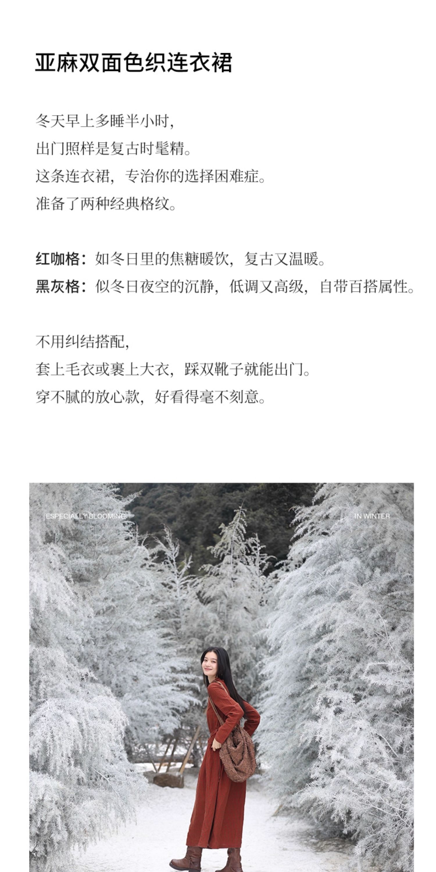 特绽放728朵/影格·色织亚麻格纹花边领腰部系带收腰长袖连衣裙女