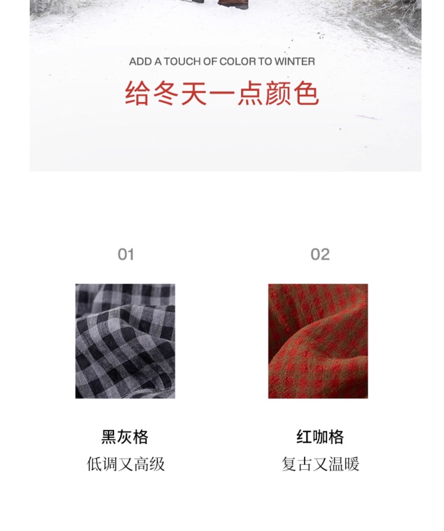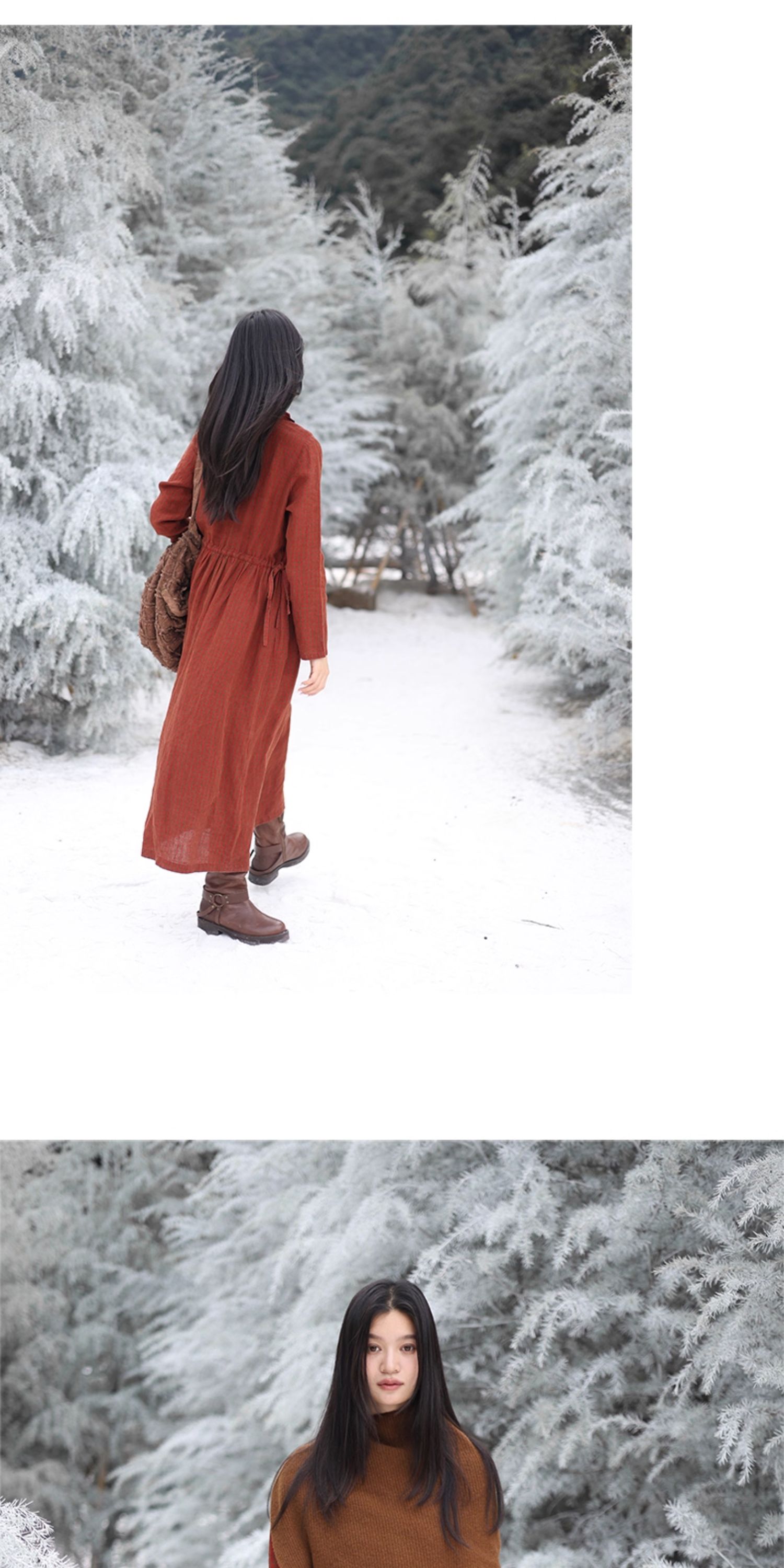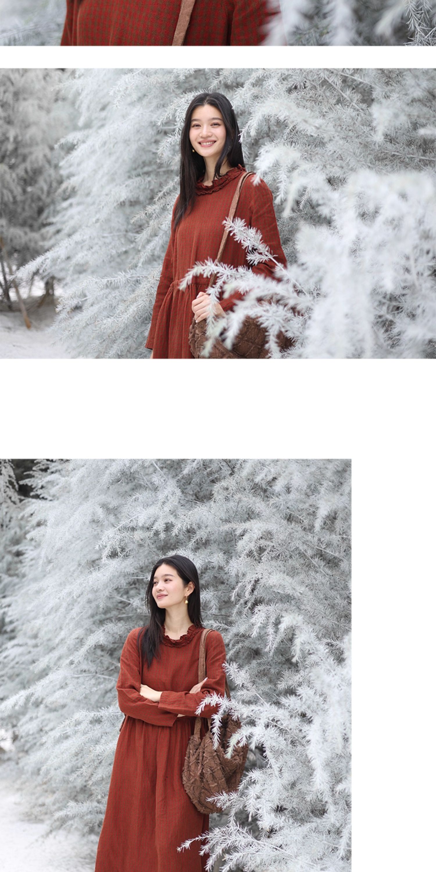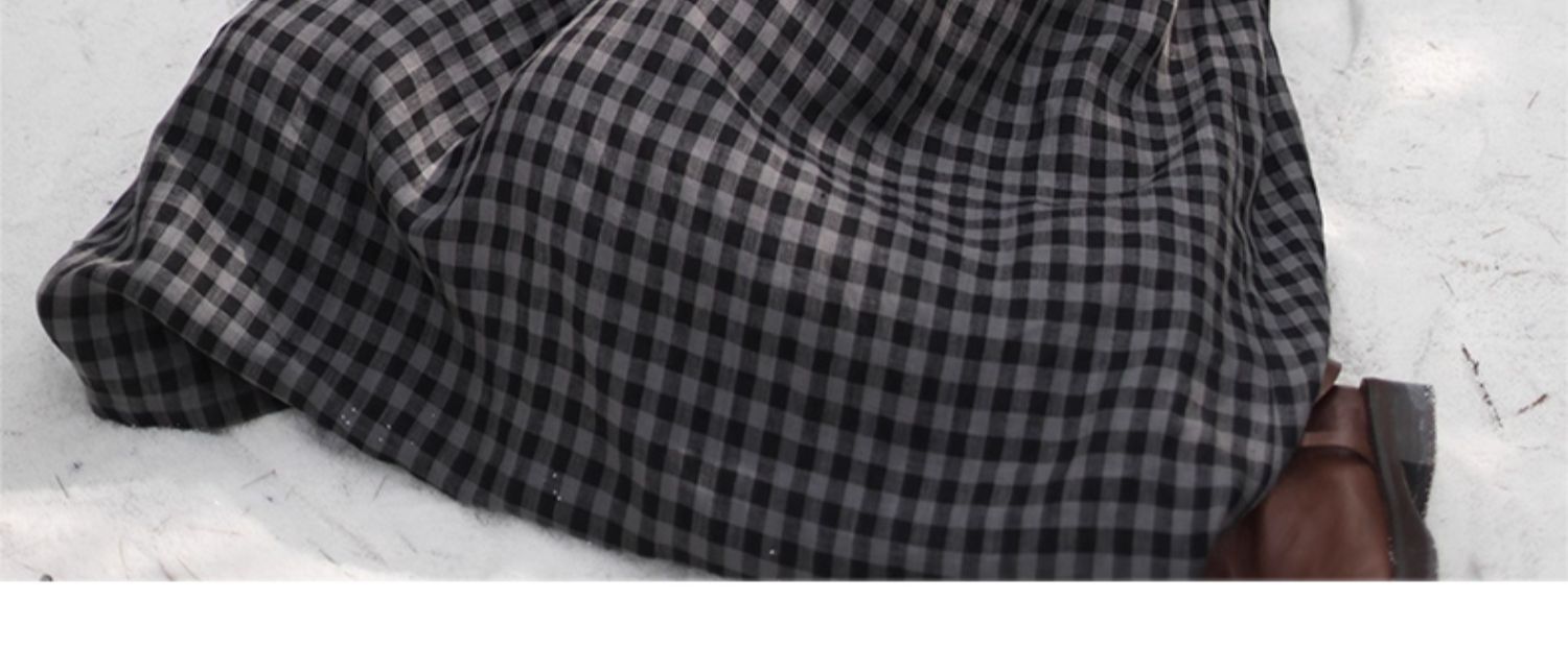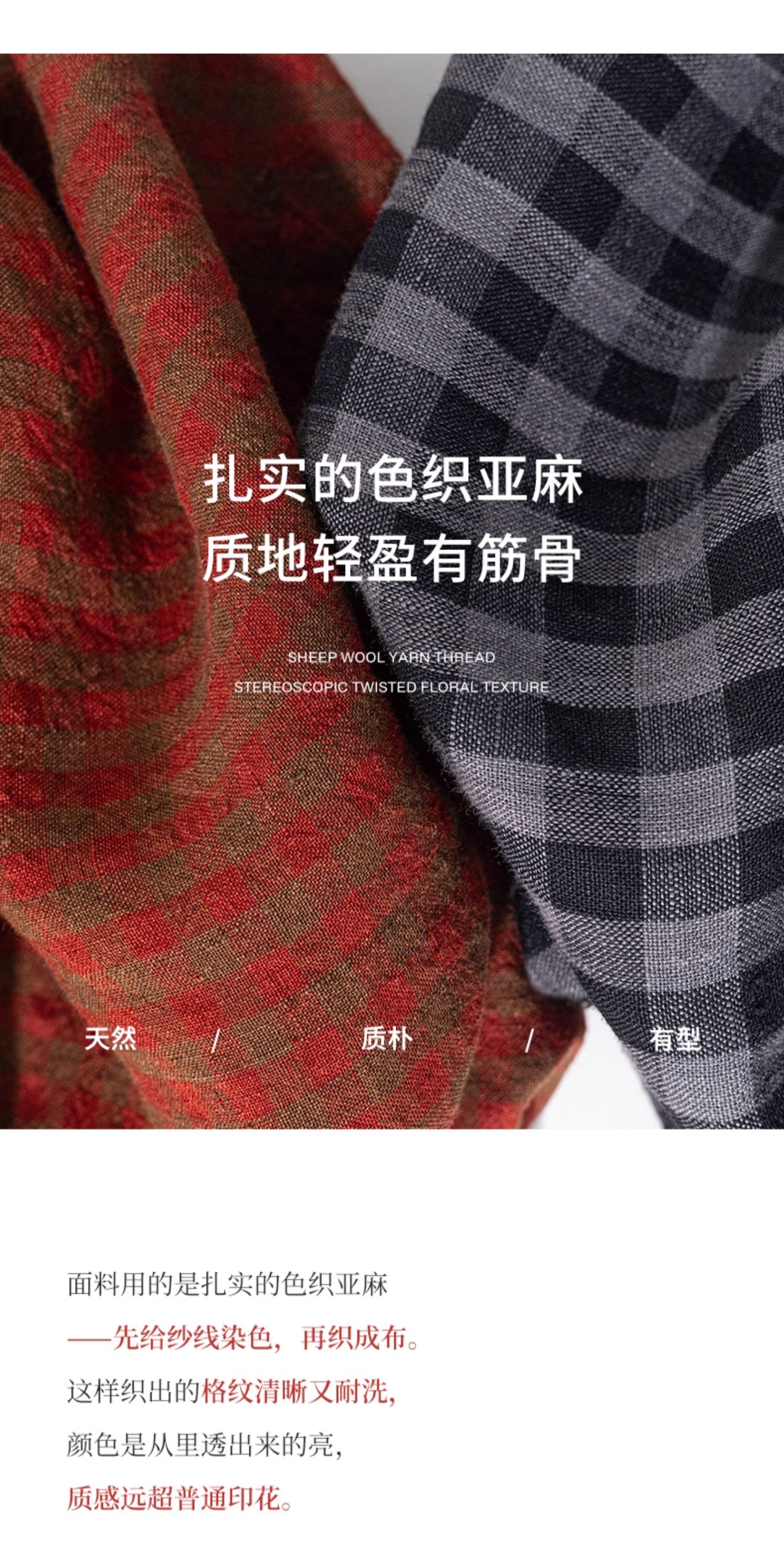 特绽放728朵/影格·色织亚麻格纹花边领腰部系带收腰长袖连衣裙女