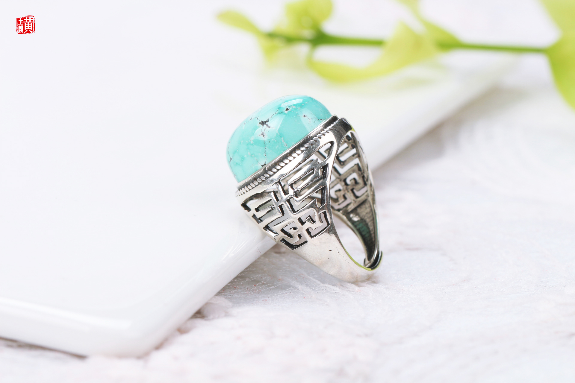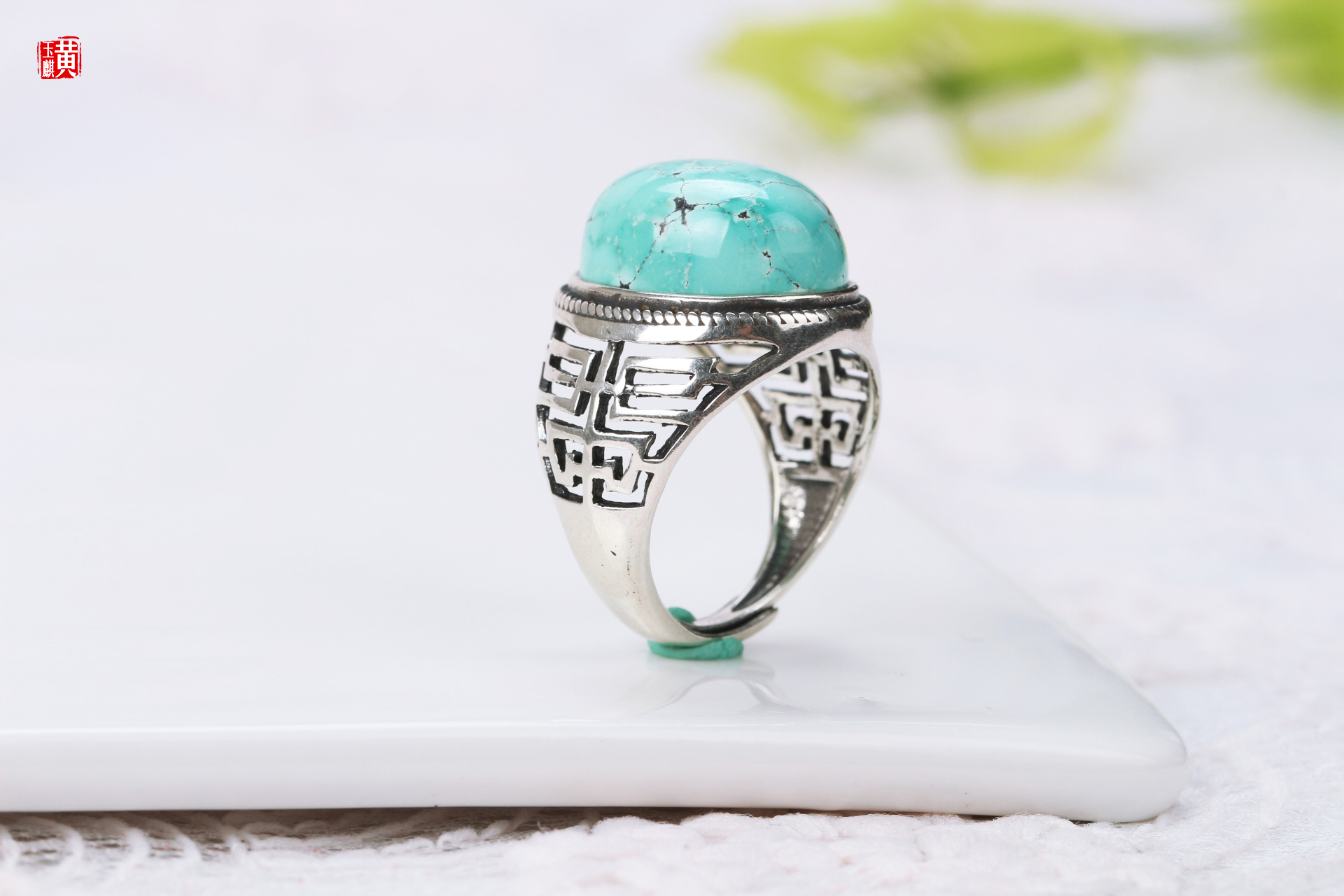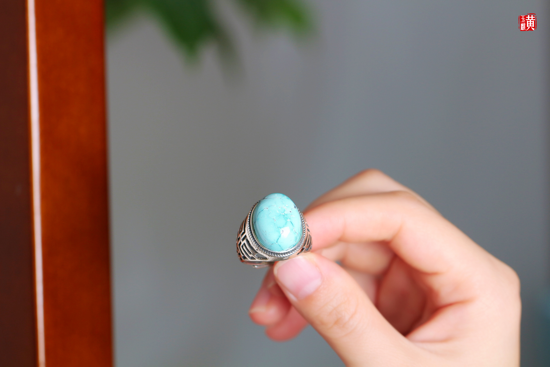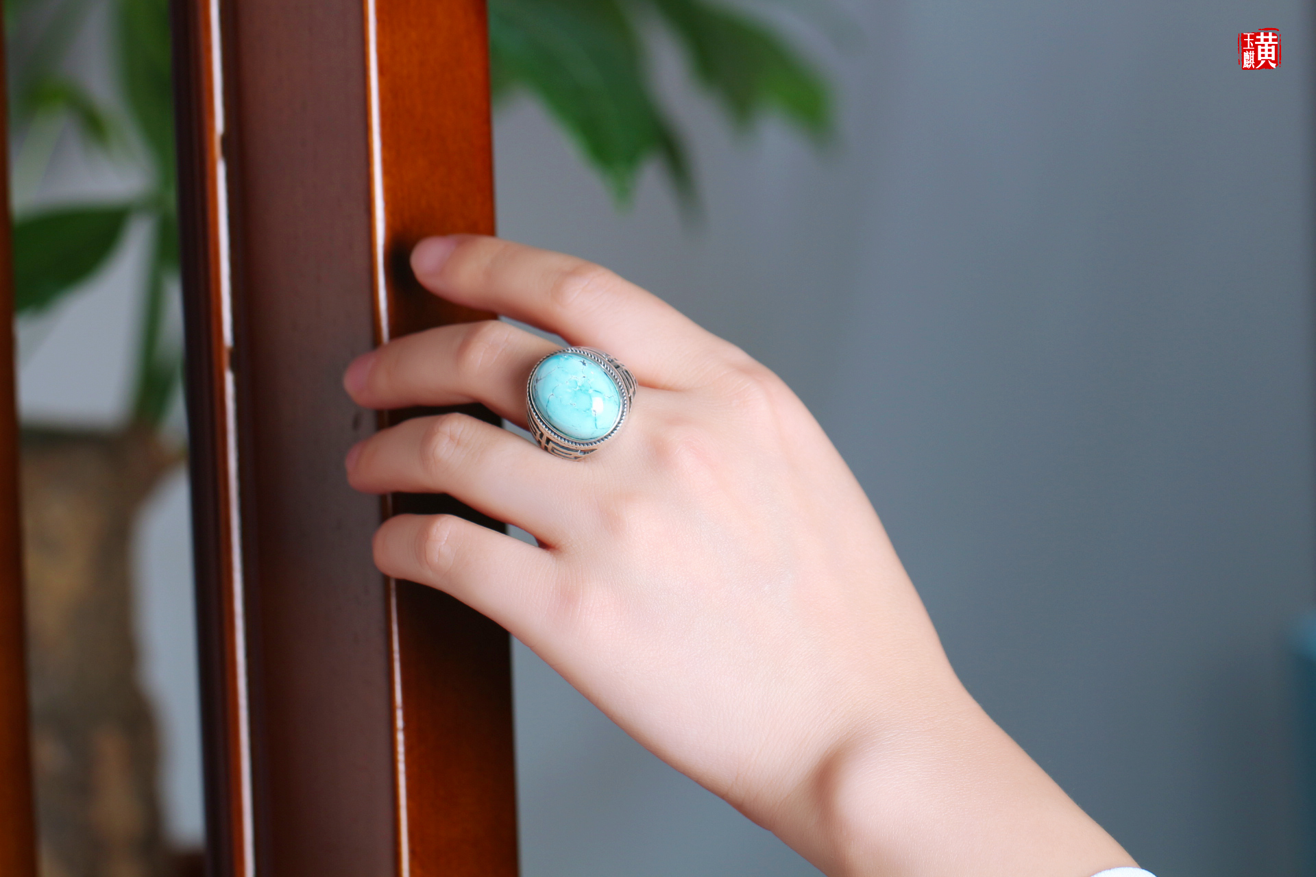 绿松戒指,蛋面饱满,高瓷,天空蓝,清新漂亮,微微铁线,玉化程度高,925银镶,活扣可调节,经典大气,上手很好看。
