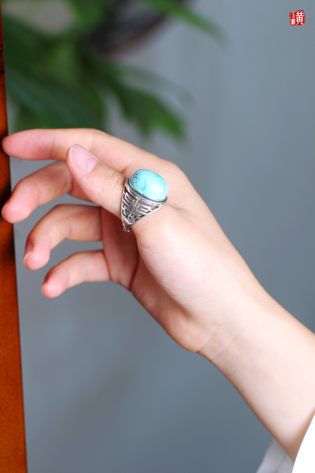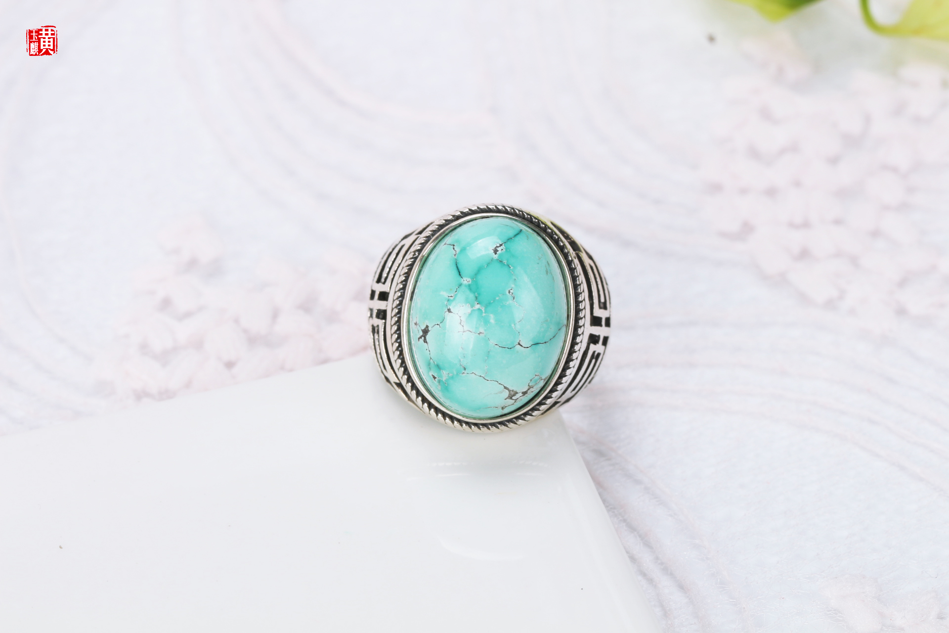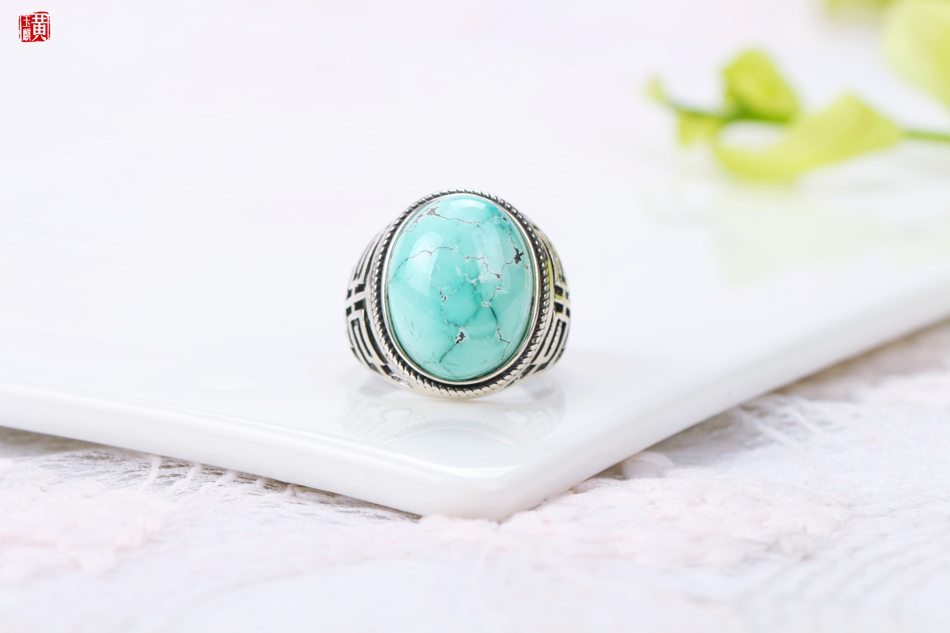 绿松戒指,蛋面饱满,高瓷,天空蓝,清新漂亮,微微铁线,玉化程度高,925银镶,活扣可调节,经典大气,上手很好看。