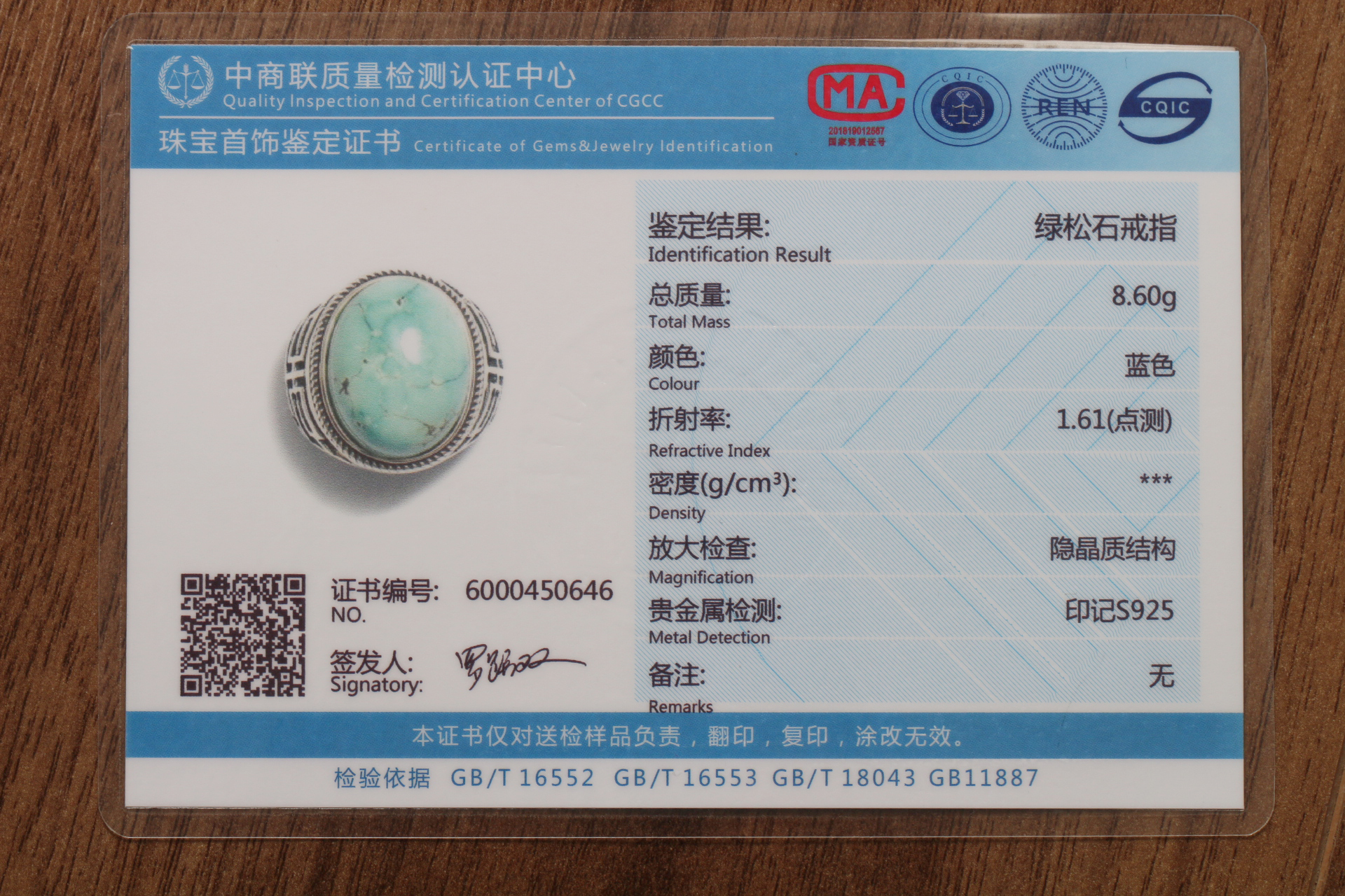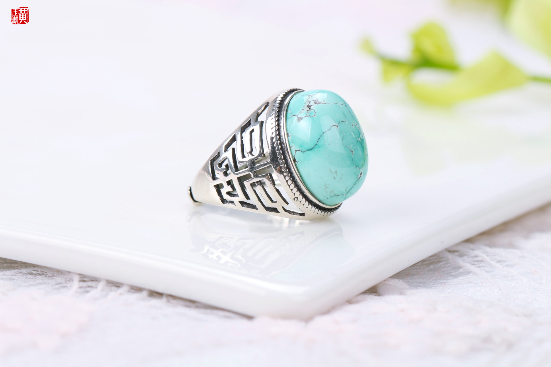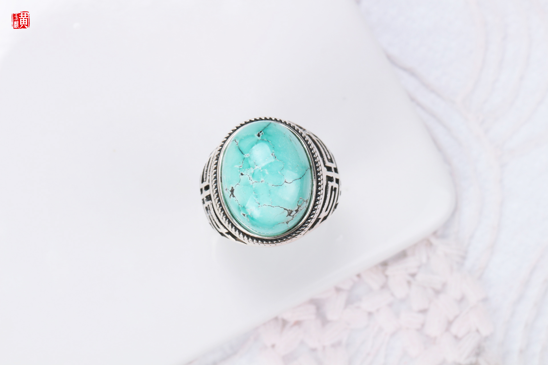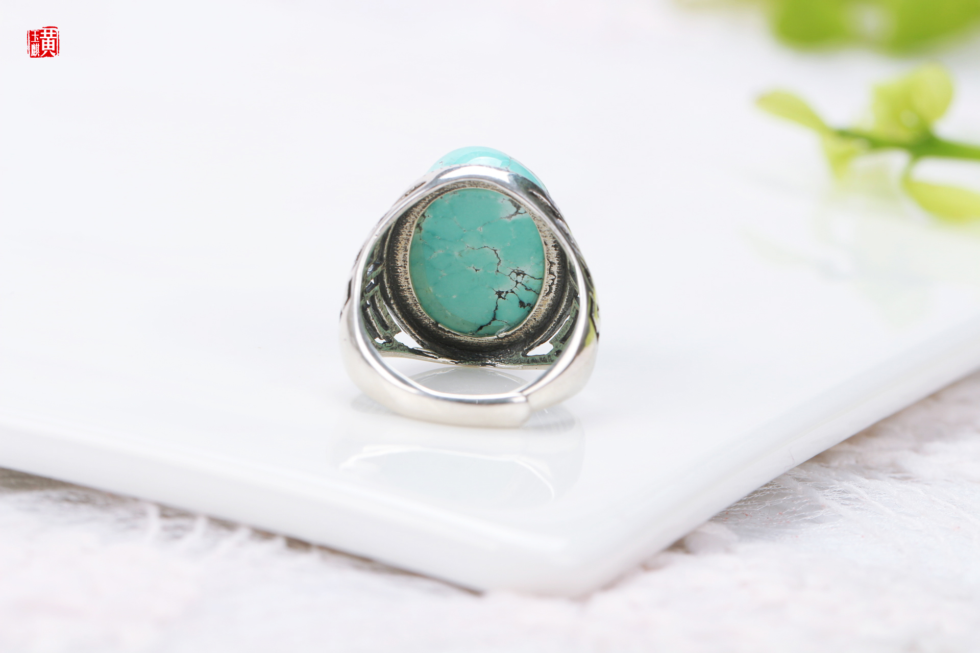 绿松戒指,蛋面饱满,高瓷,天空蓝,清新漂亮,微微铁线,玉化程度高,925银镶,活扣可调节,经典大气,上手很好看。