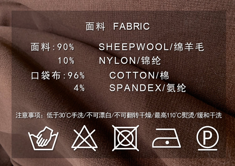 门襟YKK拉链+同色系纽扣,拉合顺畅,经JIU耐用,内里纯棉布包边,美观且耐看。斜插口袋,精致平服,插手角度舒适,置物便捷。