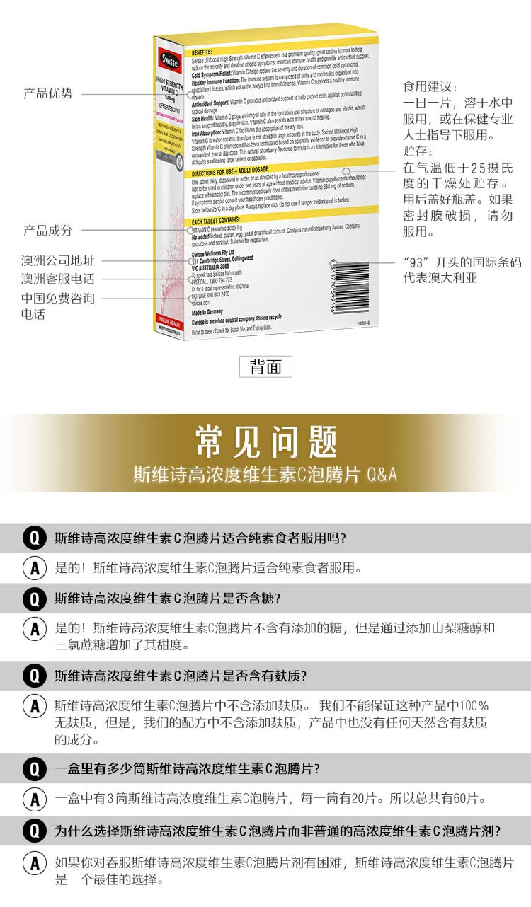 澳洲进口Swisse 斯维诗维c泡腾片天然vc高浓度60片