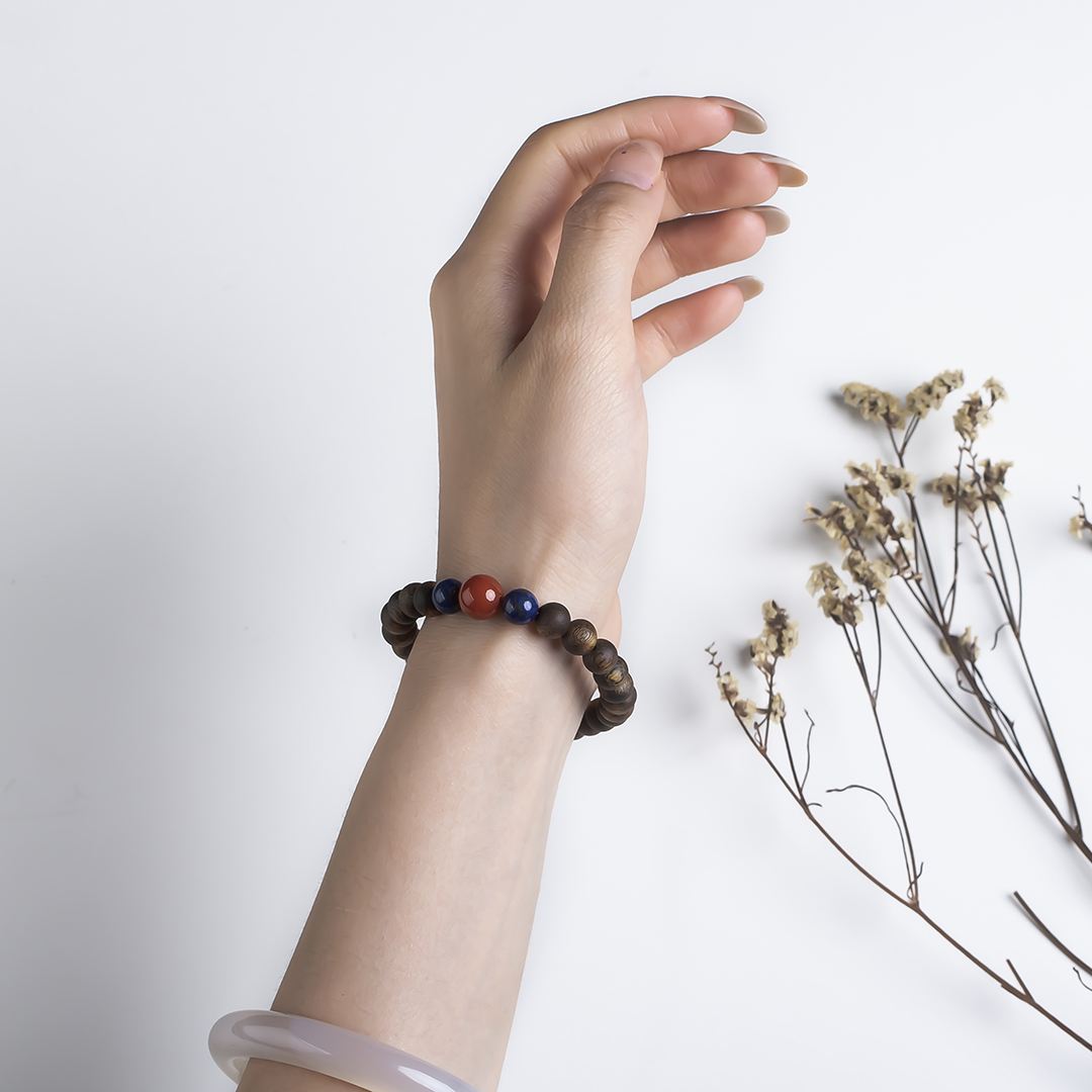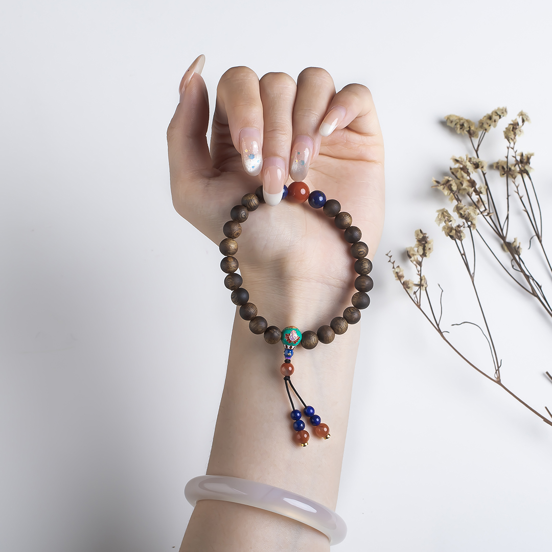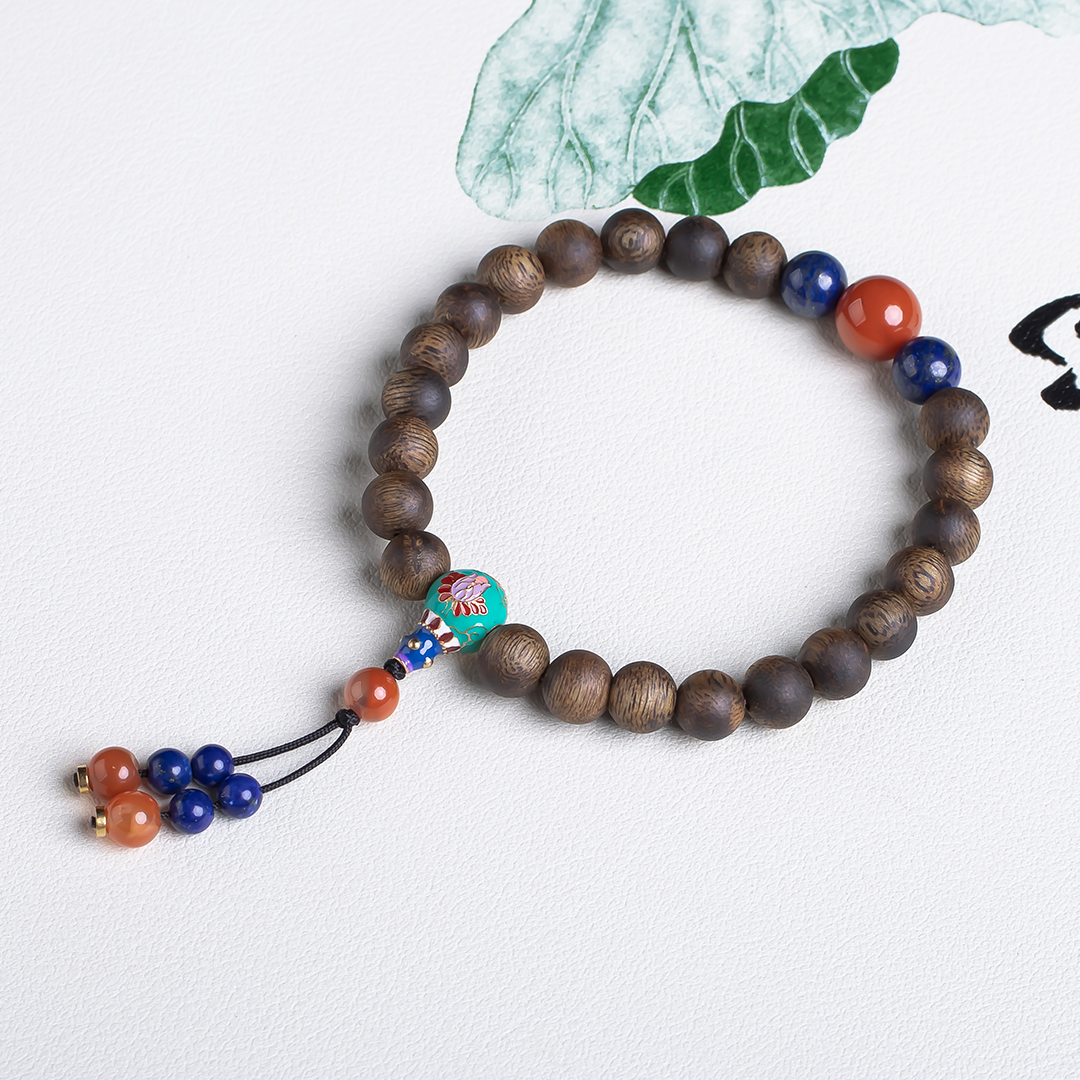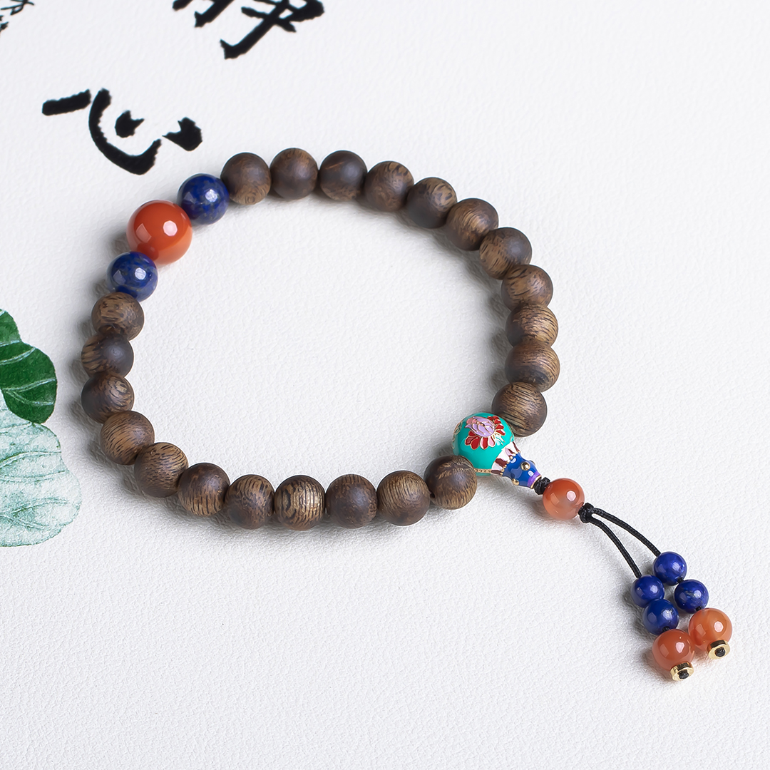 xy0567沉香+南红青金石手持手串.银,天然沉香约7.4mm,原色原味,香味自然清甜,南南红青金石经典敦煌古风色彩搭配,弟子珠流苏款式,手持手串两用,上手大方,静心养神。