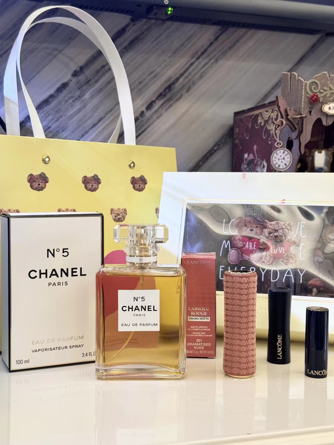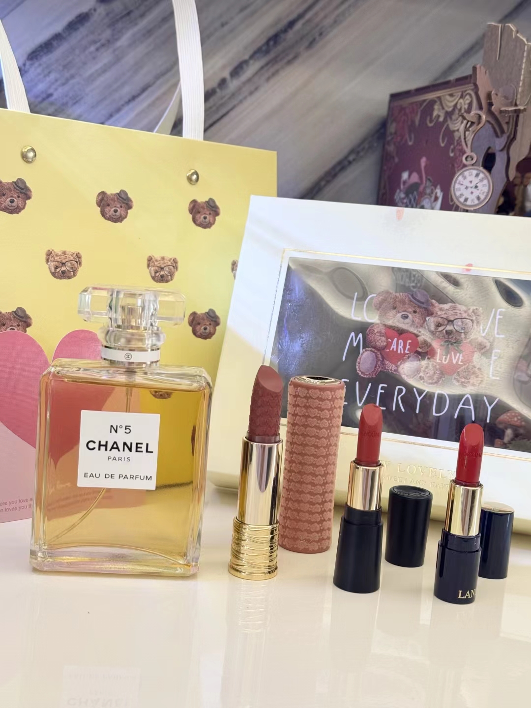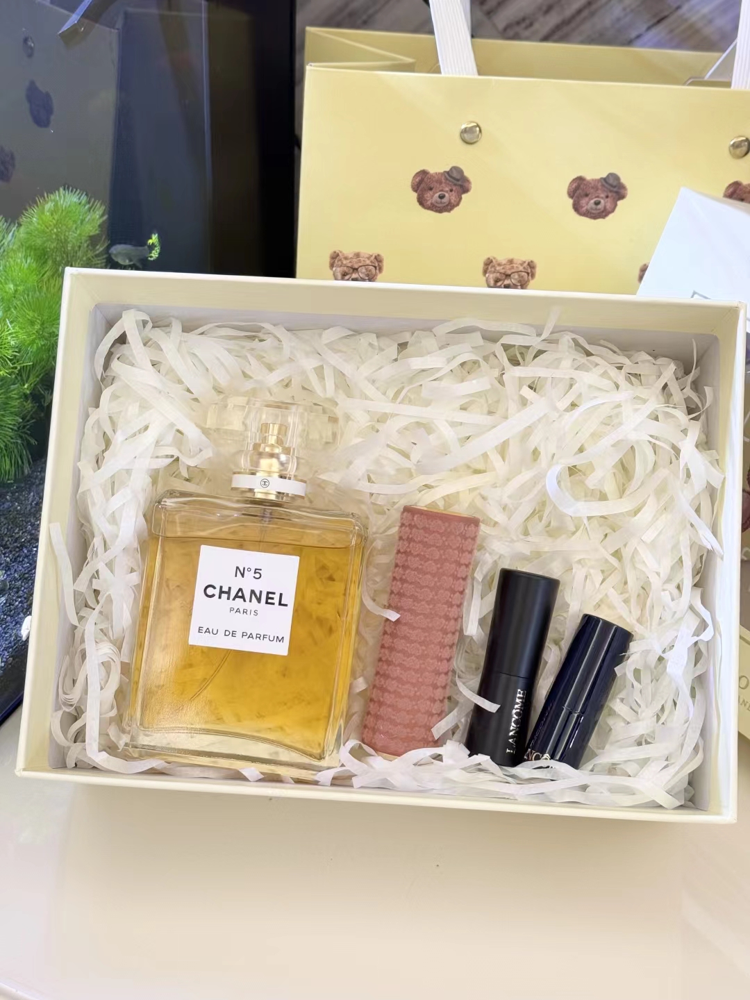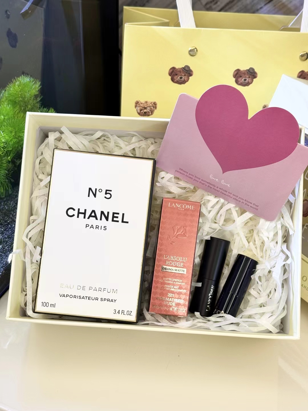#礼物送的好叫过节,礼物送不好叫渡劫,直男务必点进来看看#【黄N5黄油小熊礼盒 】内含:五号之水100ml正装+#221深陷迷棕正装+赠送口红随机色号小样一支+赠送口红随机色号小样一支+拉菲草+贺卡!没有哪个女人不期待情人节,在特别的日子里,挑选礼物总是费尽心思,让收到礼物的瞬间,仪式感又油然而生,成为记忆中熠熠生辉的美好时刻~满满的情人节礼物仪式感,有哪个小姐姐能抗拒呢 货品实拍口红膏体放大拍摄???品质放心??放心购 这份精心搭配的礼盒,装满了宠爱与用心,开盖即是惊 艳!礼物很小,但‘爱你’这件事,很大!!送人大气,自用超值,炒鸡体面!逆T礼盒,闭眼抢!就一批十来盒,抢到就是赚到!