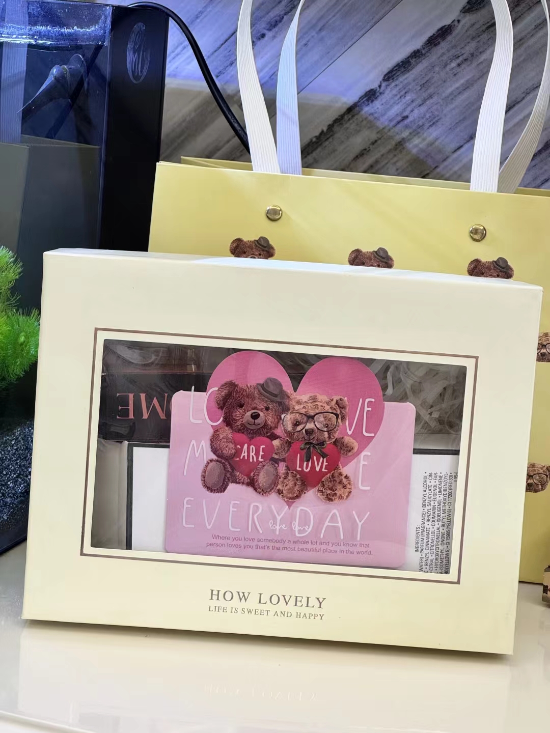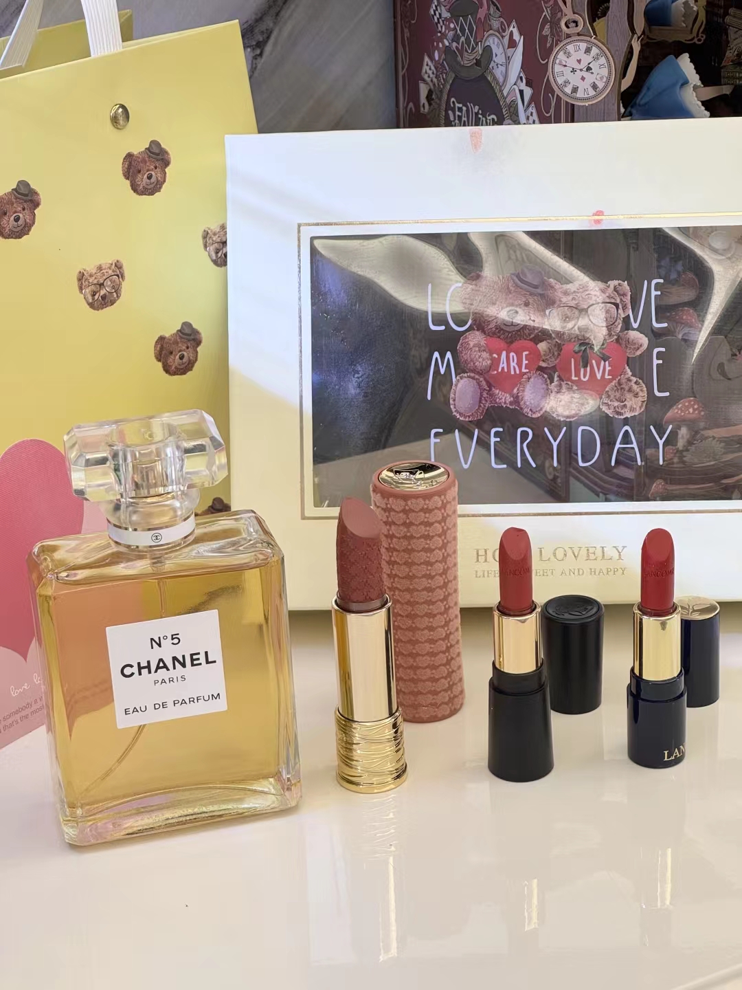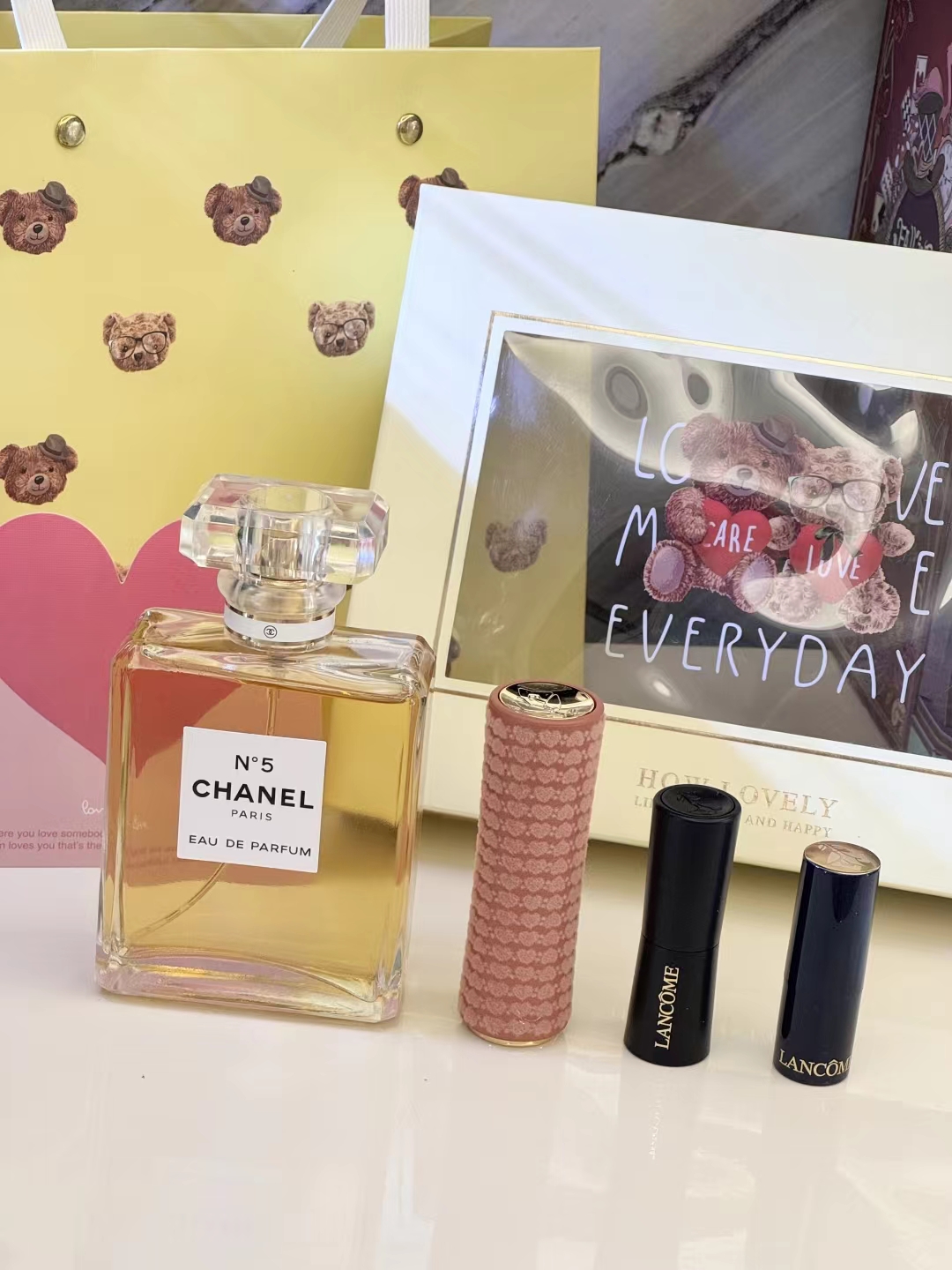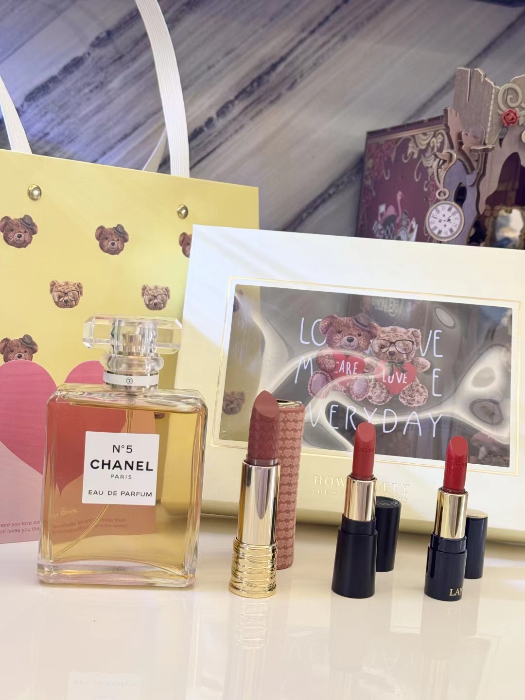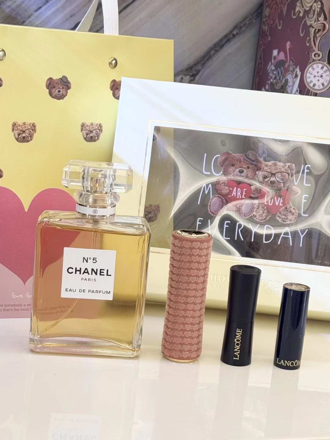 #礼物送的好叫过节,礼物送不好叫渡劫,直男务必点进来看看#【黄N5黄油小熊礼盒 】内含:五号之水100ml正装+#221深陷迷棕正装+赠送口红随机色号小样一支+赠送口红随机色号小样一支+拉菲草+贺卡!没有哪个女人不期待情人节,在特别的日子里,挑选礼物总是费尽心思,让收到礼物的瞬间,仪式感又油然而生,成为记忆中熠熠生辉的美好时刻~满满的情人节礼物仪式感,有哪个小姐姐能抗拒呢 货品实拍口红膏体放大拍摄???品质放心??放心购 这份精心搭配的礼盒,装满了宠爱与用心,开盖即是惊 艳!礼物很小,但‘爱你’这件事,很大!!送人大气,自用超值,炒鸡体面!逆T礼盒,闭眼抢!就一批十来盒,抢到就是赚到!