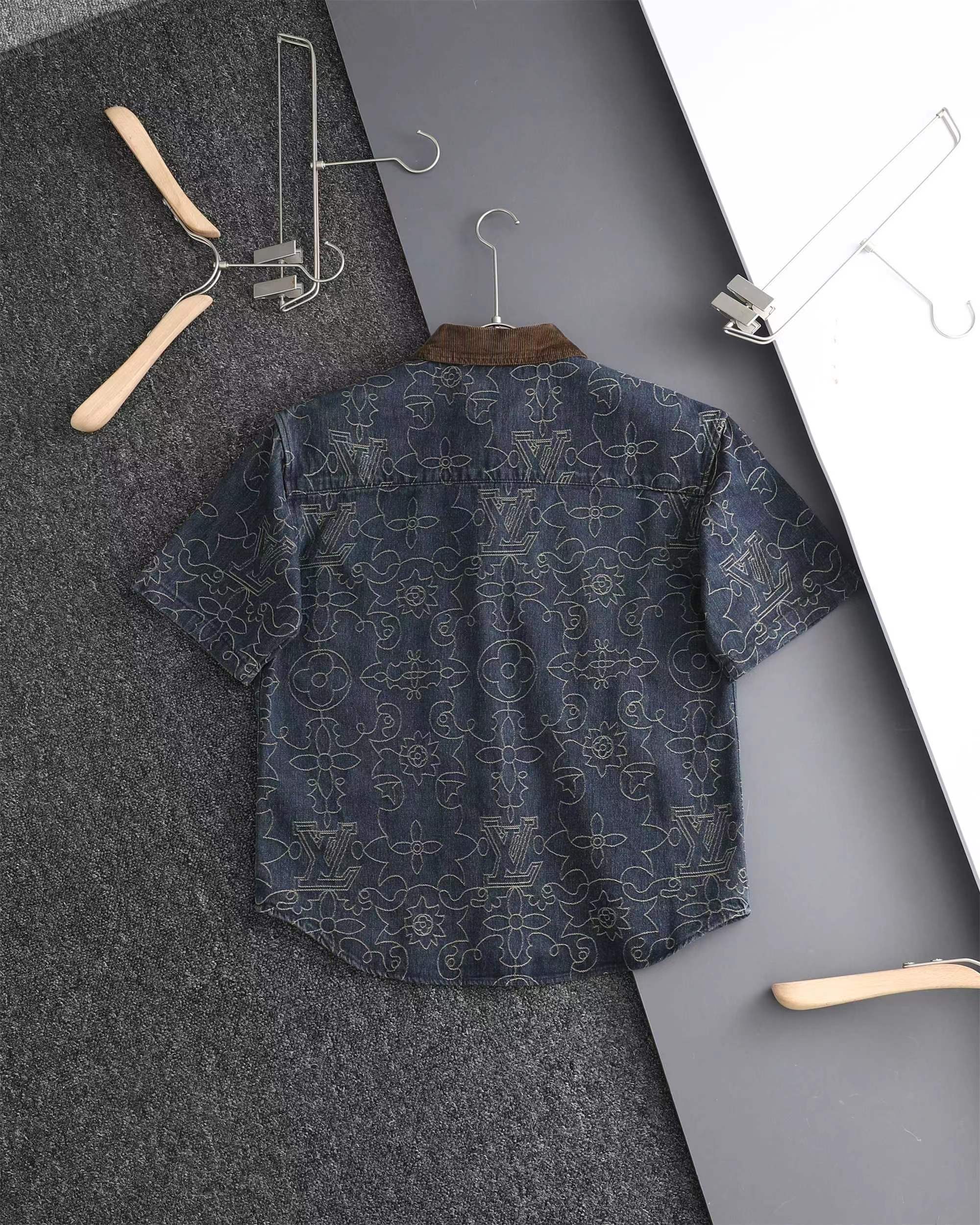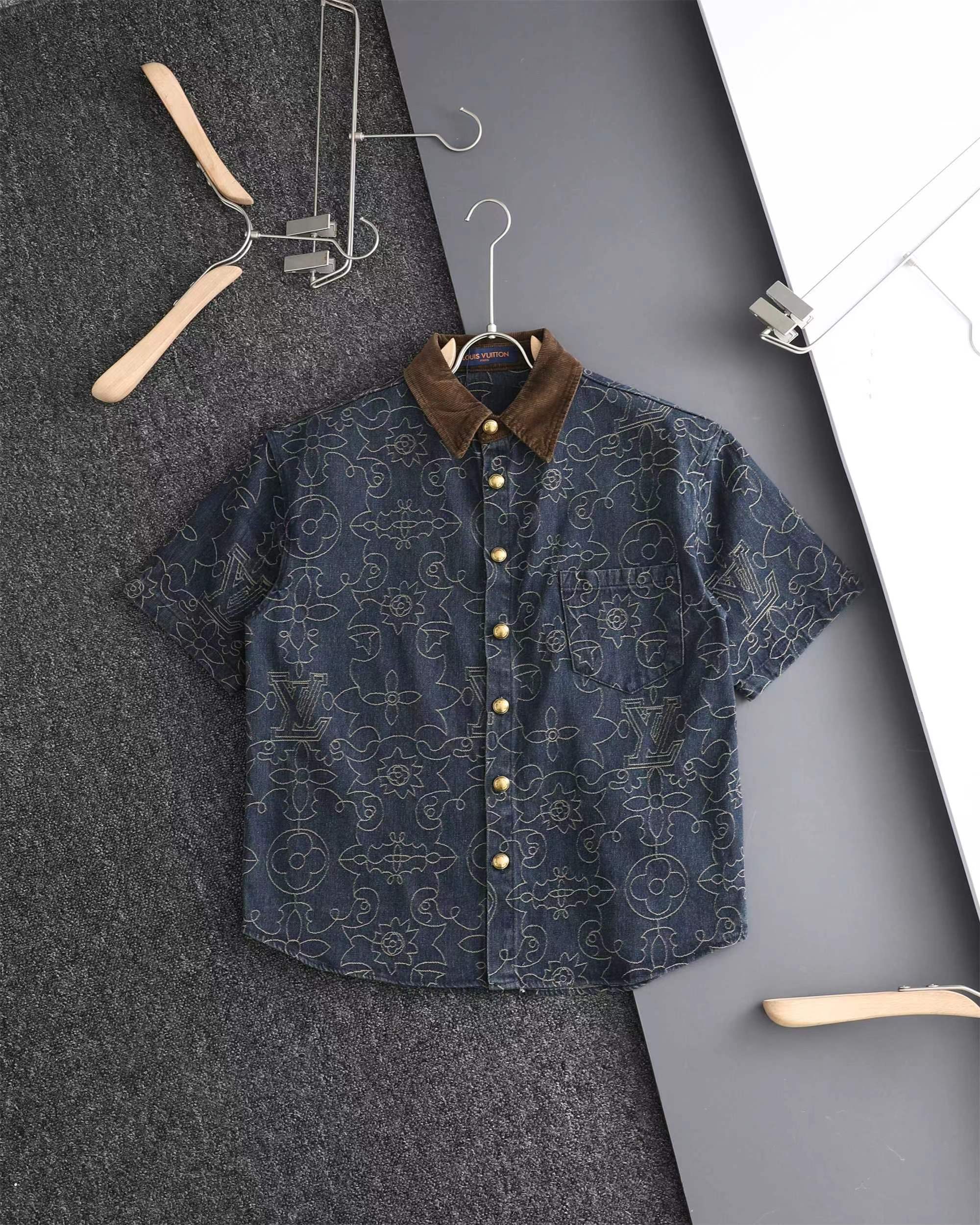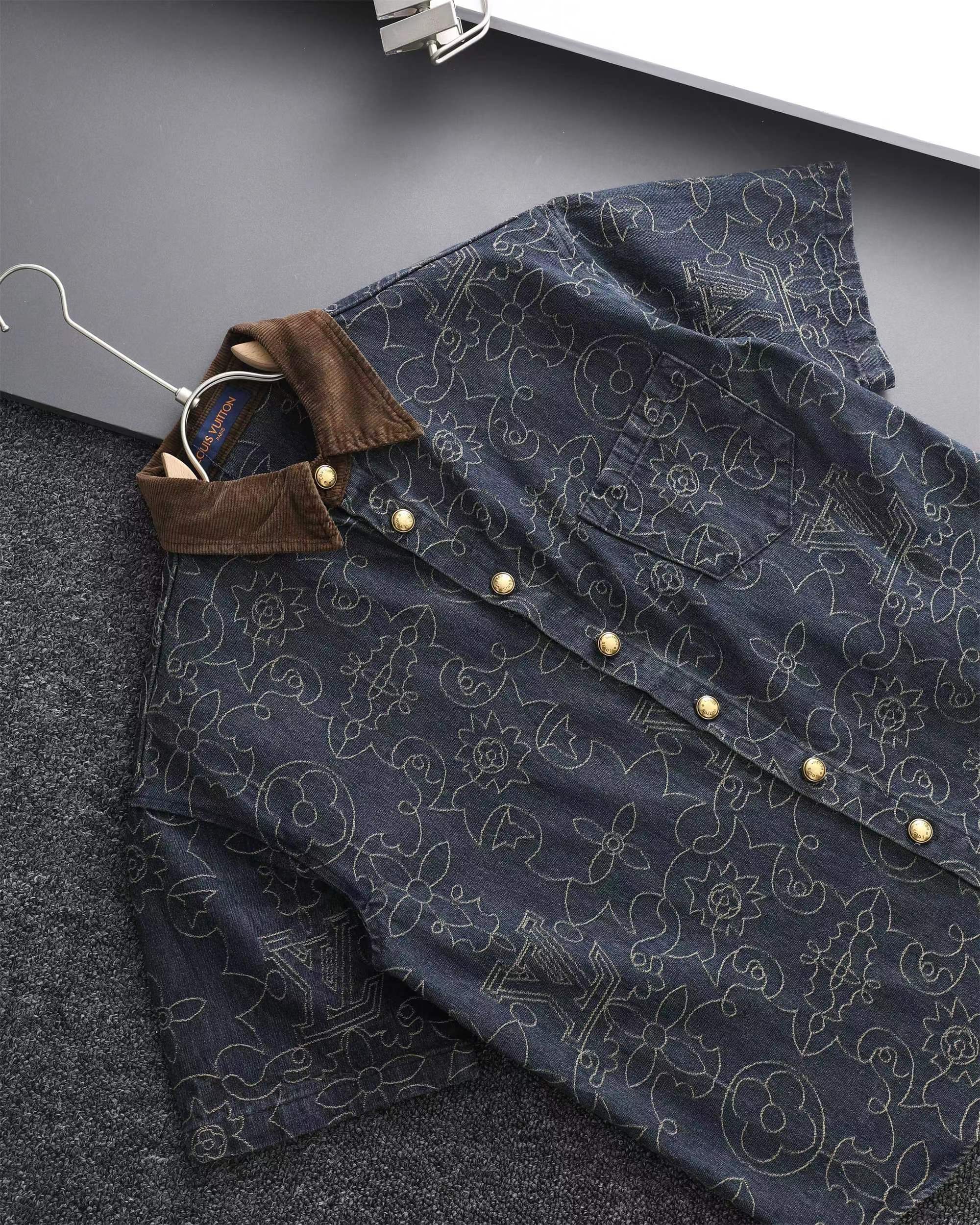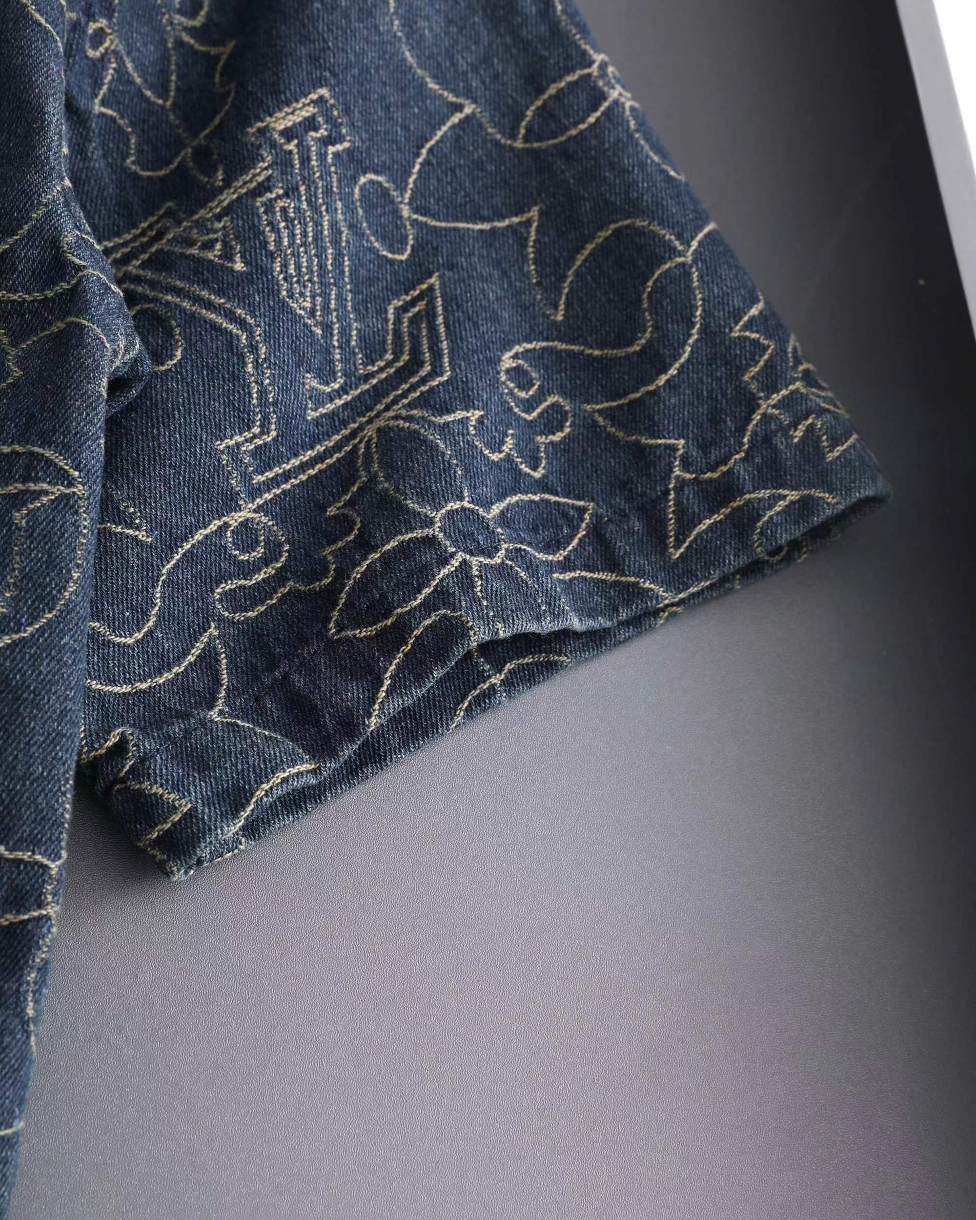 金线刺绣老花字母logo牛仔翻领衬衫短袖外套