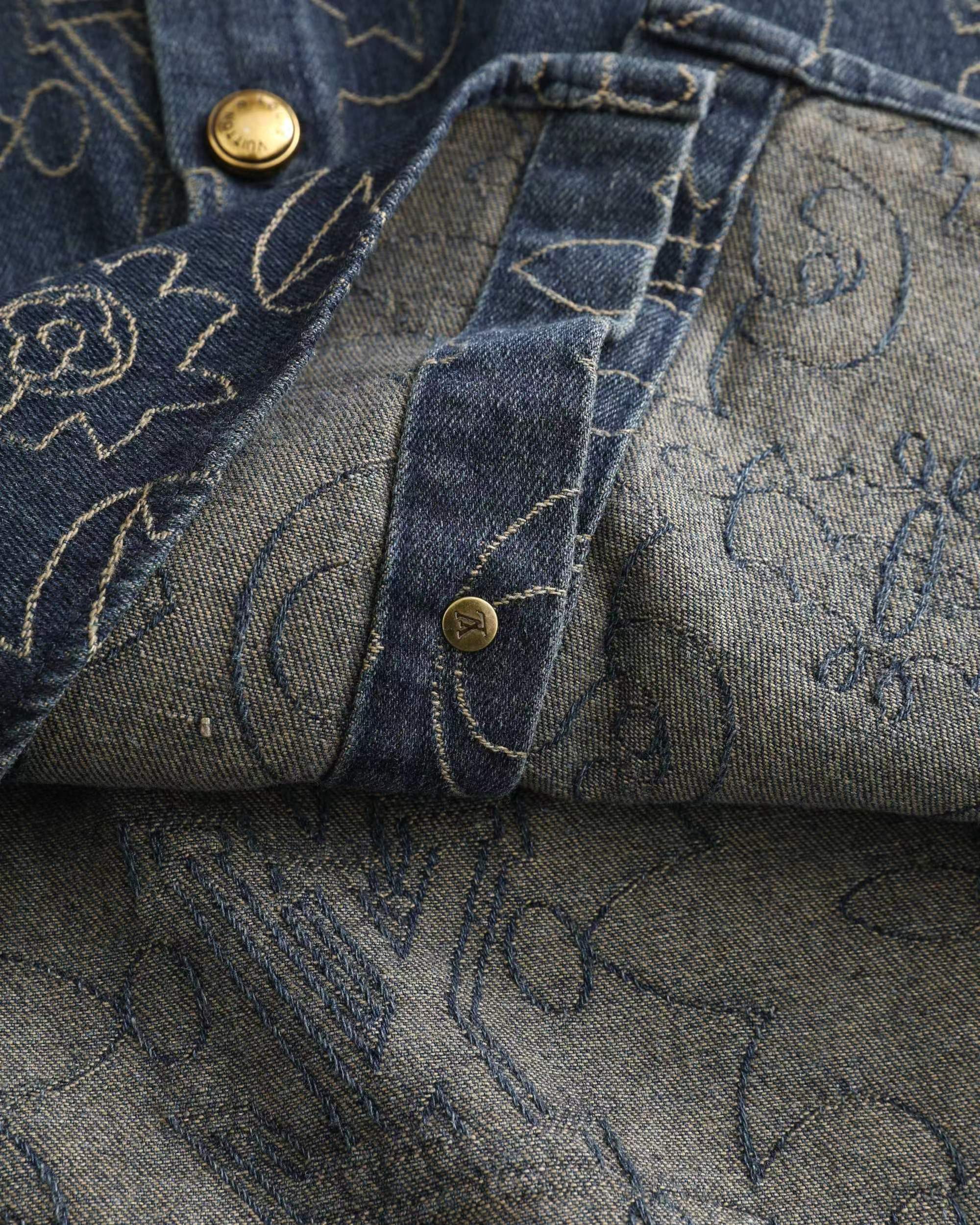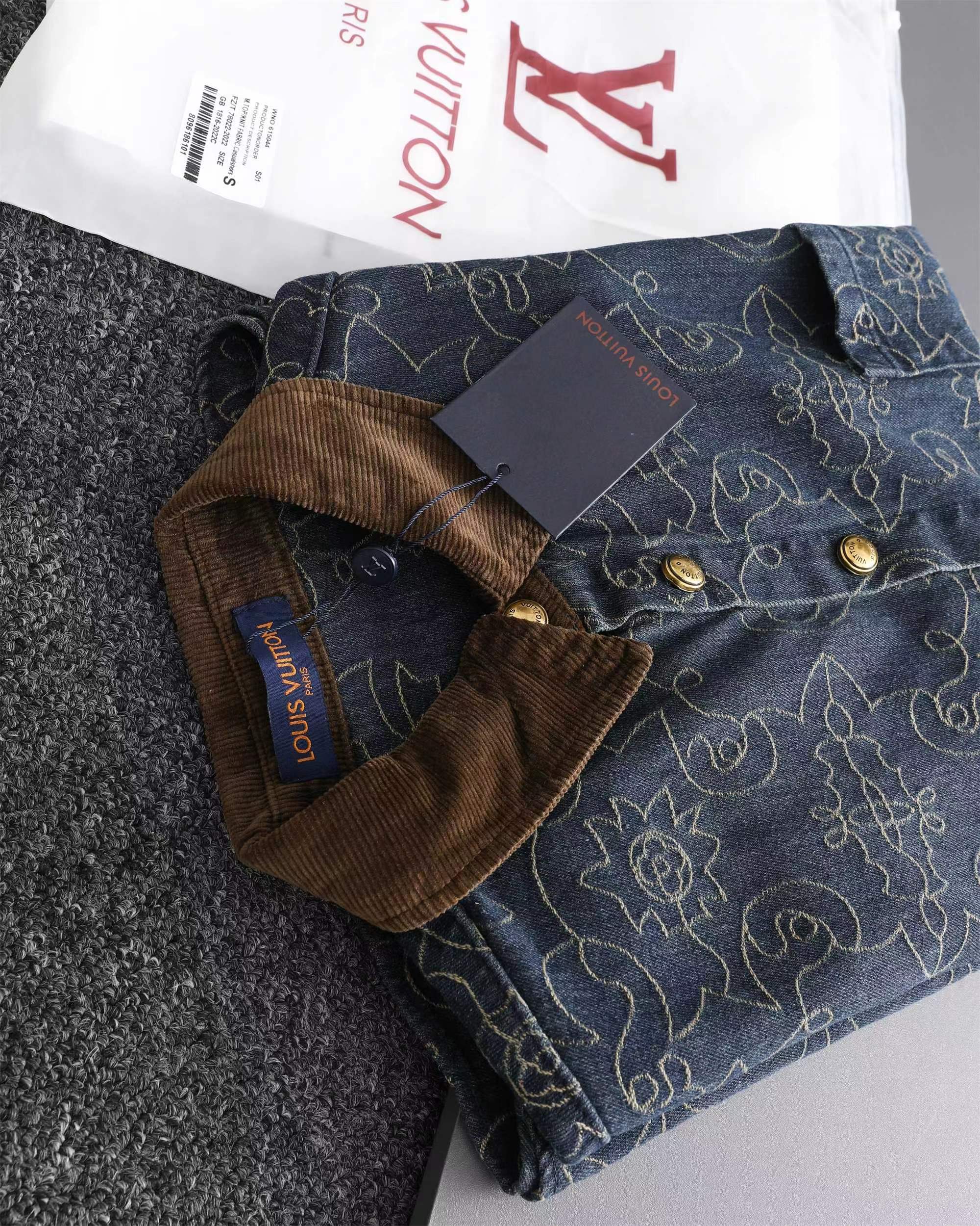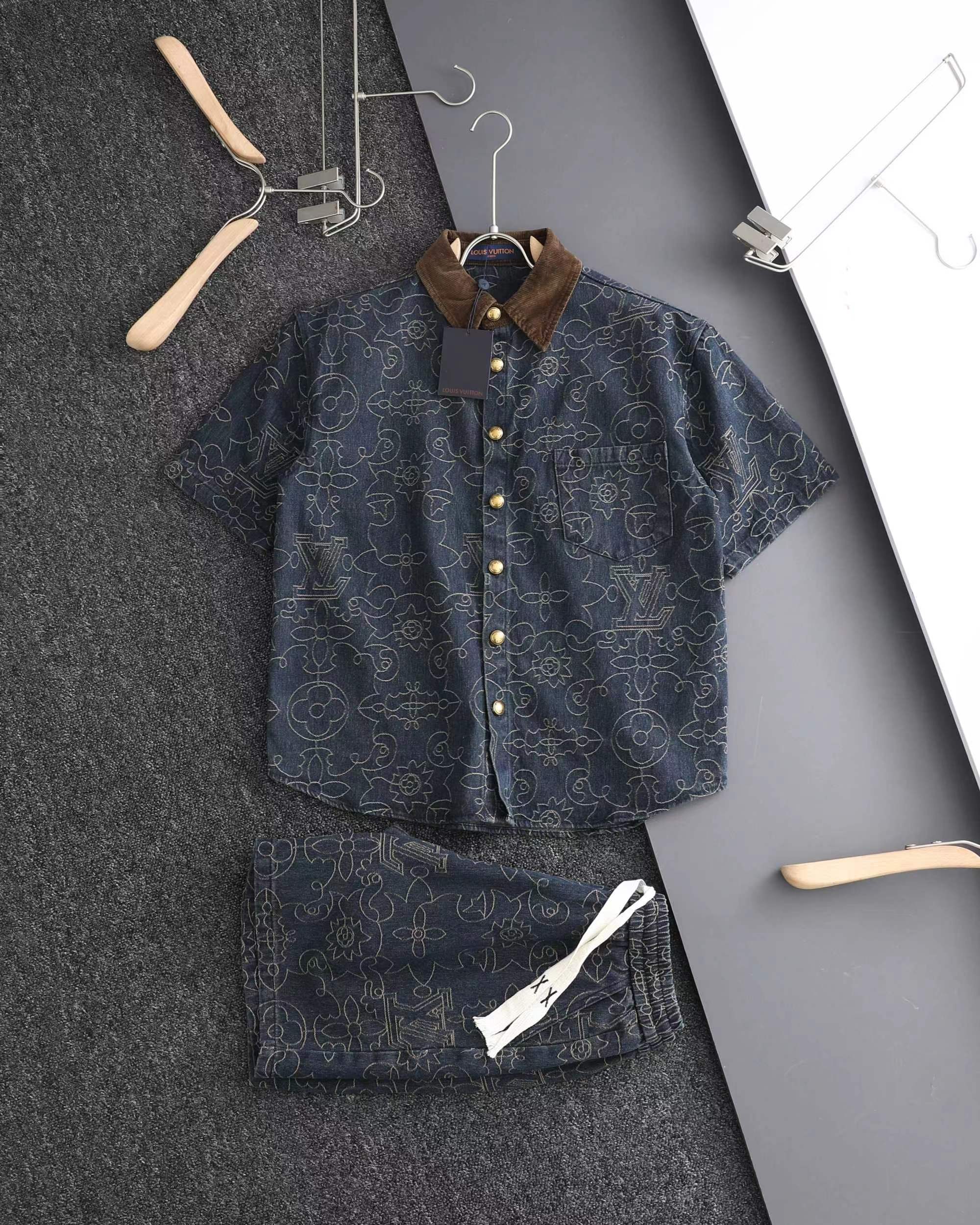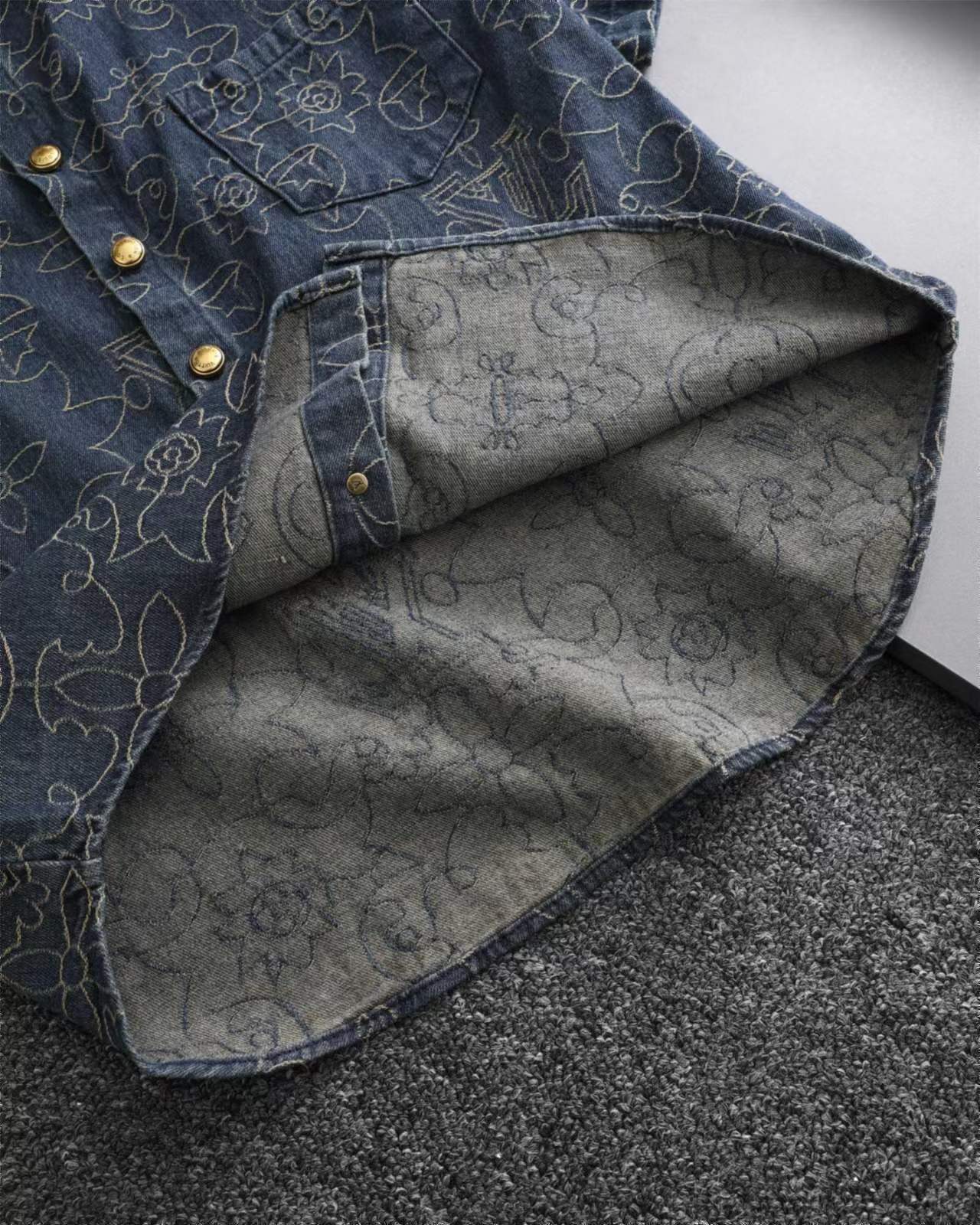 金线刺绣老花字母logo牛仔翻领衬衫短袖外套