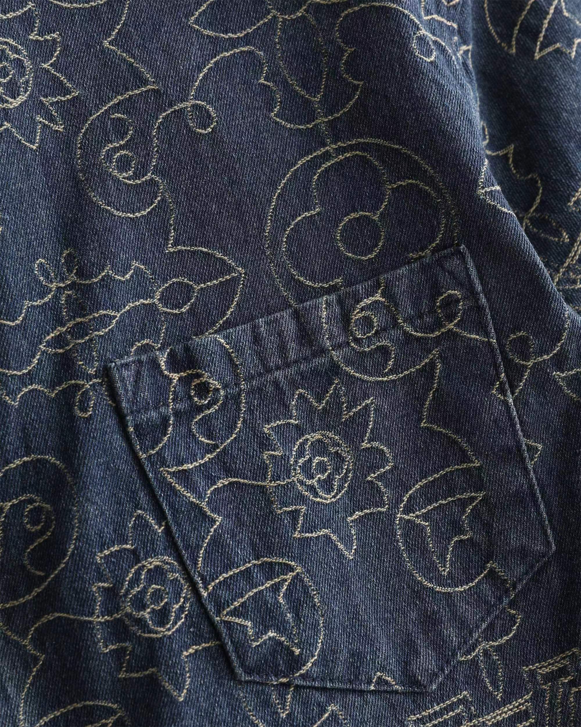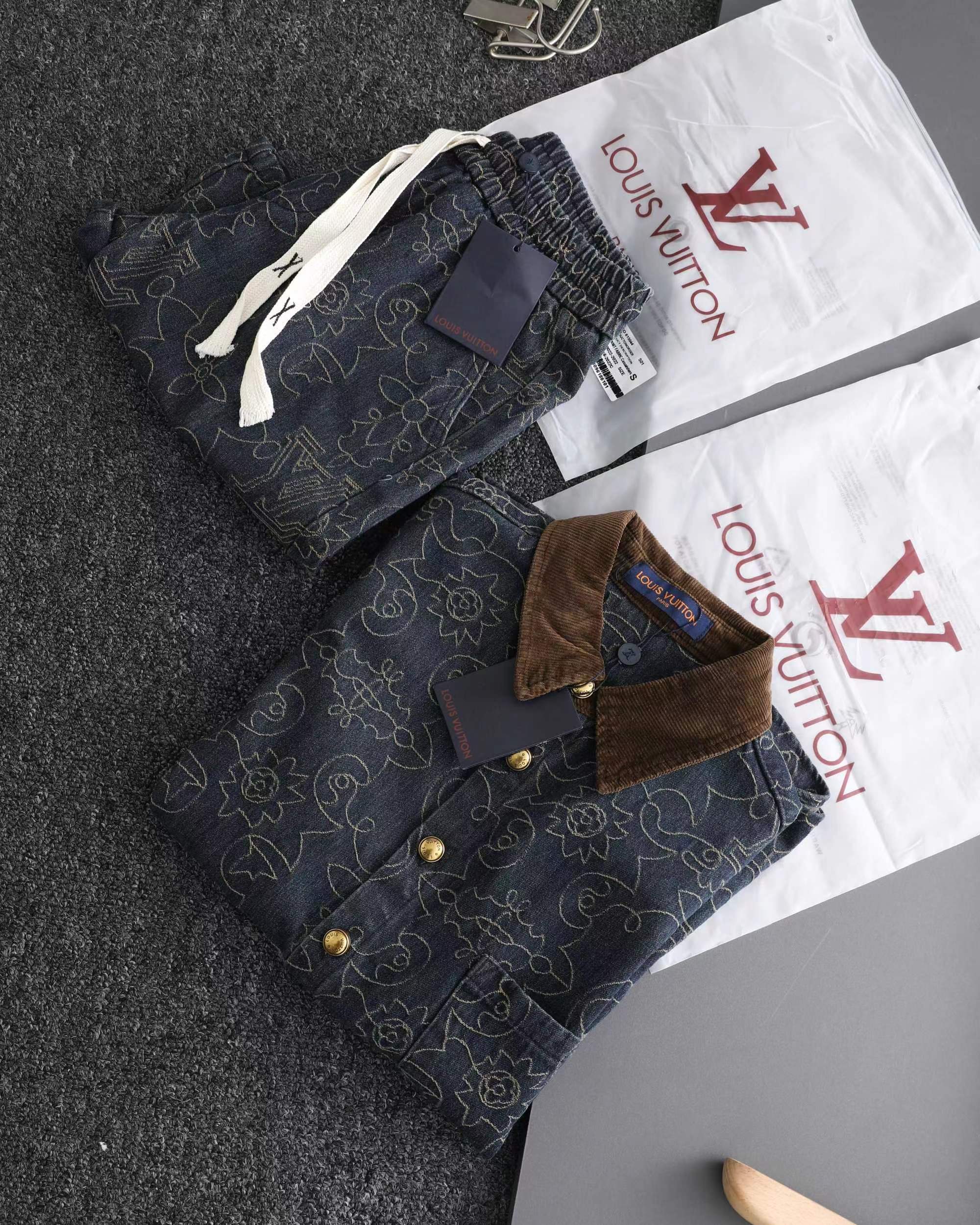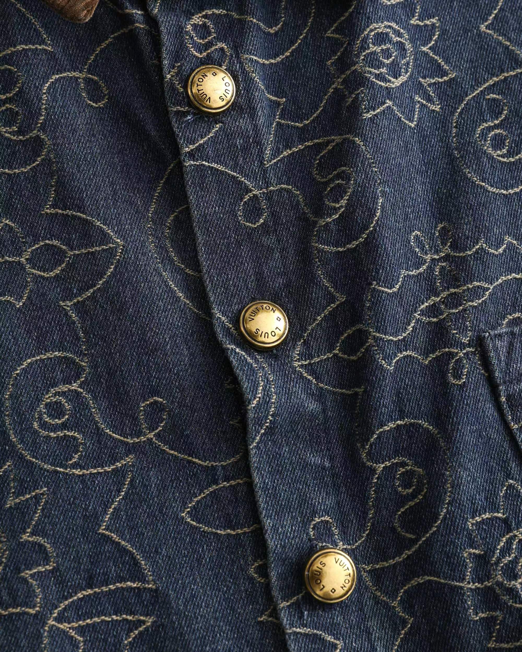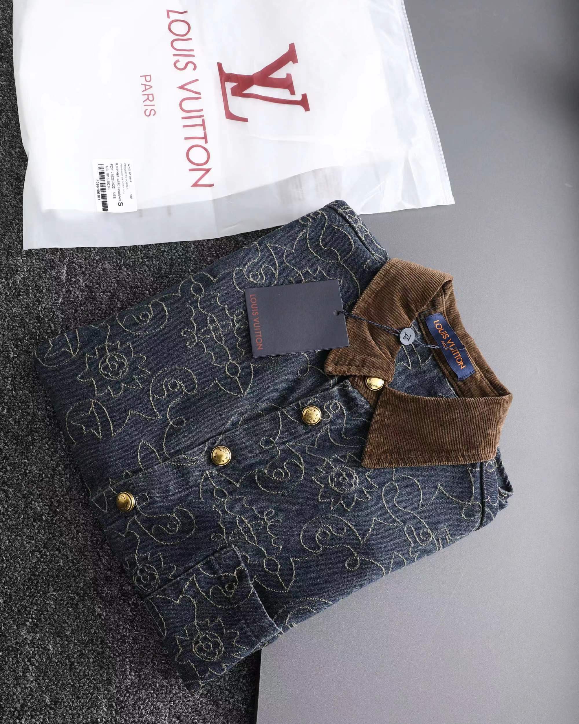金线刺绣老花字母logo牛仔翻领衬衫短袖外套