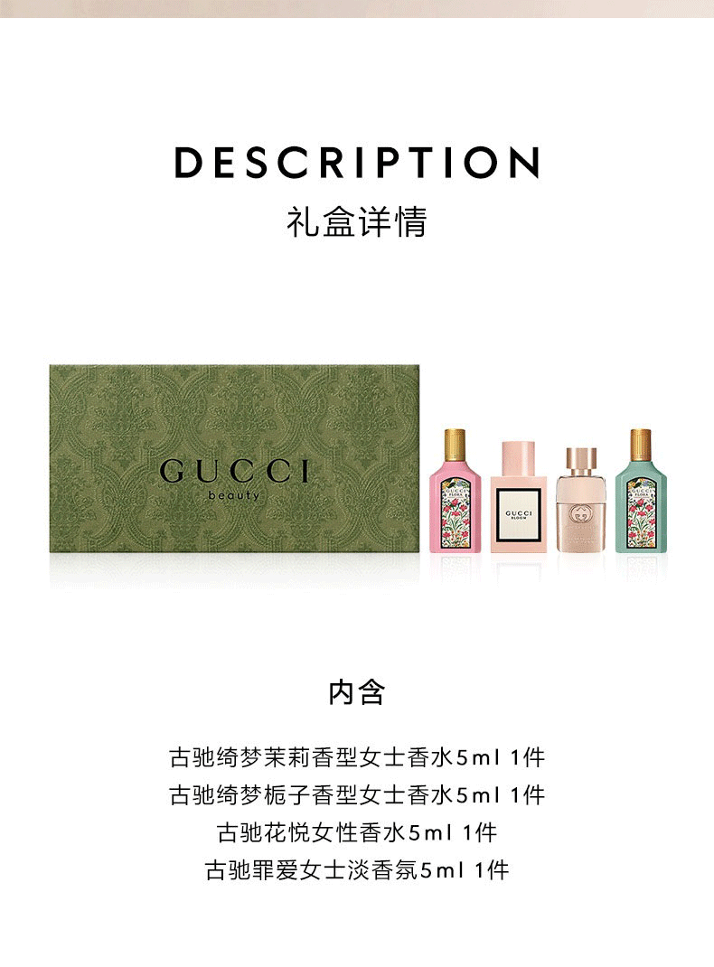 【美妆节-香水送礼袋】古驰迷你香氛礼盒装四件套5ml*4瓶(绮梦茉莉+罪爱女士+花悦+绮梦栀子)无喷头 一般贸易