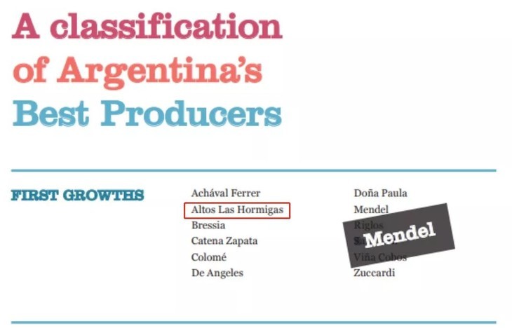 葡萄酒大师蒂姆·阿特金(Tim Atkin)借鉴法国波尔多的 1855 分级体系对阿根廷酒庄进行了分级,并将蚁丘酒庄列为一级。一级庄也就是说这是阿根廷金字塔里那上面的小部分代表,总数只有 12 家。
