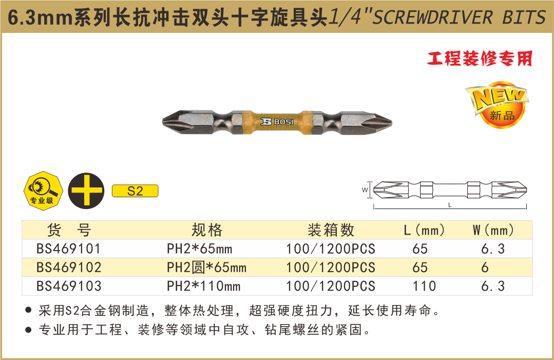 波斯 6.3mm系列单头六角旋具头 PH2*65mm--T BS469101