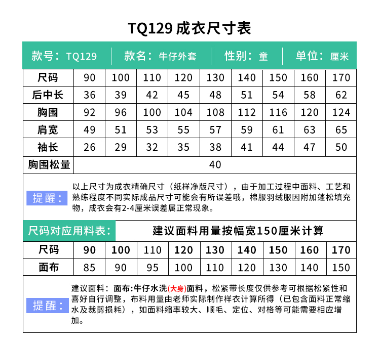 裁缝学苑TQ129童装新款复古森系牛仔外套上衣纸样儿童服装打板