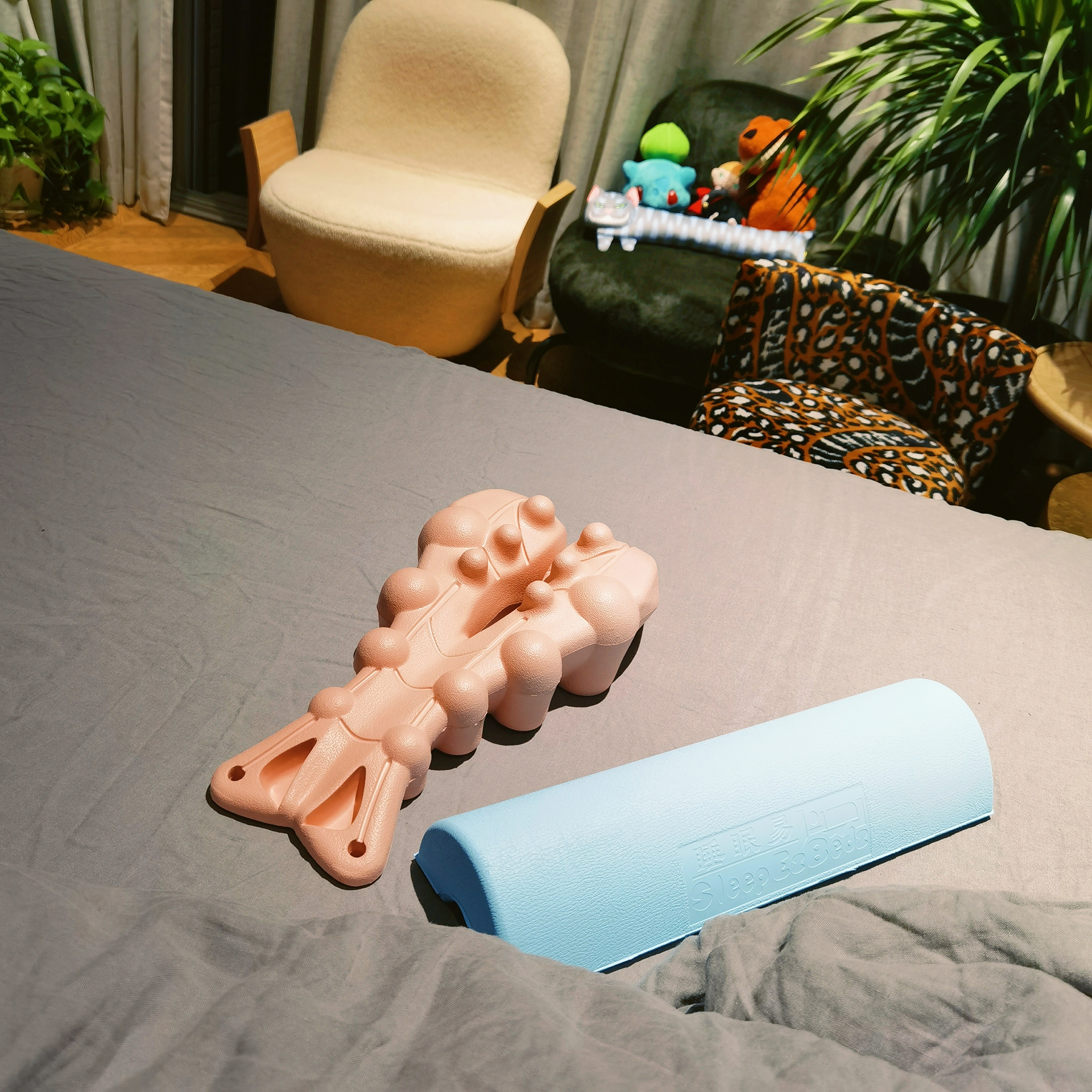 小龙虾有茱萸粉和浮氧蓝两个色,我自留了一个粉色,粉粉嫩嫩还挺可爱。它外形真的很像一只龙虾,上面有14个凸起的小球,内里的6个小球靠上去有明显的指压感,但是痛过之后,肌肉放松的感觉也会特别明显,就好像咱按摩时会要求老师傅“用力,再用力”一样。而外层的8个球球相对温和一点,比内侧的软很多,能够按摩到背部和腰部。小龙虾除了躺着用,也能坐着站着用,脖子累了就靠一会,颈椎会有放松感,留一个在公司也很必须哦!对于长期保持低头状态的颈椎来说,按摩确确实实是有助于促进血液循环、放松肌肉的,平时在办公室,只需要垂直靠放在椅背上,就可以轻松享受颈椎牵引的舒爽!