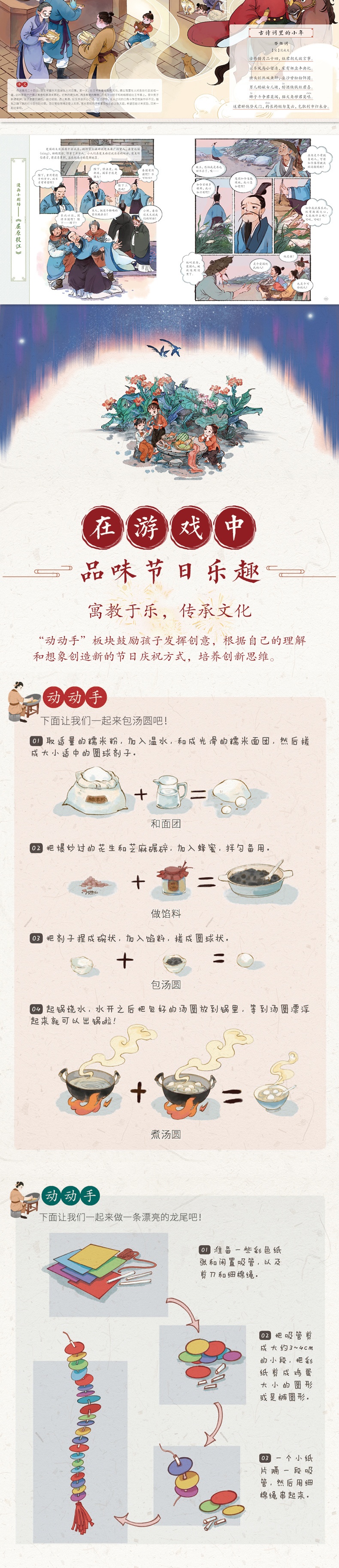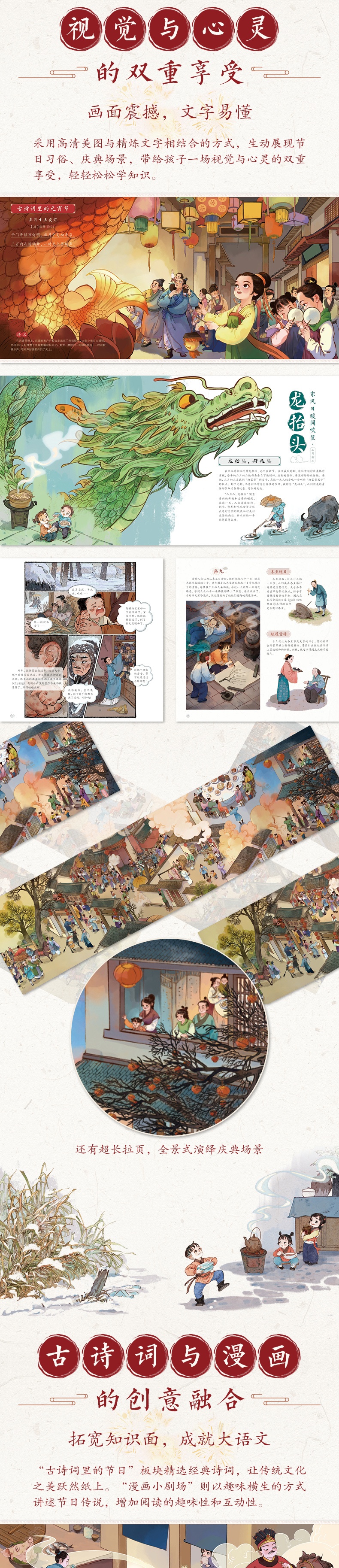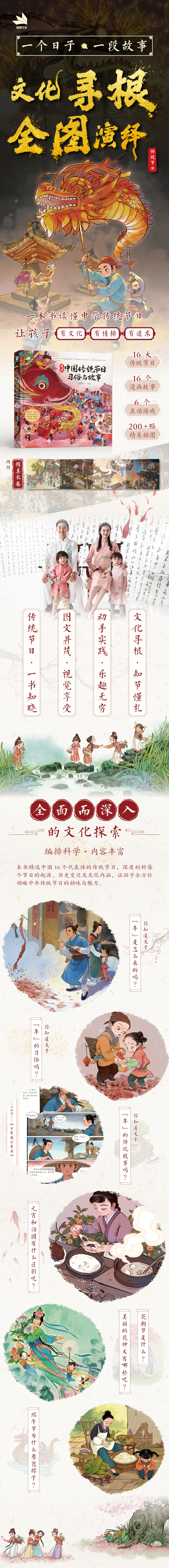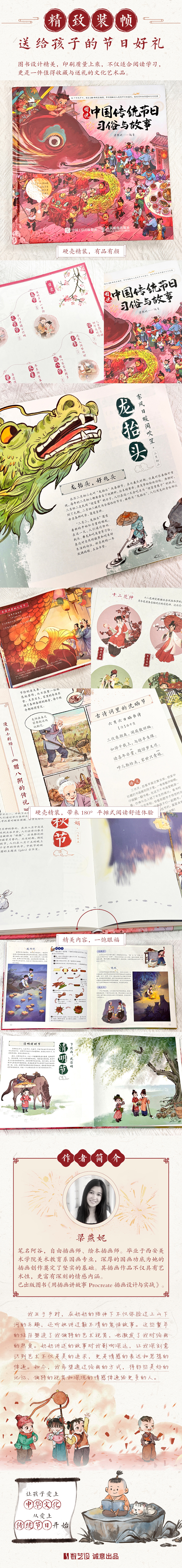 这是一本引人入胜且设计精美的图书,深入浅出、图文并茂地展示了中国传统节日的韵味与魅力。全书精选了16个具有代表性的中国传统节日,如春节、元宵节、清明节和端午节等,不仅讲述了这些节日的起源、历史演变,还生动地描绘了节日的传统习俗,如春节的拜年、放鞭炮,端午节的赛龙舟、吃粽子等,相信读者在学习节日文化的同时,也能感受到中华民族别具特色的民俗风情。 书中特别设置了“古诗词里的节日”和“漫画小剧场”两个板块。前者通过*古诗词,让读者更加直观地感受传统节日的美好氛围;后者则以生动有趣的漫画形式,讲述了与节日相关的传说故事,为阅读增添了不少趣味。此外,为了增强互动性,书中还特别设置了“动动手”板块,通过有趣的互动环节,读者能够在动手实践中感受传统节日的乐趣。 本书既适合家长与孩子共同阅读,也适合对中国传统节日文化感兴趣的读者深入品读。