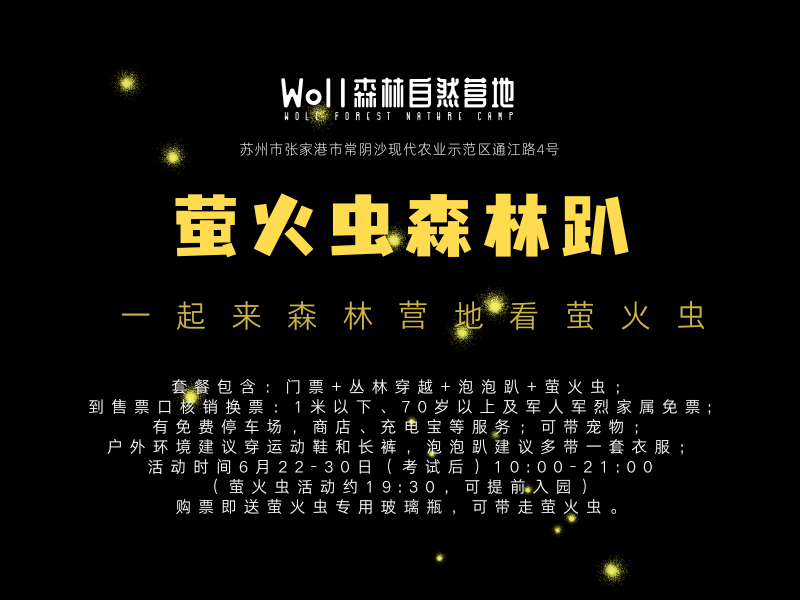 孩子志 | 萤火虫森林趴 【考试后 6/22-30】萤火虫放飞、丛林穿越、泡泡趴,陪孩子来张家港森林营地看萤火虫(10:00-21:00)