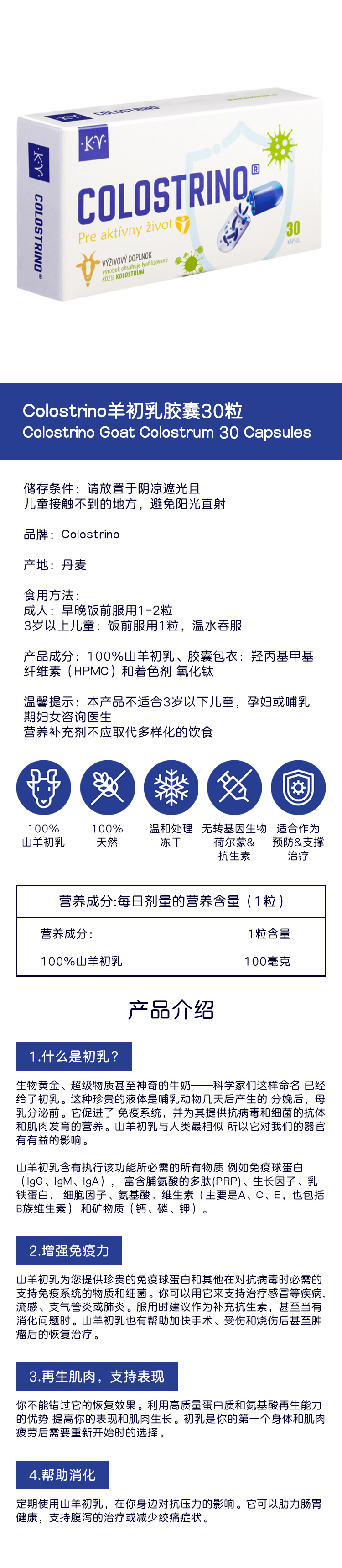 [丹麦]Colostrino羊初乳胶囊30粒. Colostrino Goat Colostrum 30 Capsules.