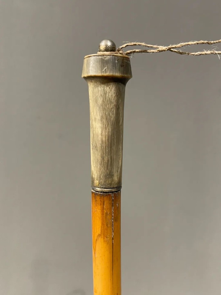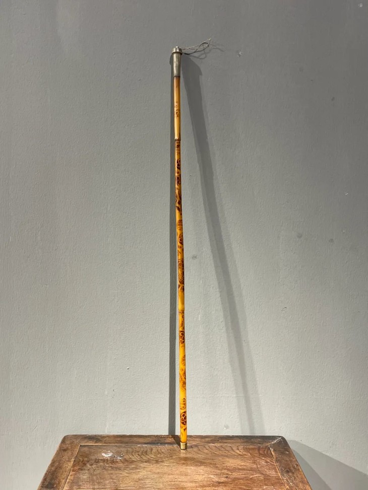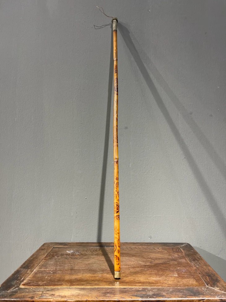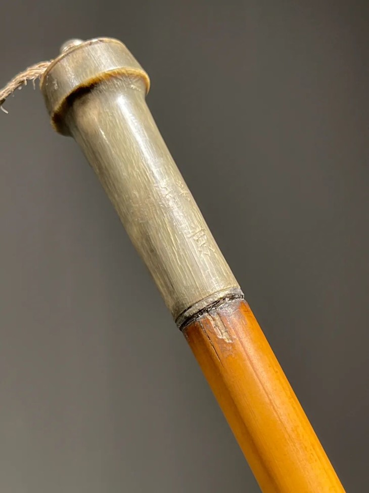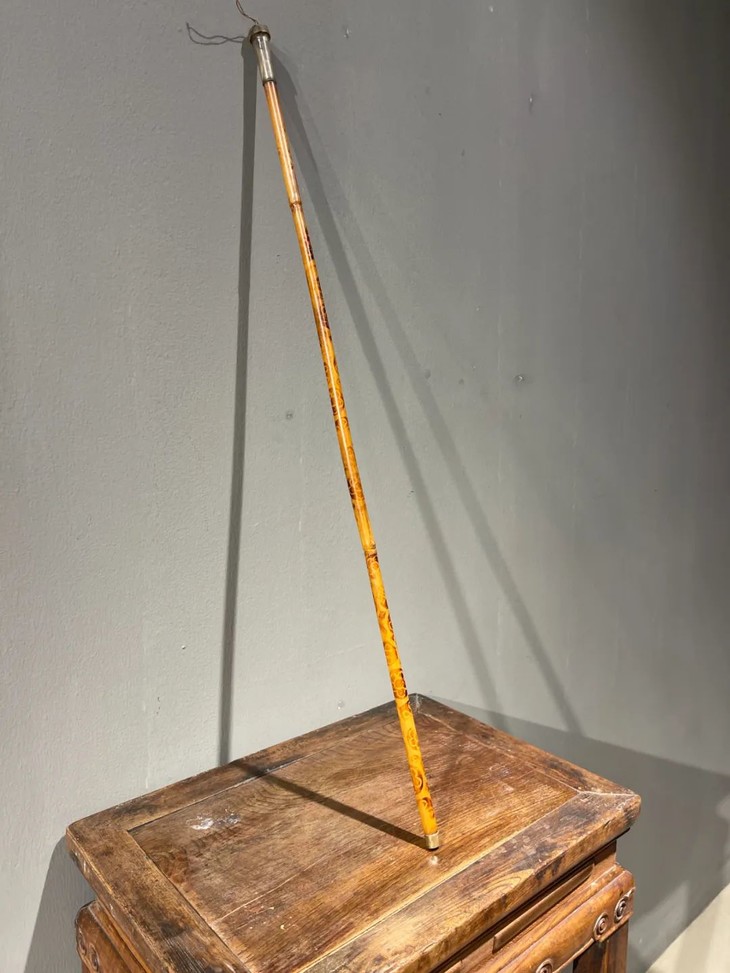 教杆由古至今都是不可或缺的教学工具,此老教杆取材高贵孟宗竹精心制作成简约大气的造型,整体设计微妙精准,全然以手工细细琢磨与烙出纹饰,牛角柄上刻字书法刚劲,非文人雅士不可为之,古代私塾之实用器具却如此讲究,令人耳目一新。