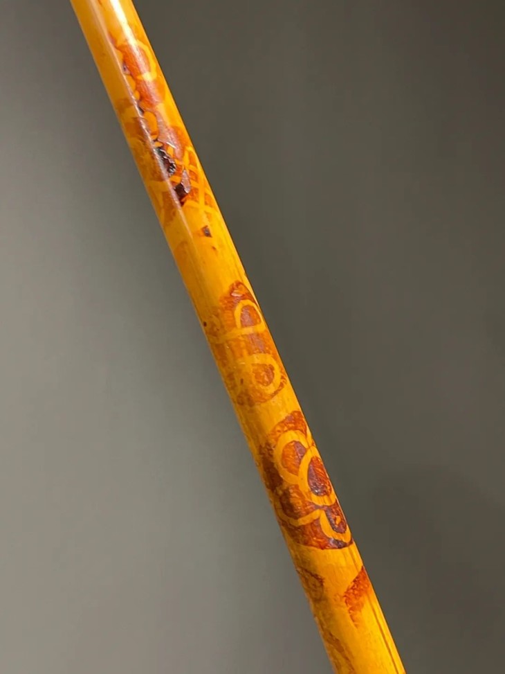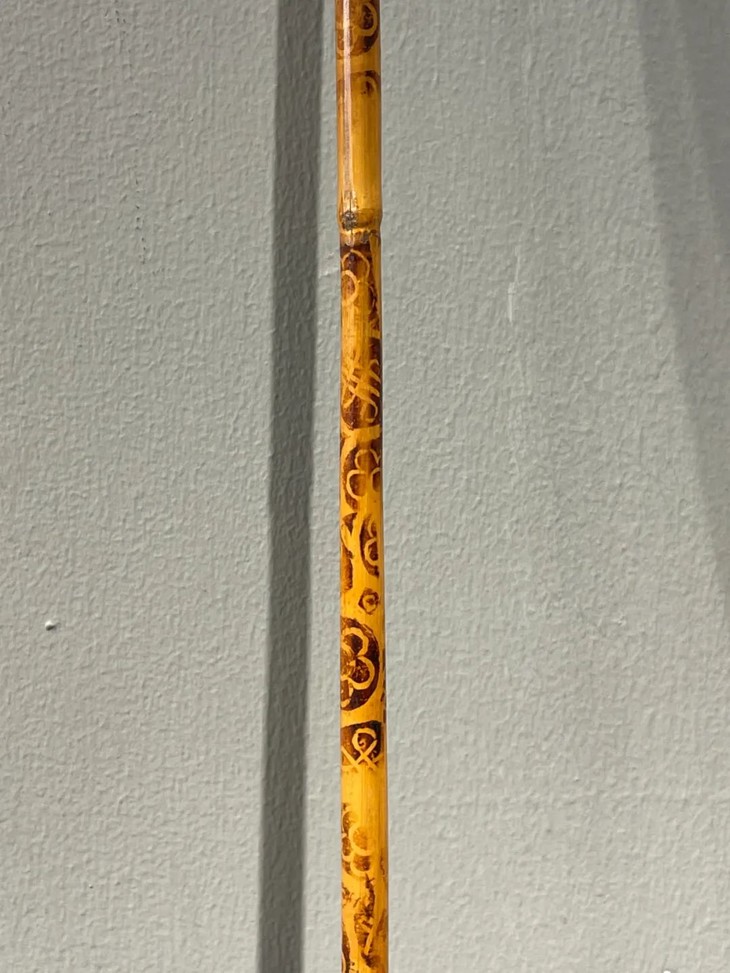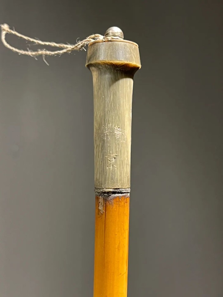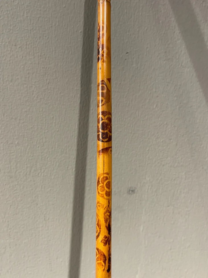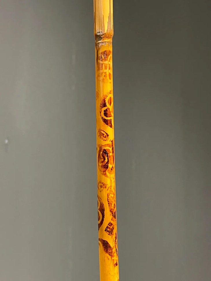 教杆由古至今都是不可或缺的教学工具,此老教杆取材高贵孟宗竹精心制作成简约大气的造型,整体设计微妙精准,全然以手工细细琢磨与烙出纹饰,牛角柄上刻字书法刚劲,非文人雅士不可为之,古代私塾之实用器具却如此讲究,令人耳目一新。