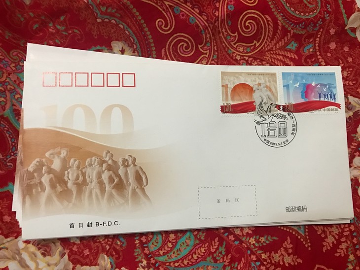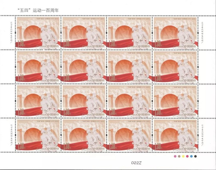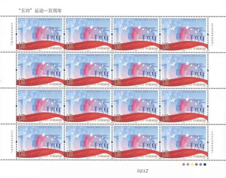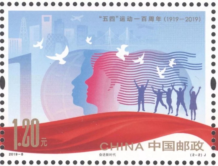 邮票第一图以天安门广场人民英雄纪念碑上“五四”运动浮雕和“五四”青年的典型形象,表现了发生在一百年前的这场伟大爱国革命运动的历史画面。邮票第二图以新时代青年的剪影和代表国家富强、经济发展、社会进步的形象元素,表现了青年一代昂扬向上,奋进新时代的风采,寓意“新时代青年要乘新时代春风,在祖国的万里长空放飞青春梦想”。两枚邮票画面上的数字100创意造型和红色的飘带烘托出纪念“五四”运动一百周年的浓厚氛围与传承“五四”精神的庄严性和崇高性。