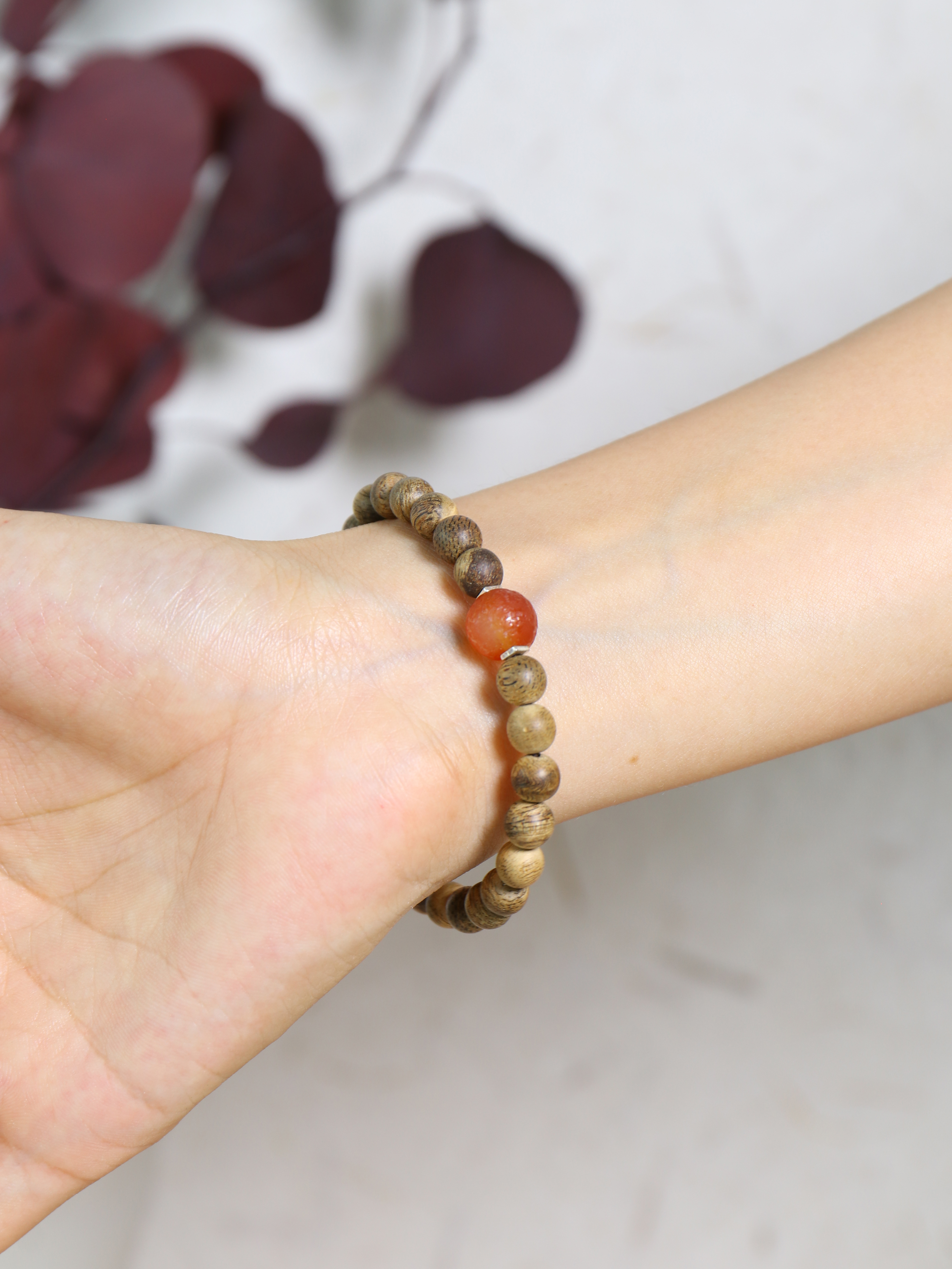 · 中心使用一颗复古红玛瑙,表面肌理斑驳,色泽浓烈温润