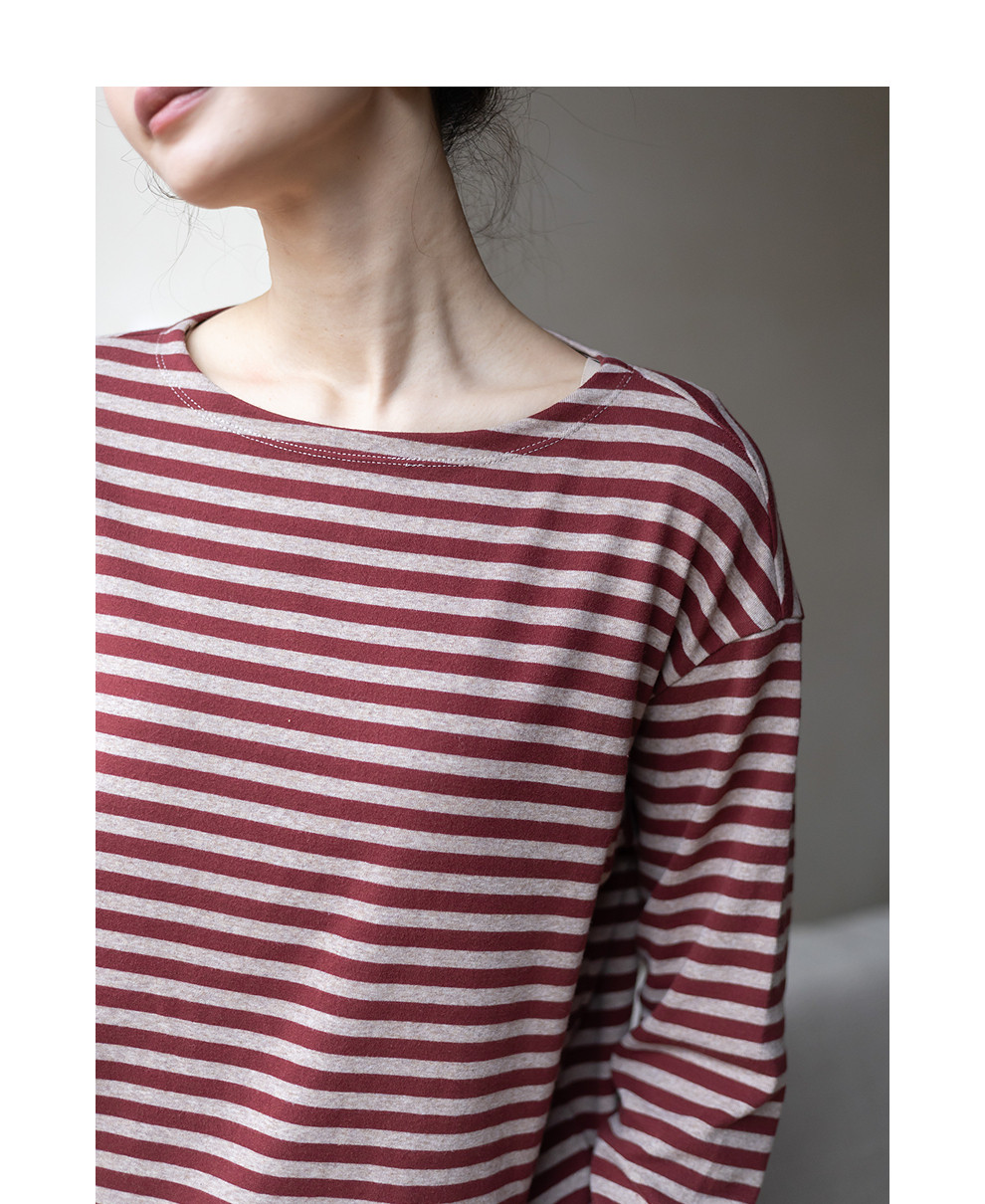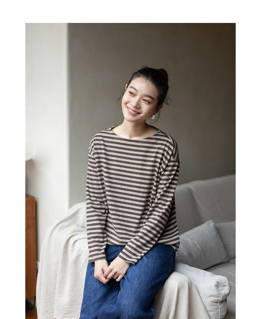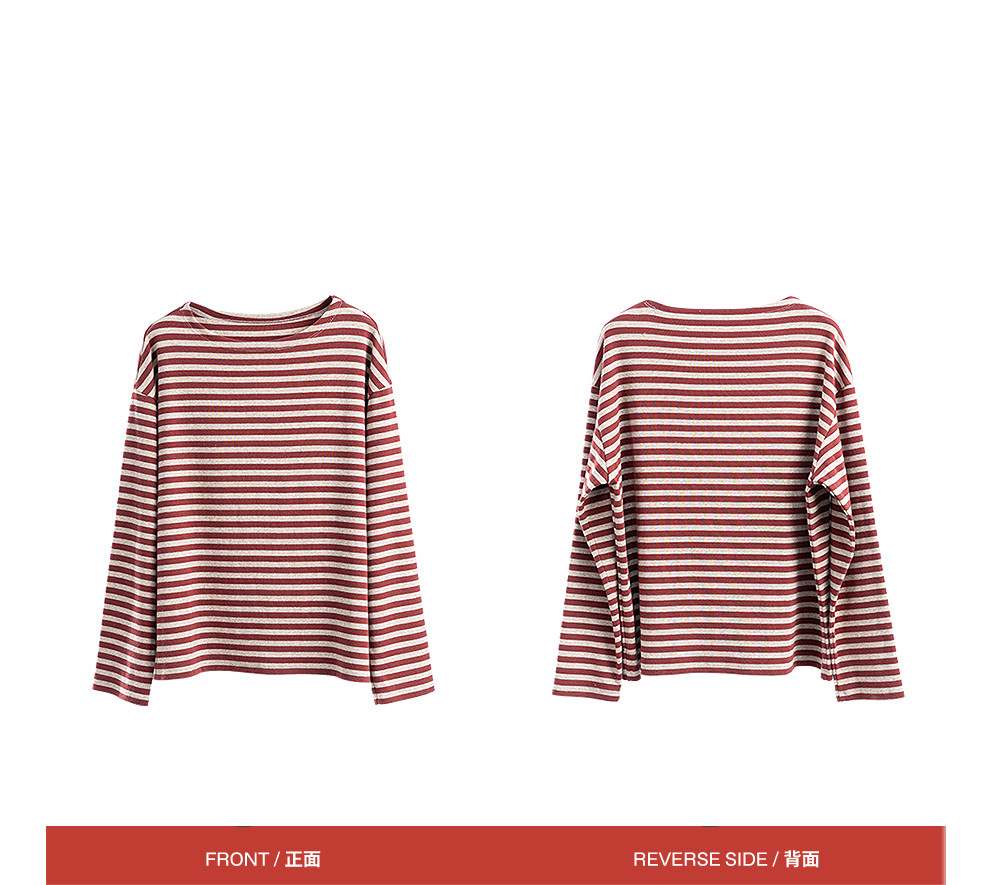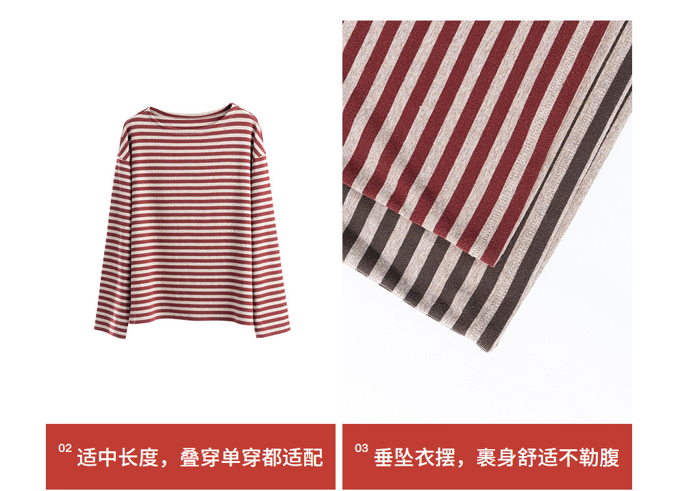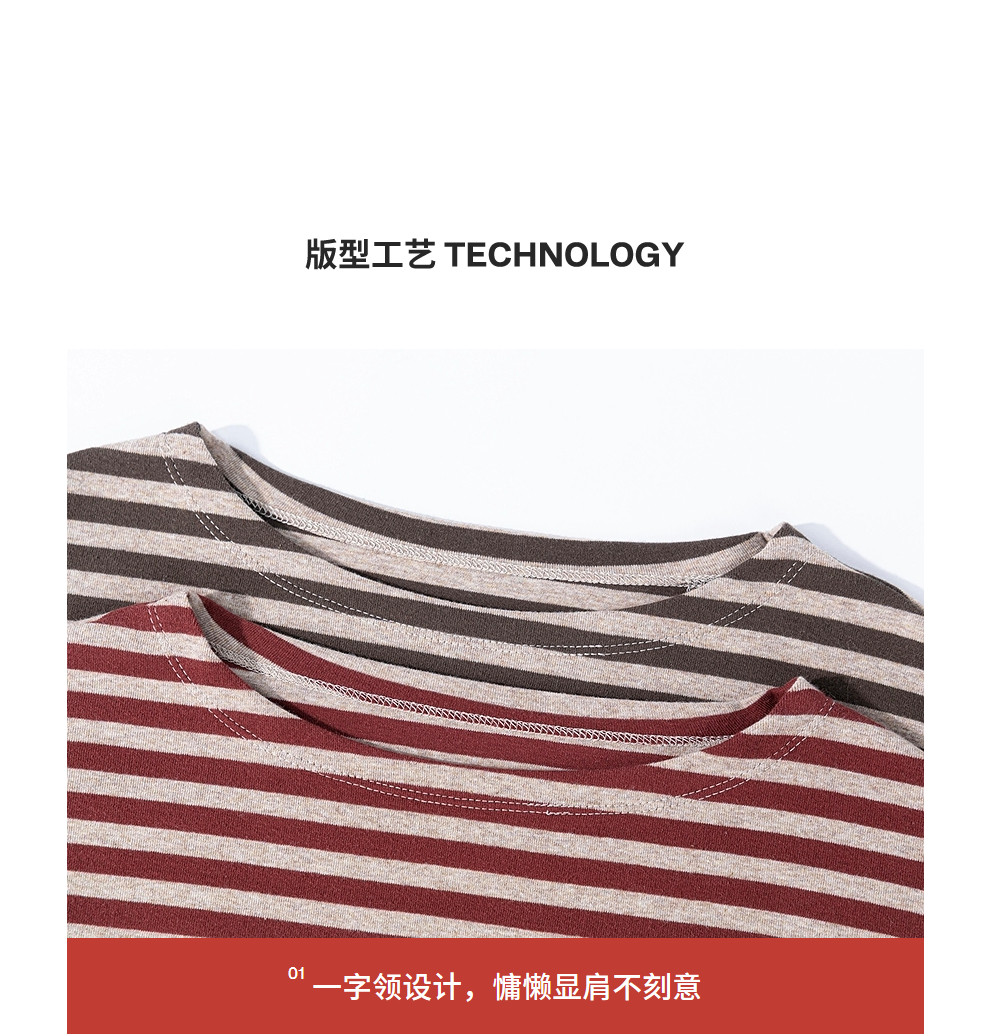 特绽放064朵/如一·棉混氨针织撞色条纹长袖T恤一字领百搭打底衫