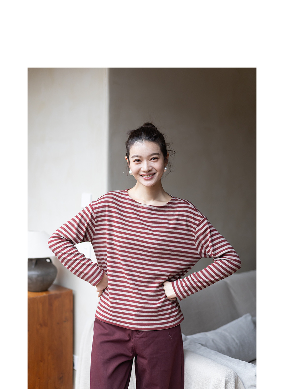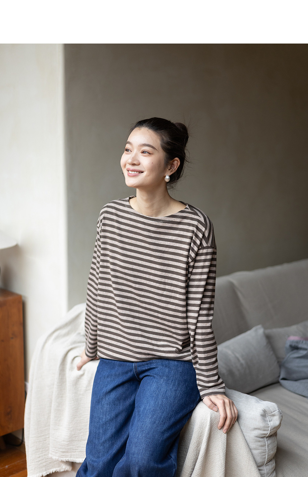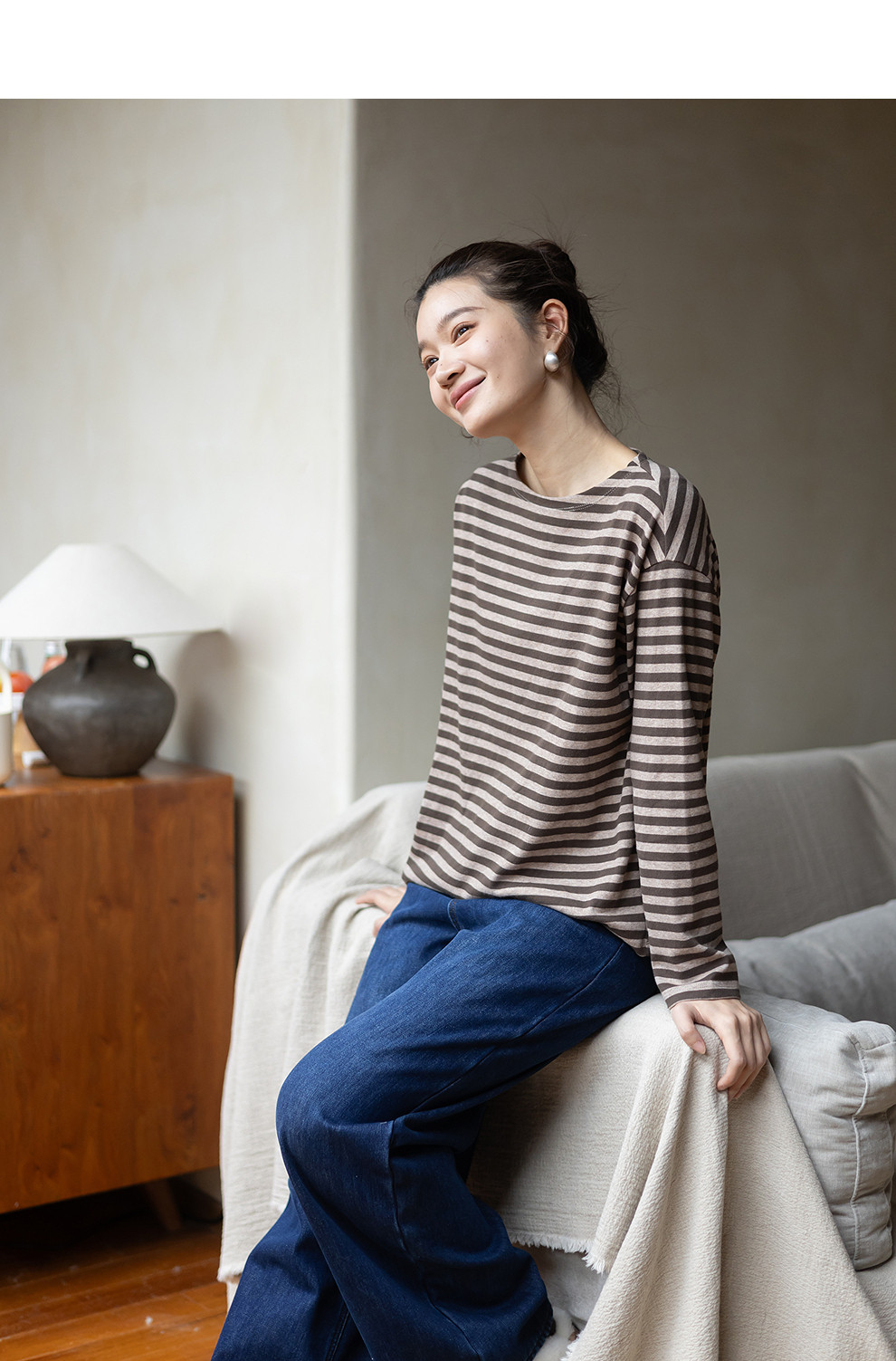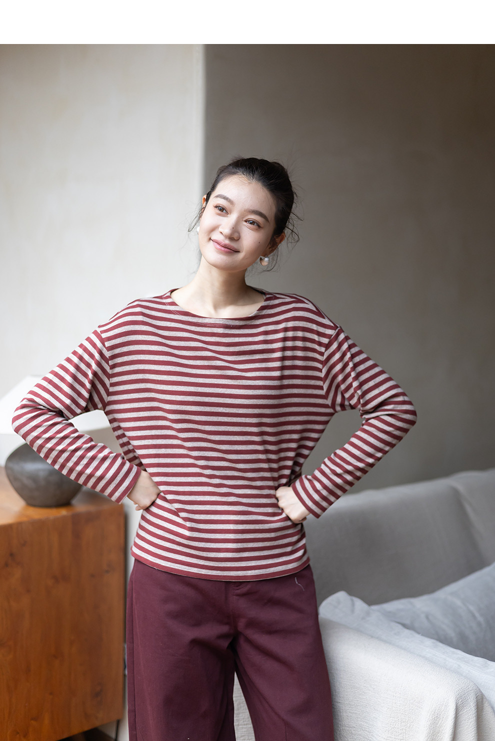 特绽放064朵/如一·棉混氨针织撞色条纹长袖T恤一字领百搭打底衫