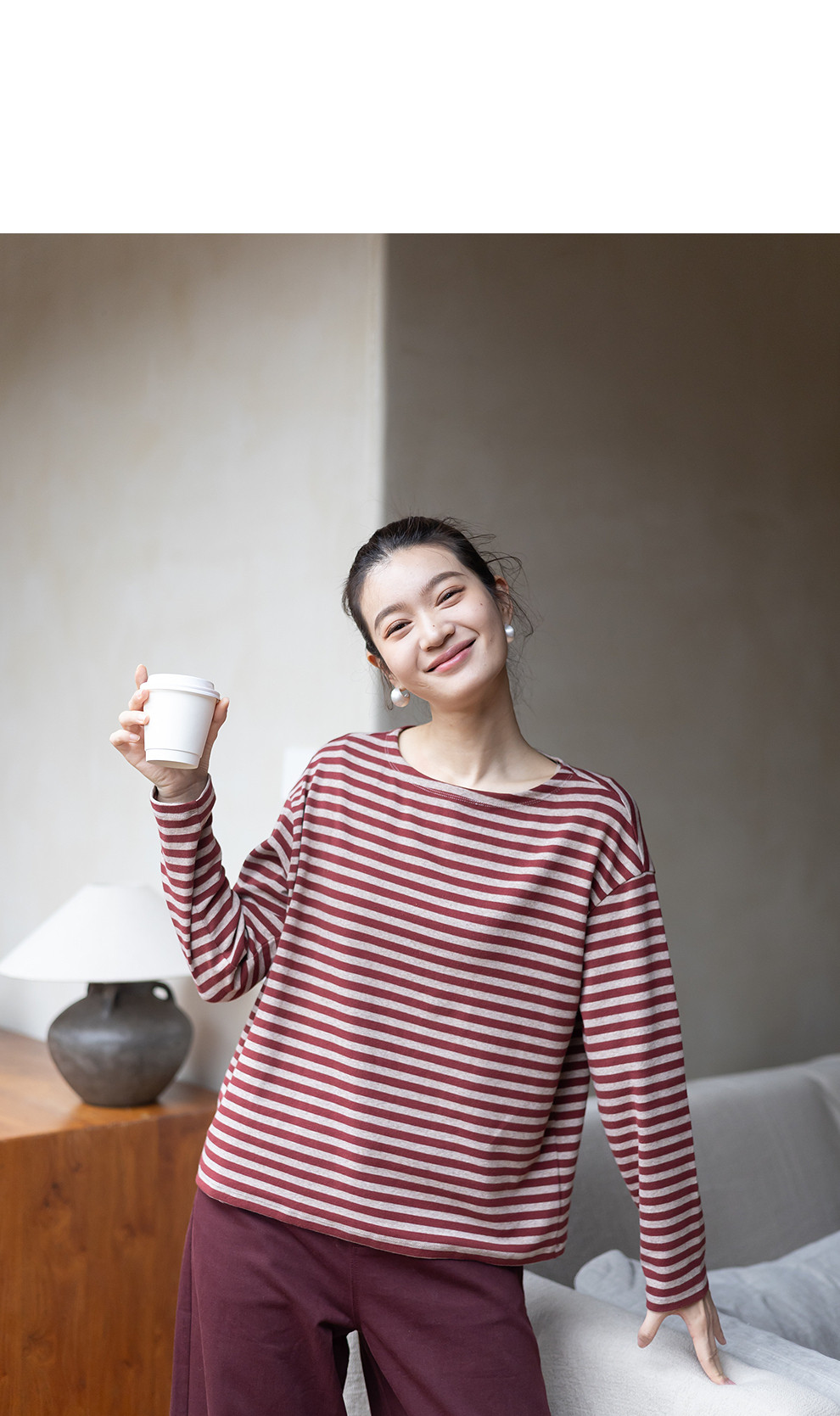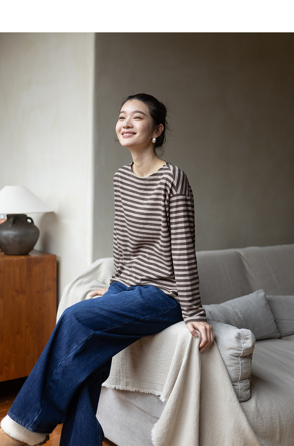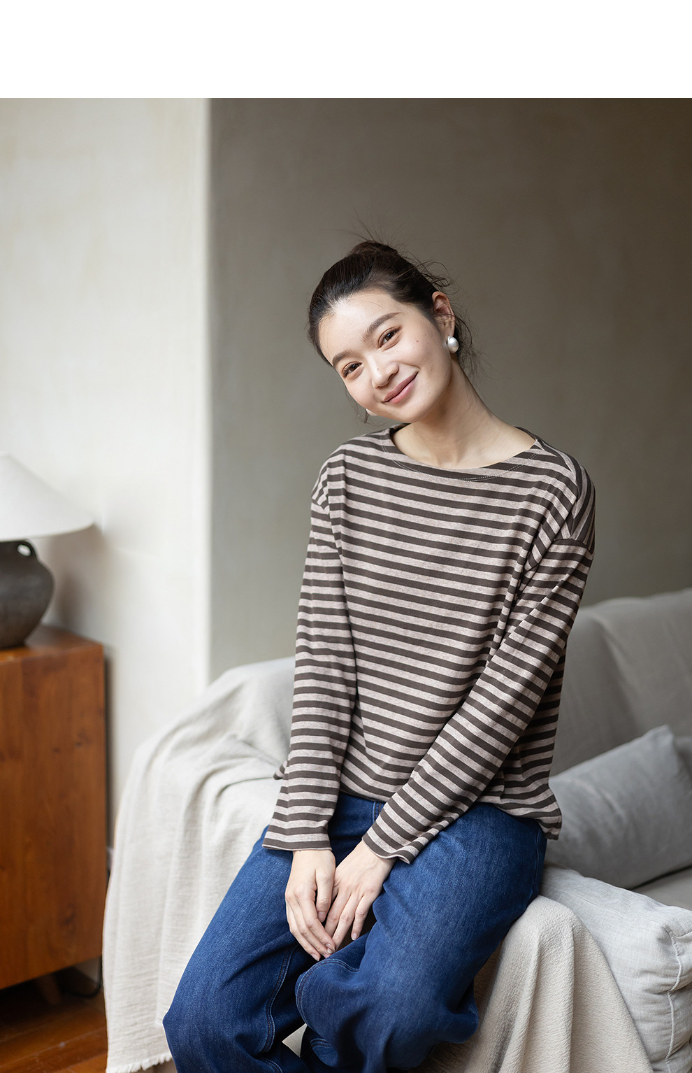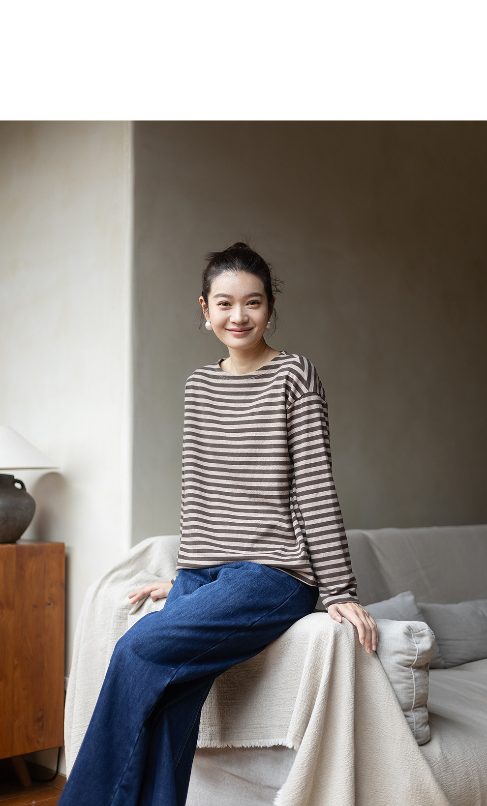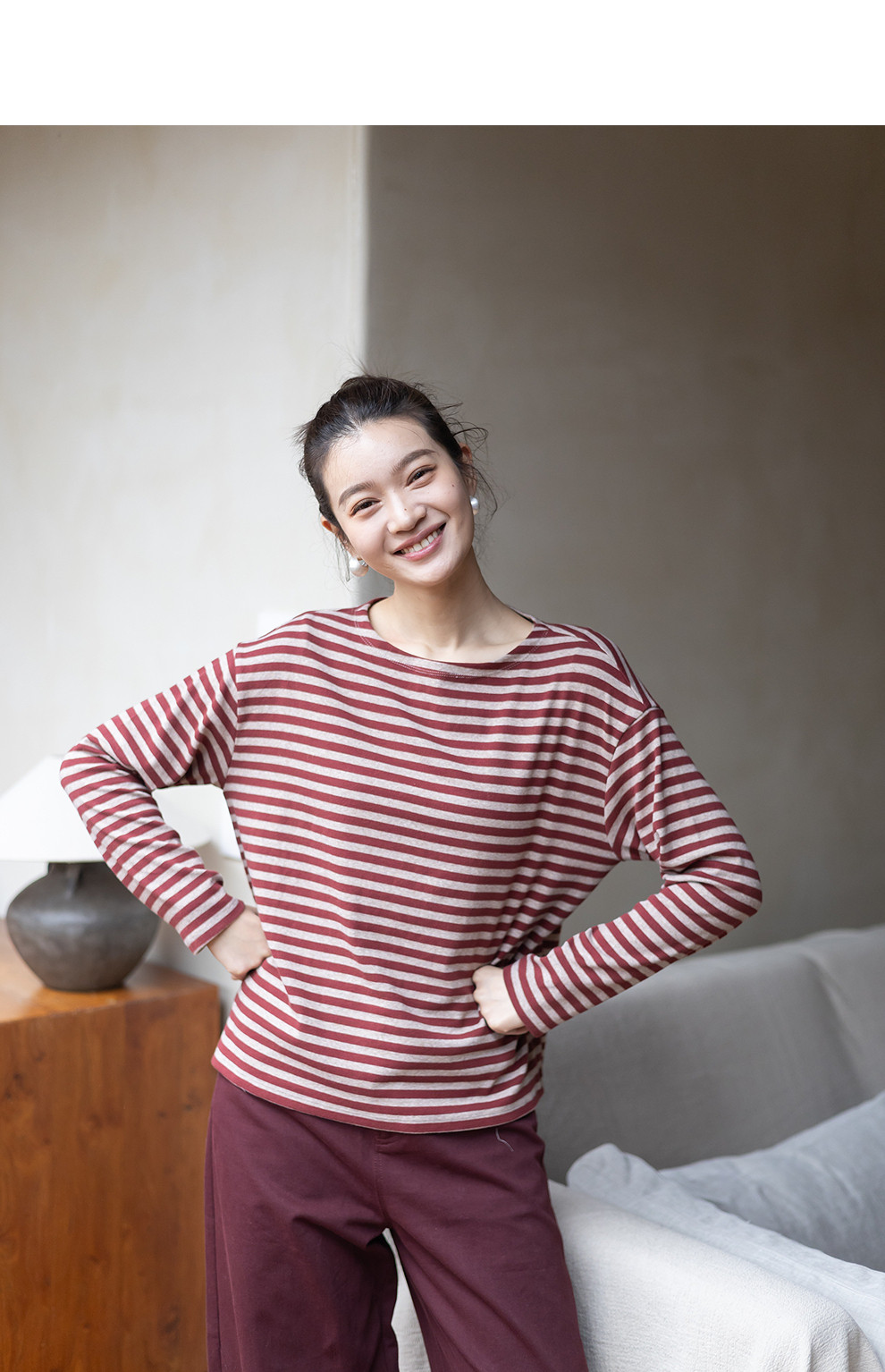 特绽放064朵/如一·棉混氨针织撞色条纹长袖T恤一字领百搭打底衫