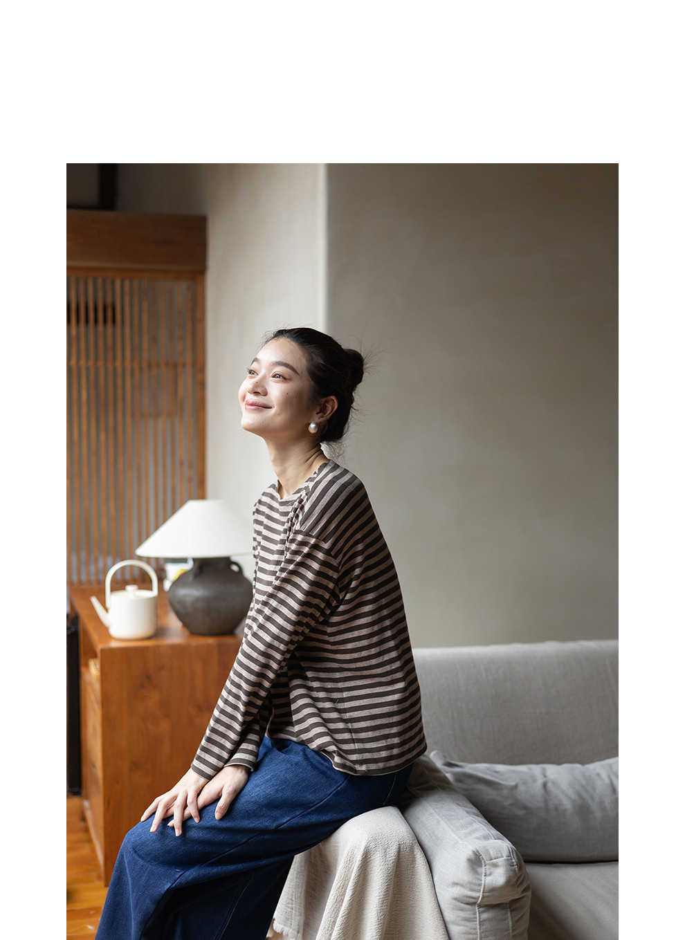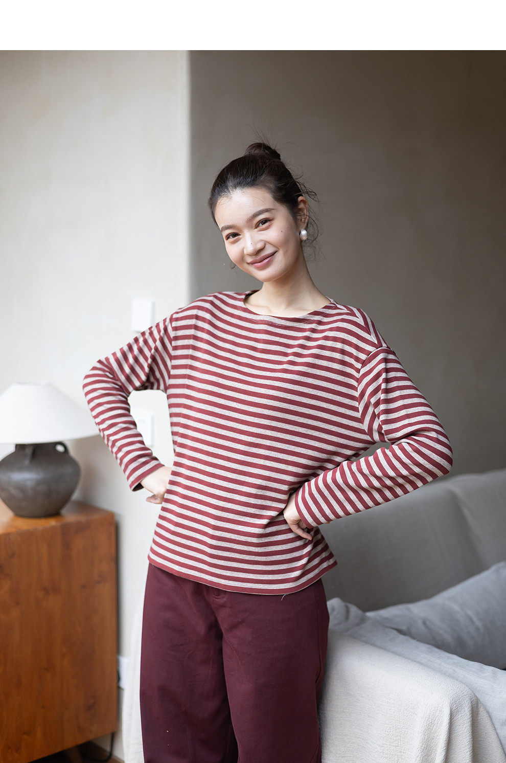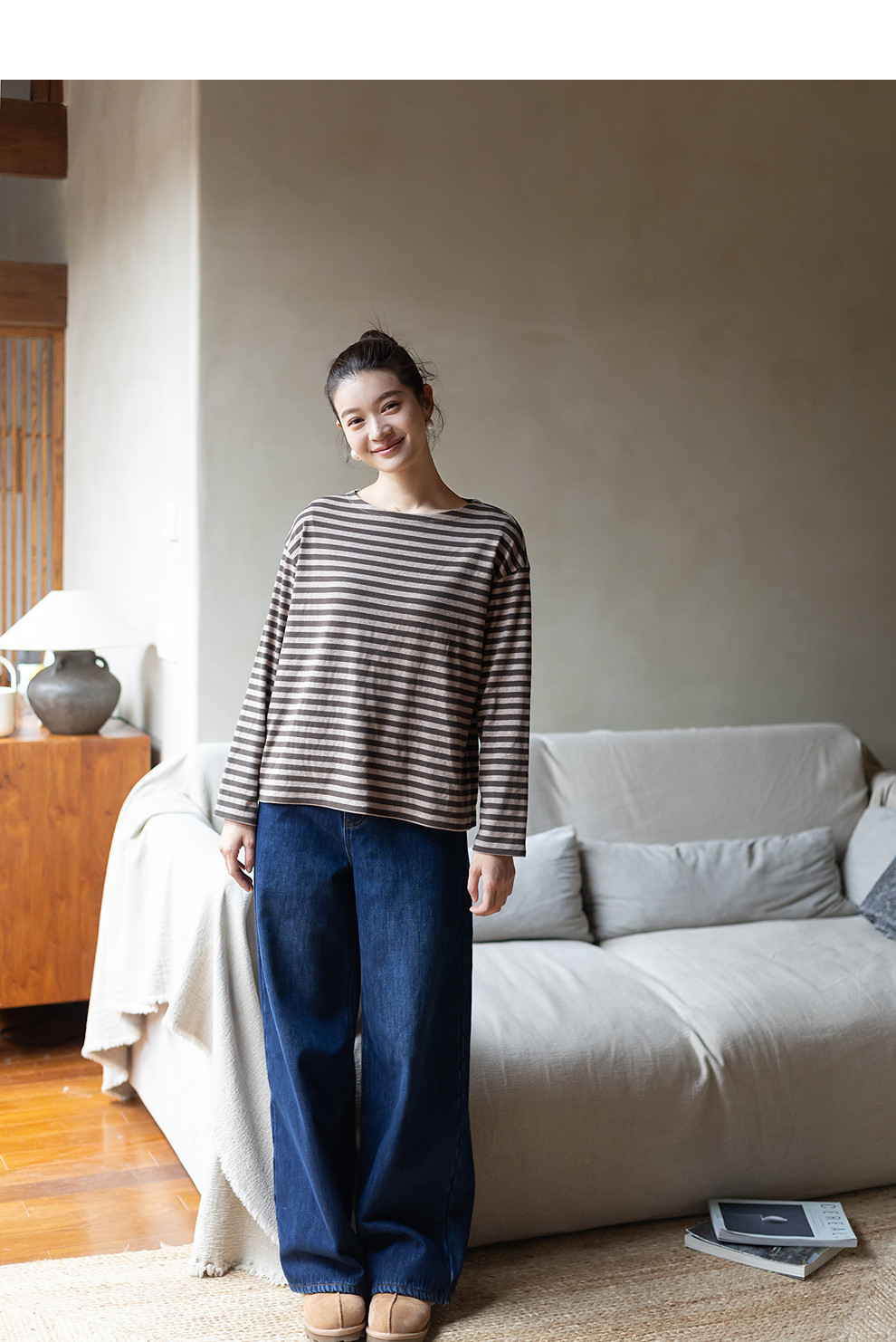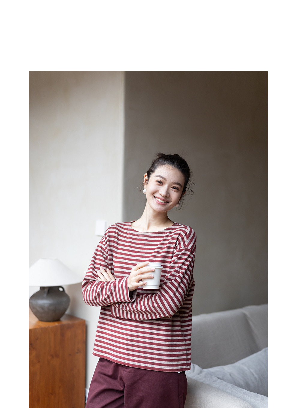 特绽放064朵/如一·棉混氨针织撞色条纹长袖T恤一字领百搭打底衫