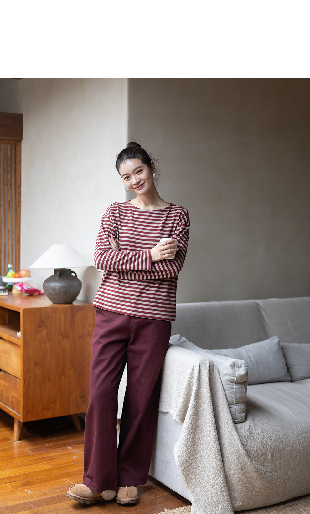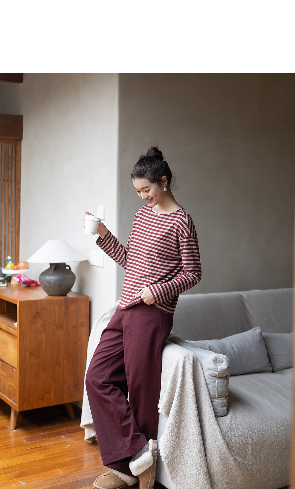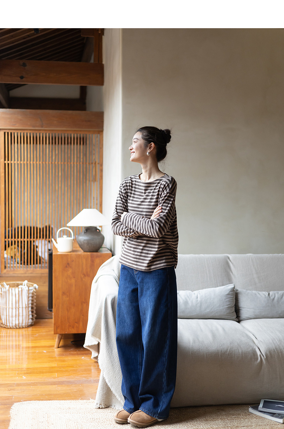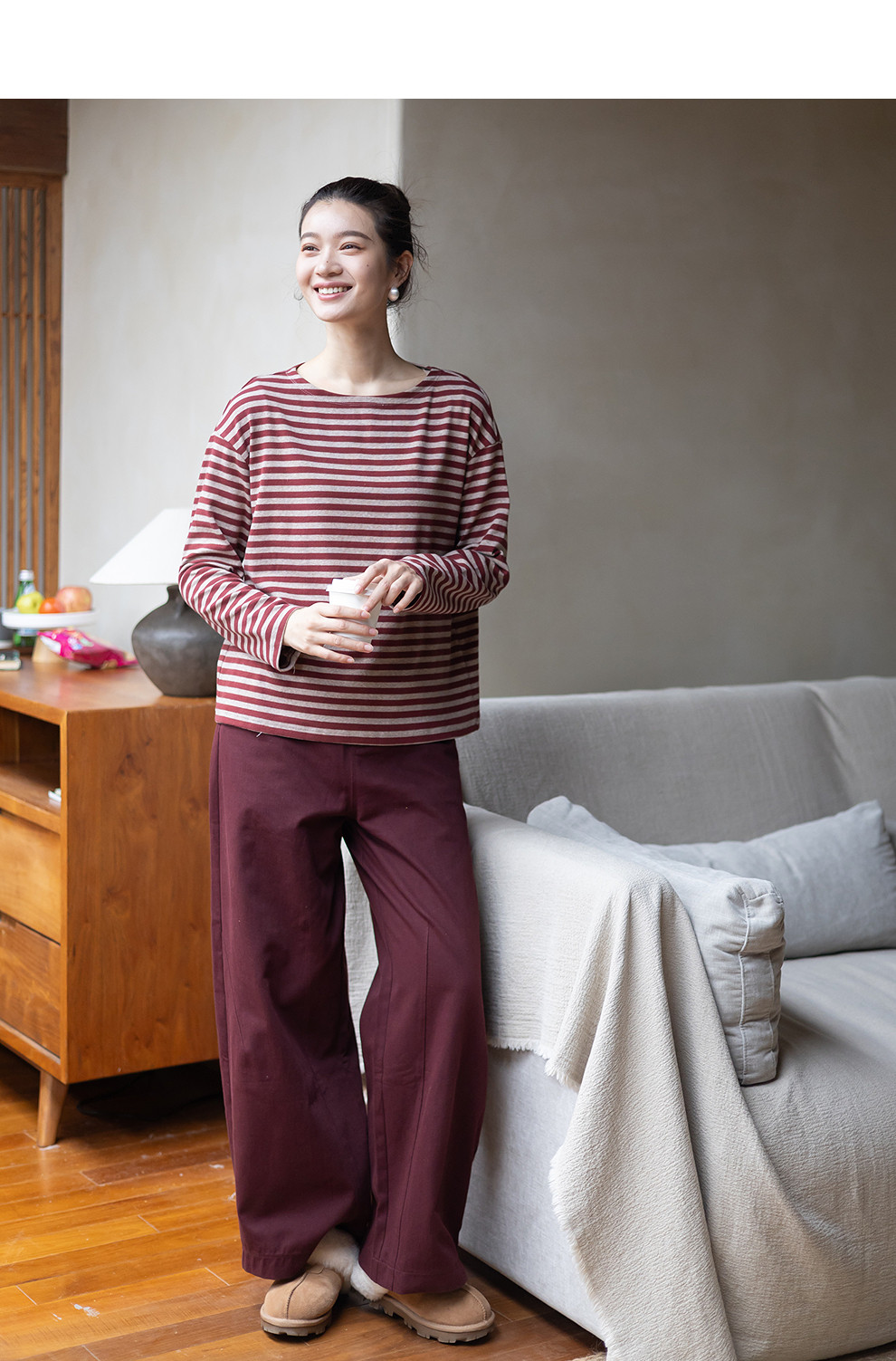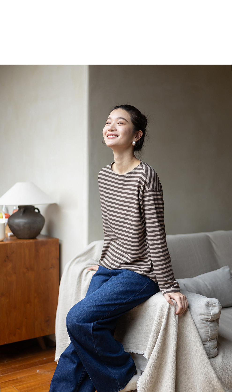 特绽放064朵/如一·棉混氨针织撞色条纹长袖T恤一字领百搭打底衫