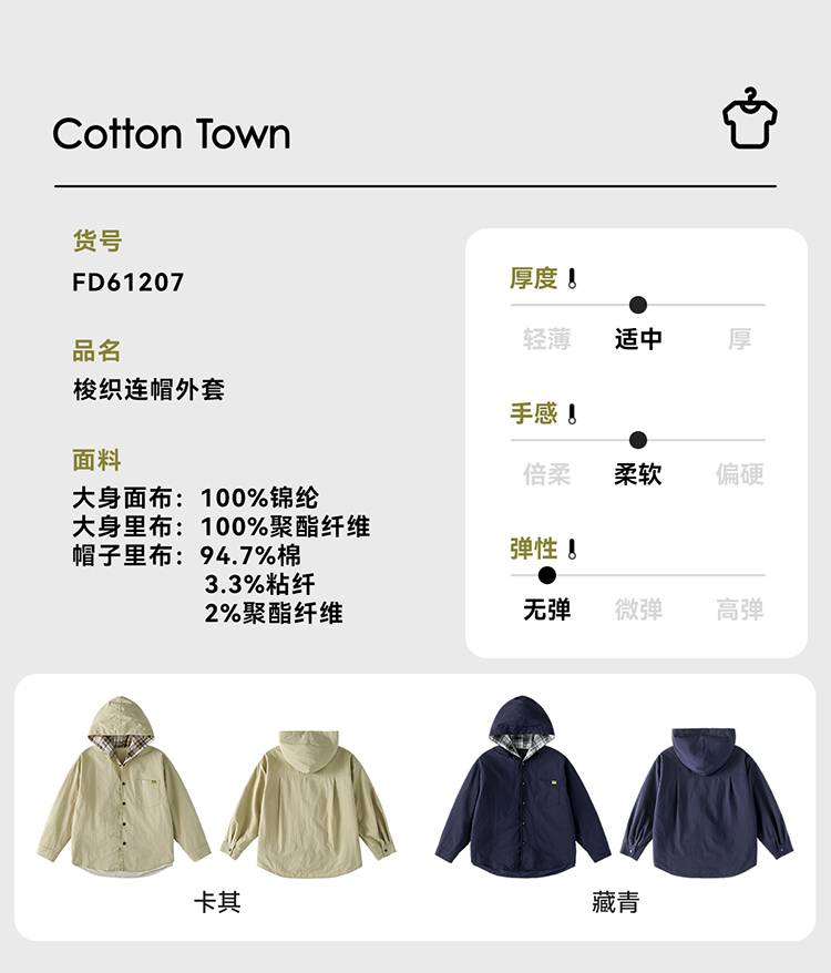 【梭织连帽外套】棉花堂梭织连帽外套 微皱肌理梭织面料 柔软亲肤 挺阔有型 FD61207