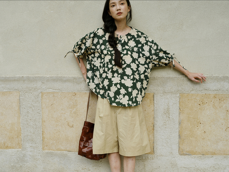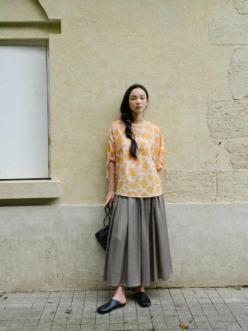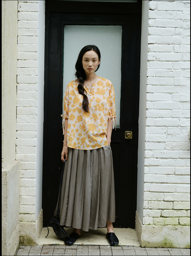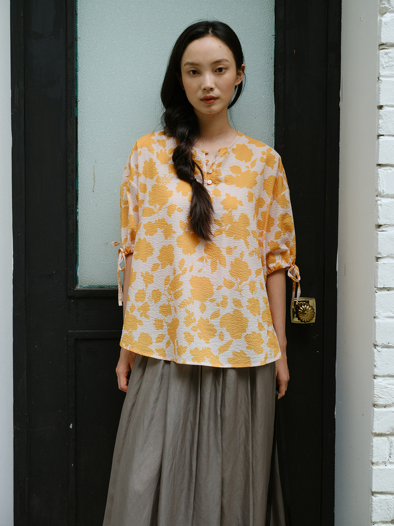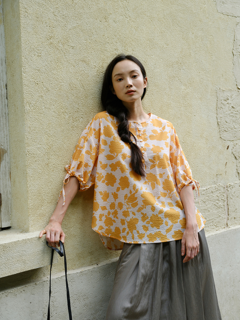 [特价] 梧桐花柄 轻薄盐缩泡泡纱 油画感印花宽松系带袖衬衫 100%棉 橙黄白/墨绿白