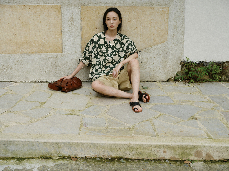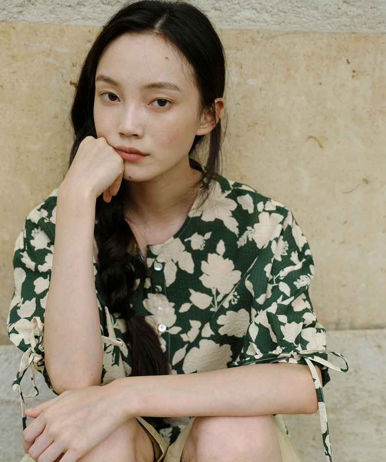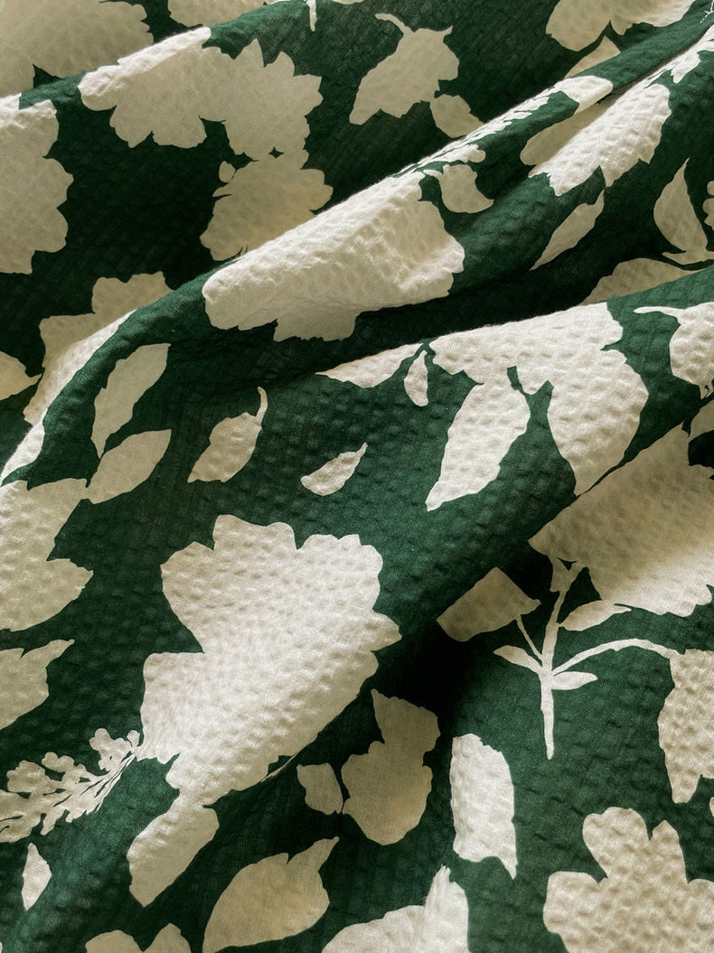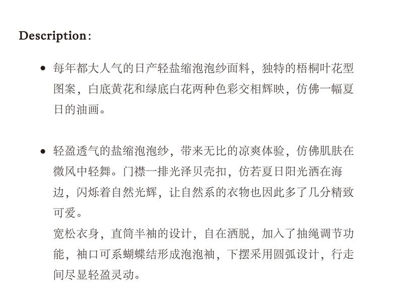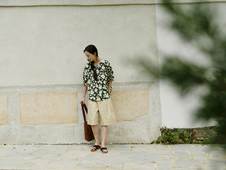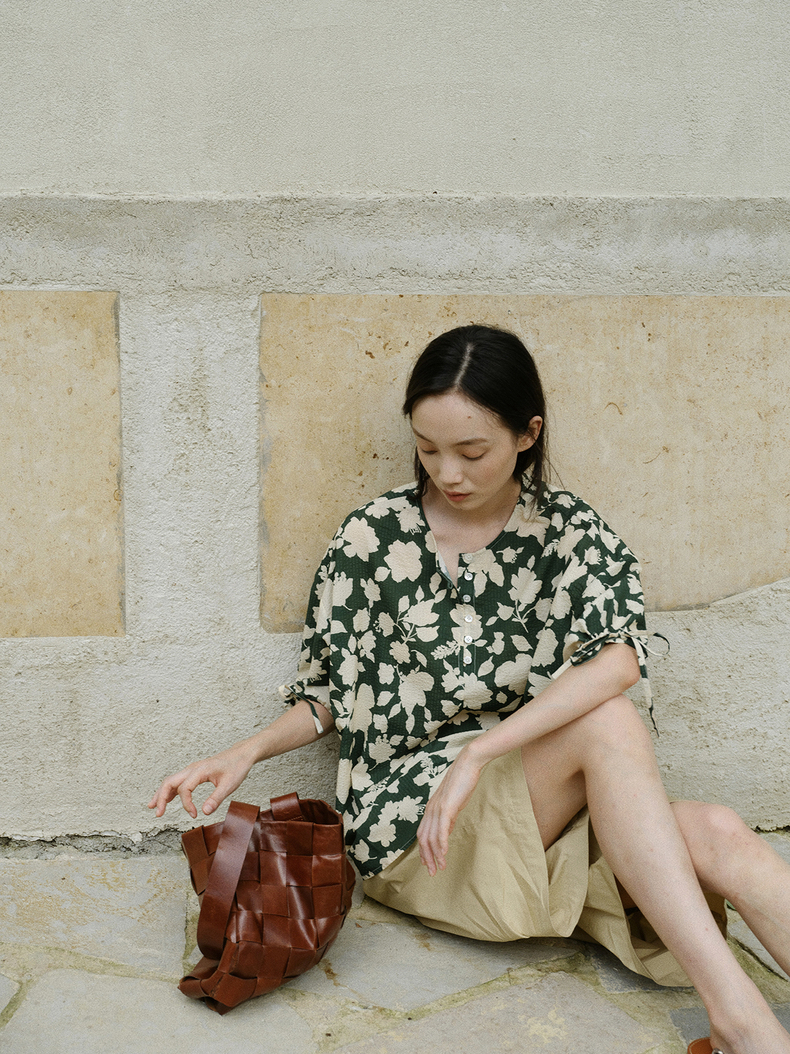 [特价] 梧桐花柄 轻薄盐缩泡泡纱 油画感印花宽松系带袖衬衫 100%棉 橙黄白/墨绿白