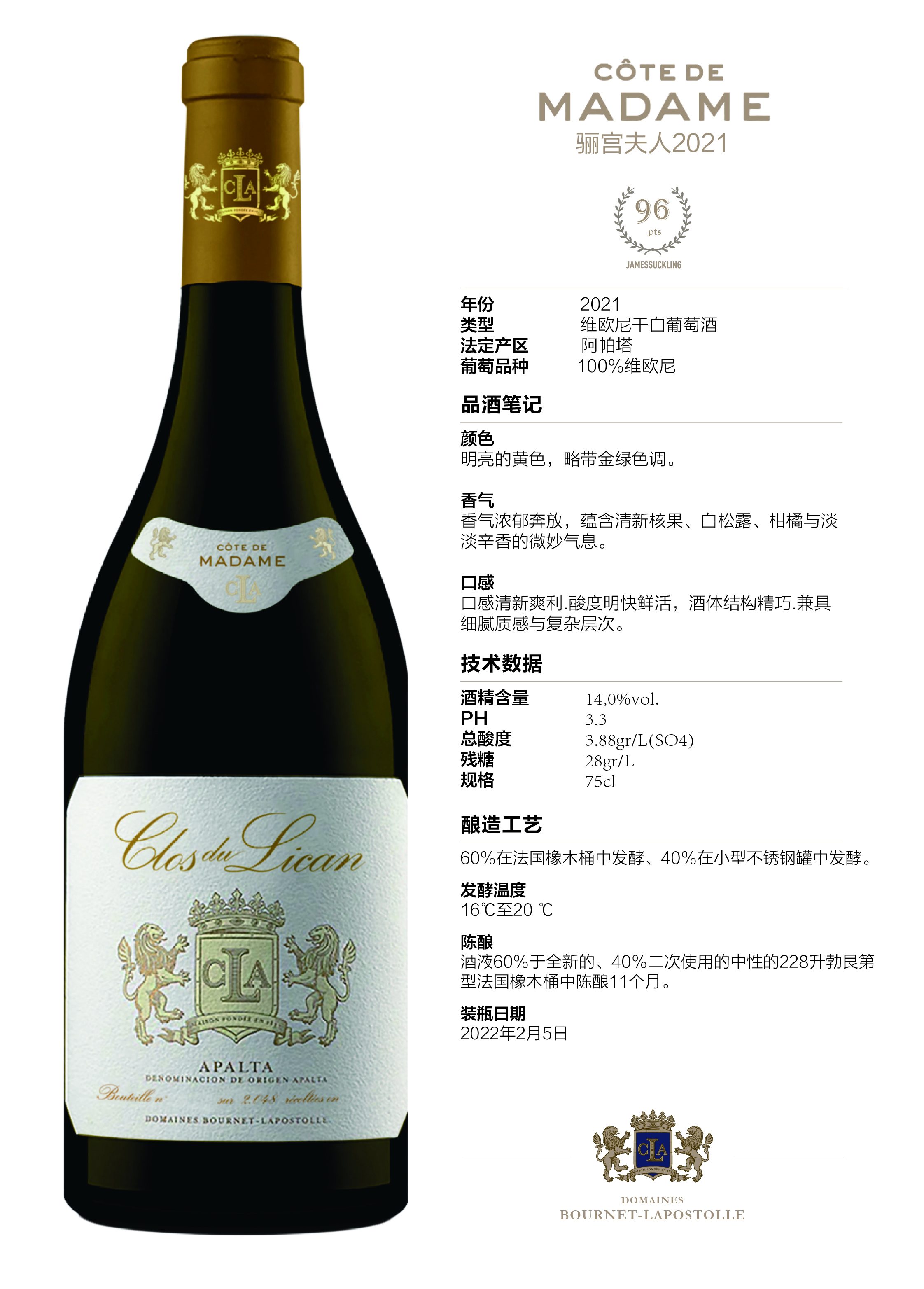 智利蓝宝堂骊宫夫人白葡萄酒2021COTE DE MADAME