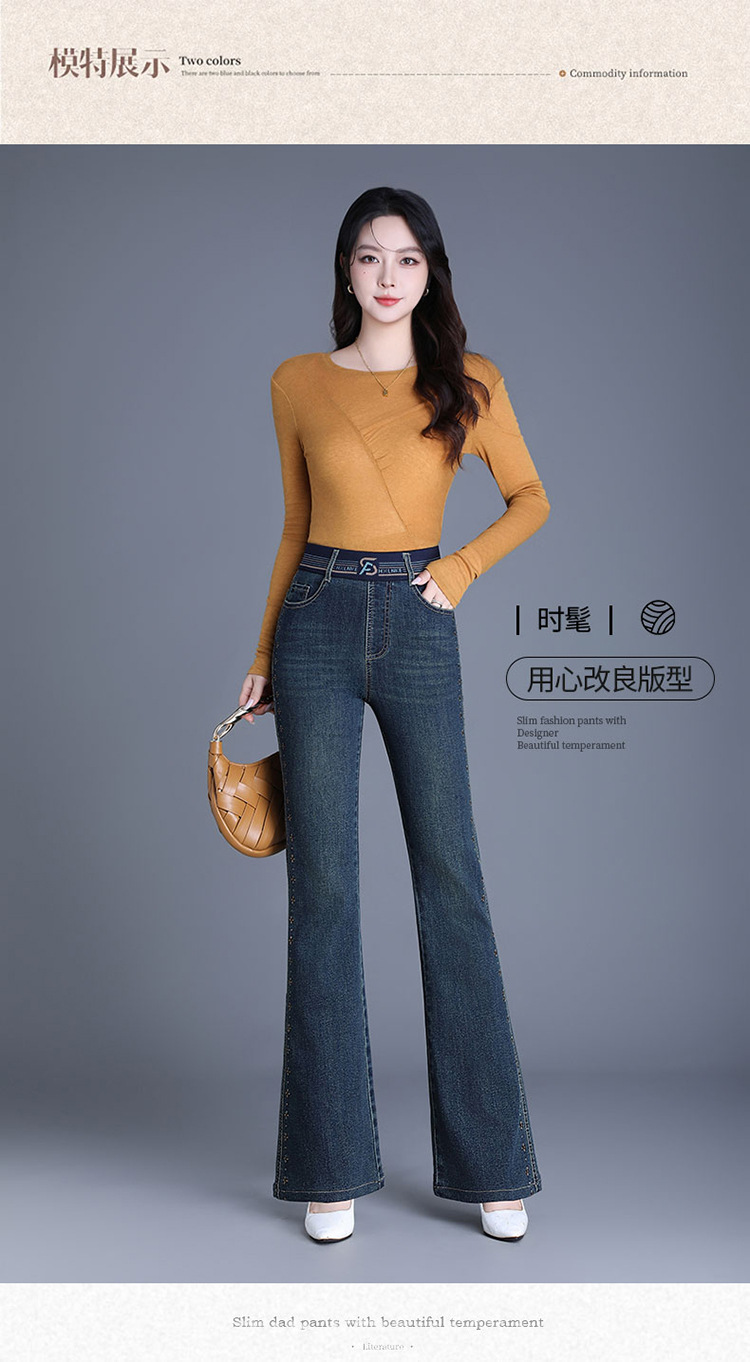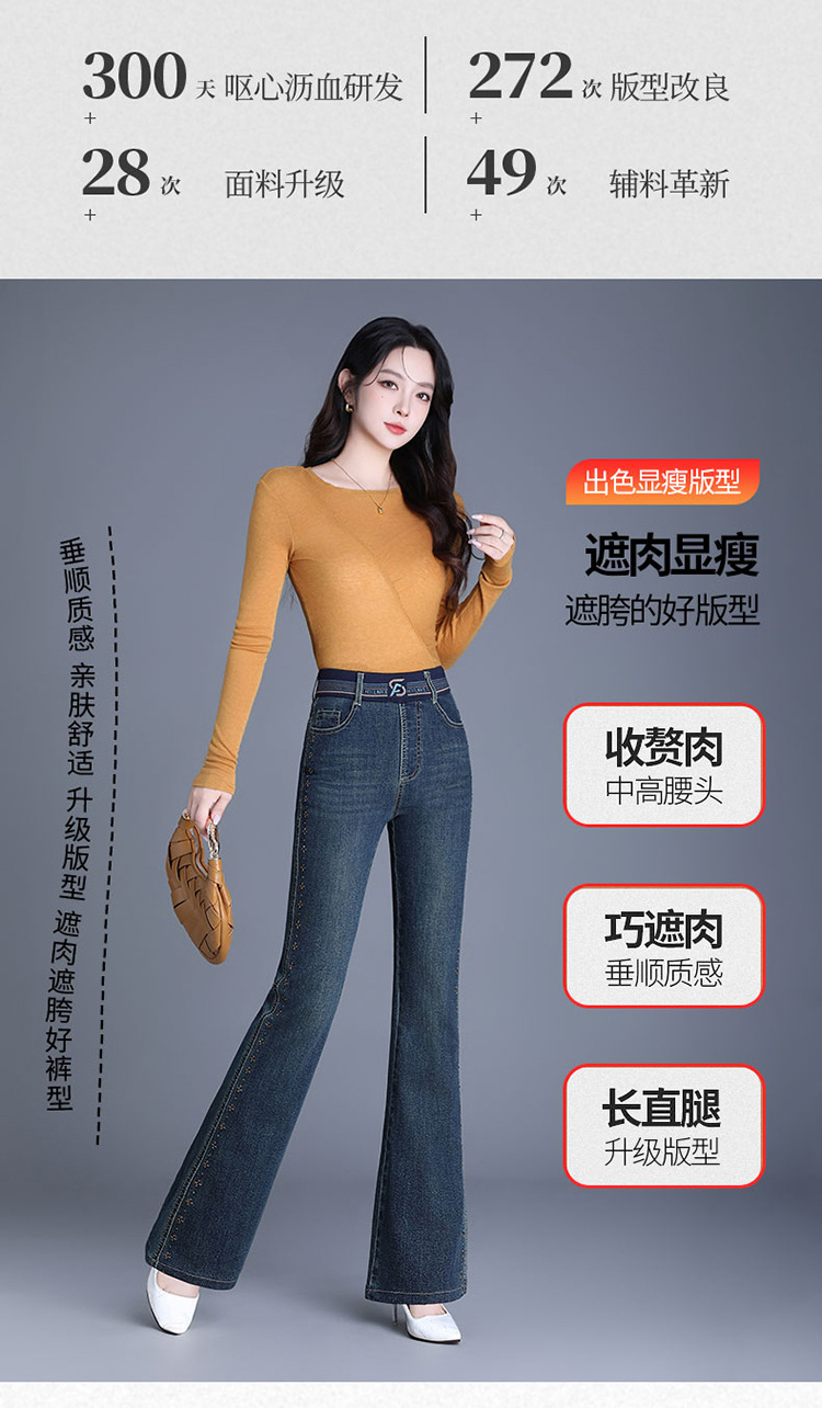 QYM 9855-Y弹力高腰刺绣花牛仔裤微喇裤宽松休闲裤 商品图1